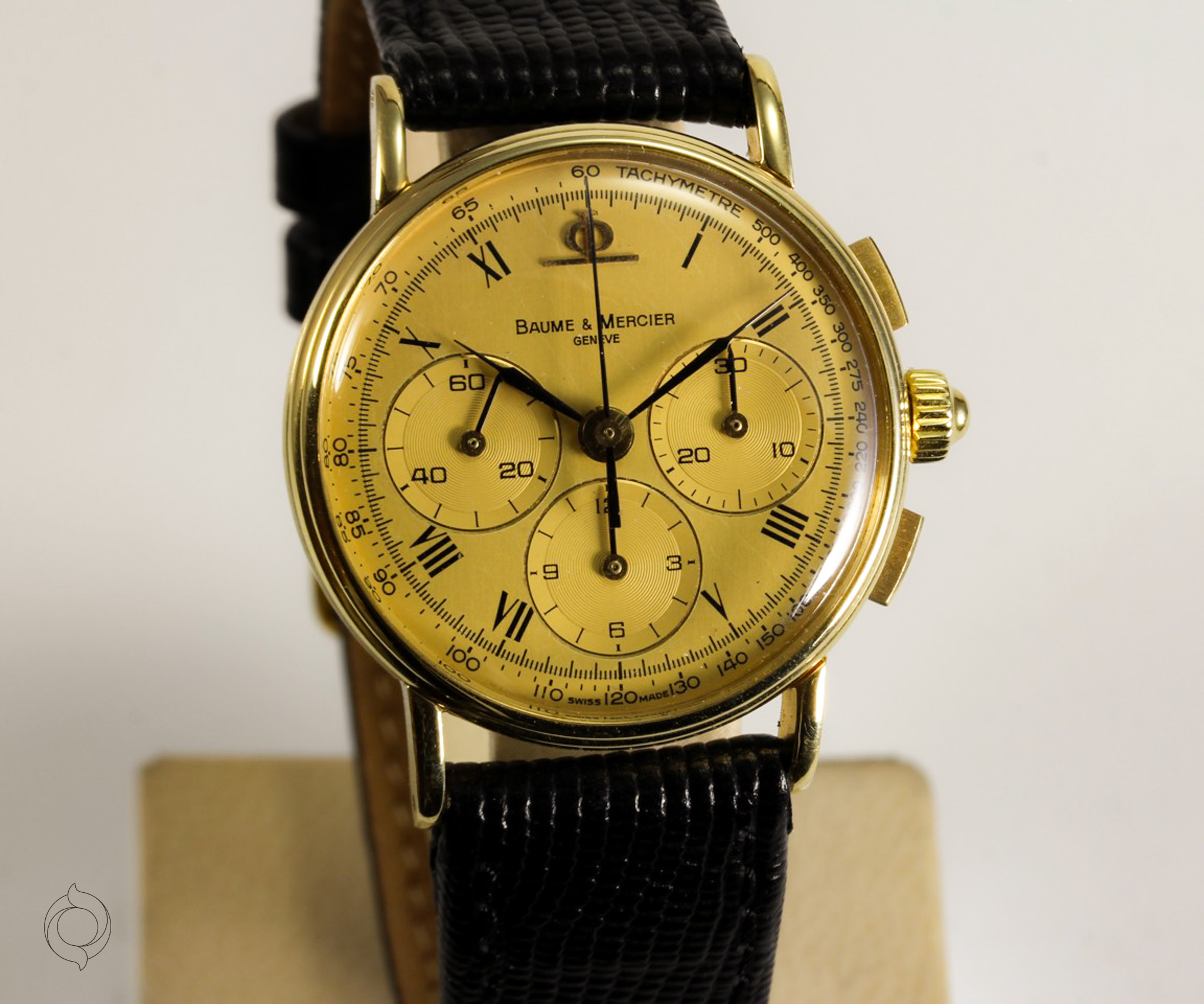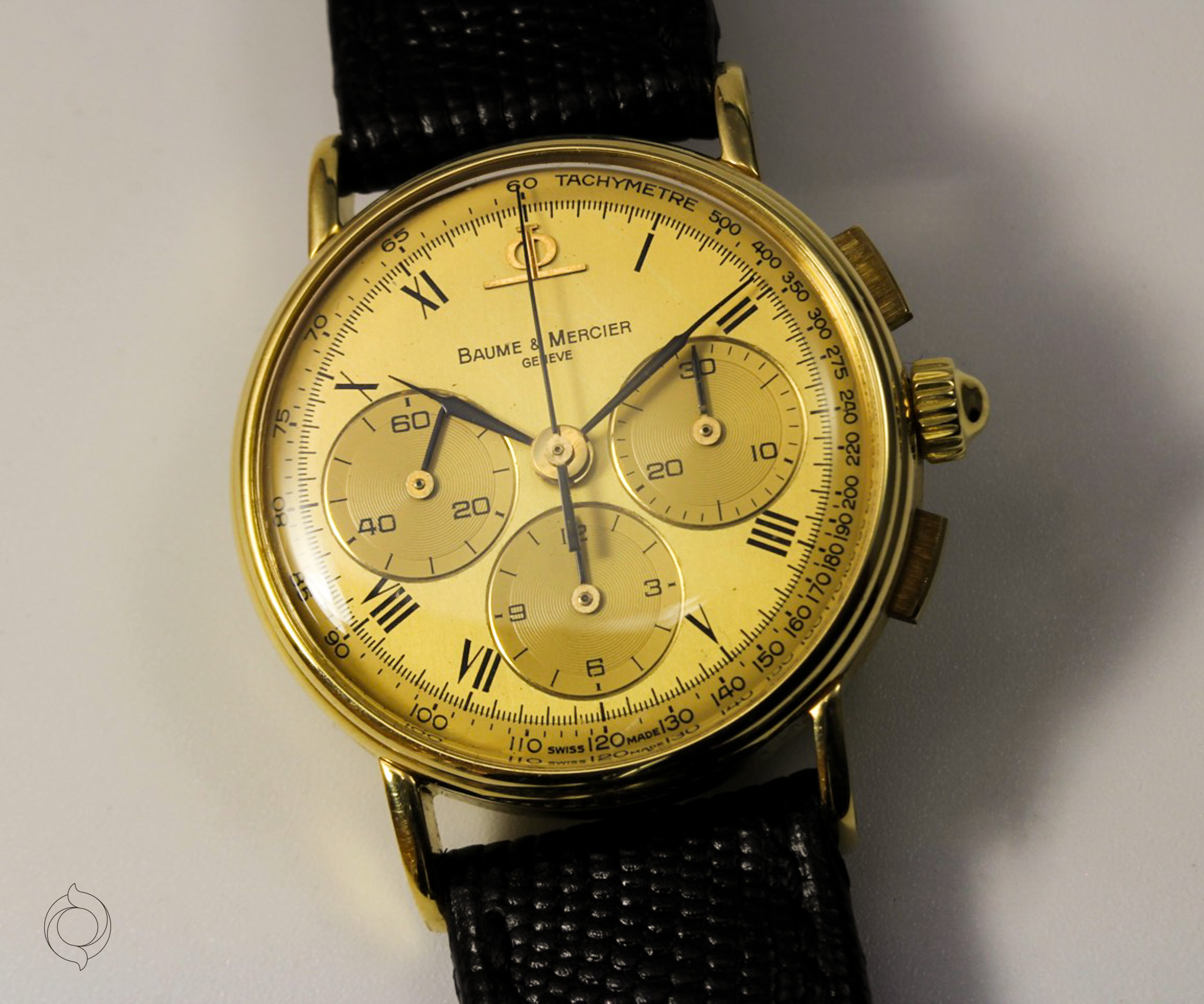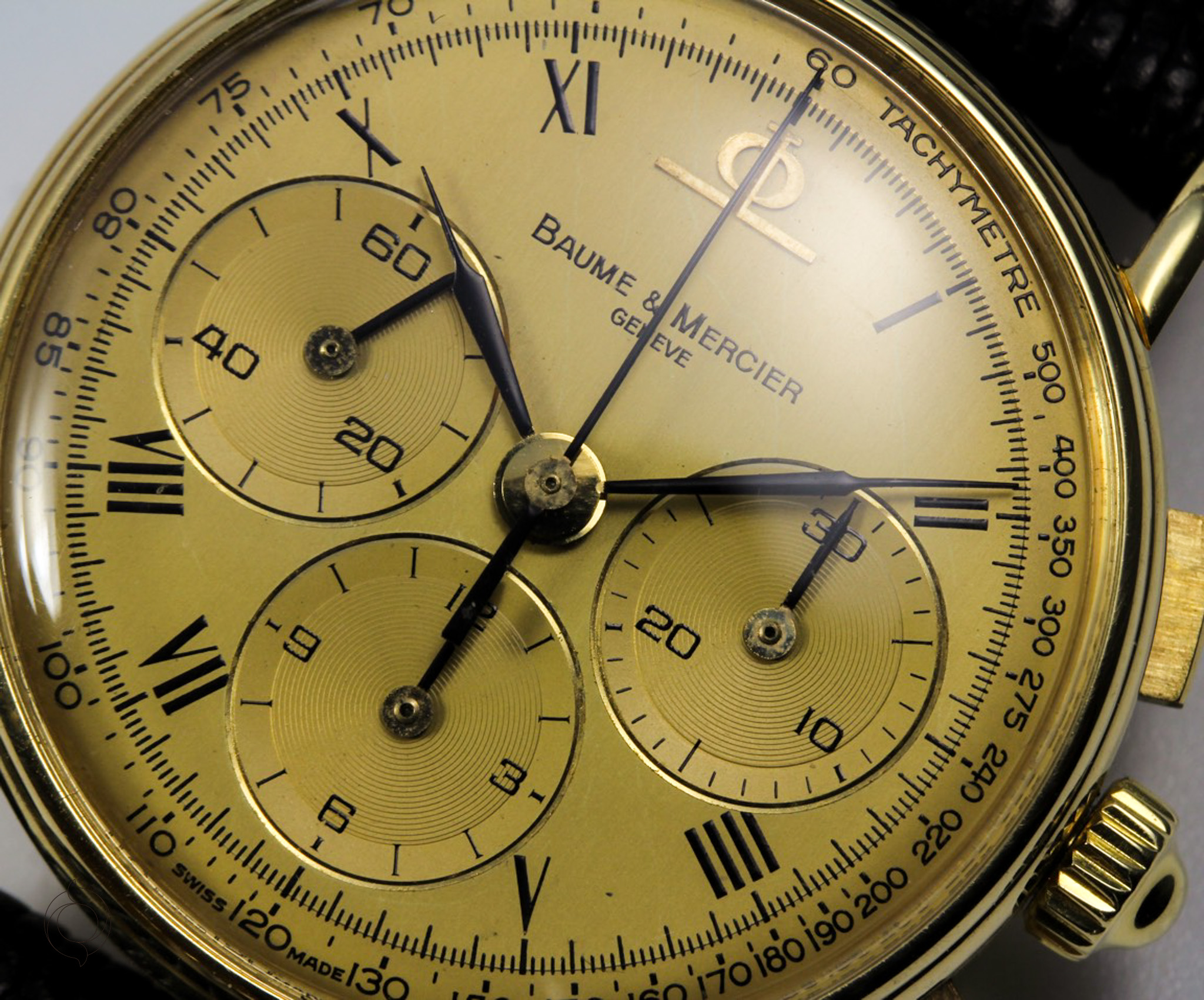 Untreated original gold, Roman hour numerals, applied BM logo, feather hands, tachymeter, minute track, 30-second counter, 12-hour counter, small seconds