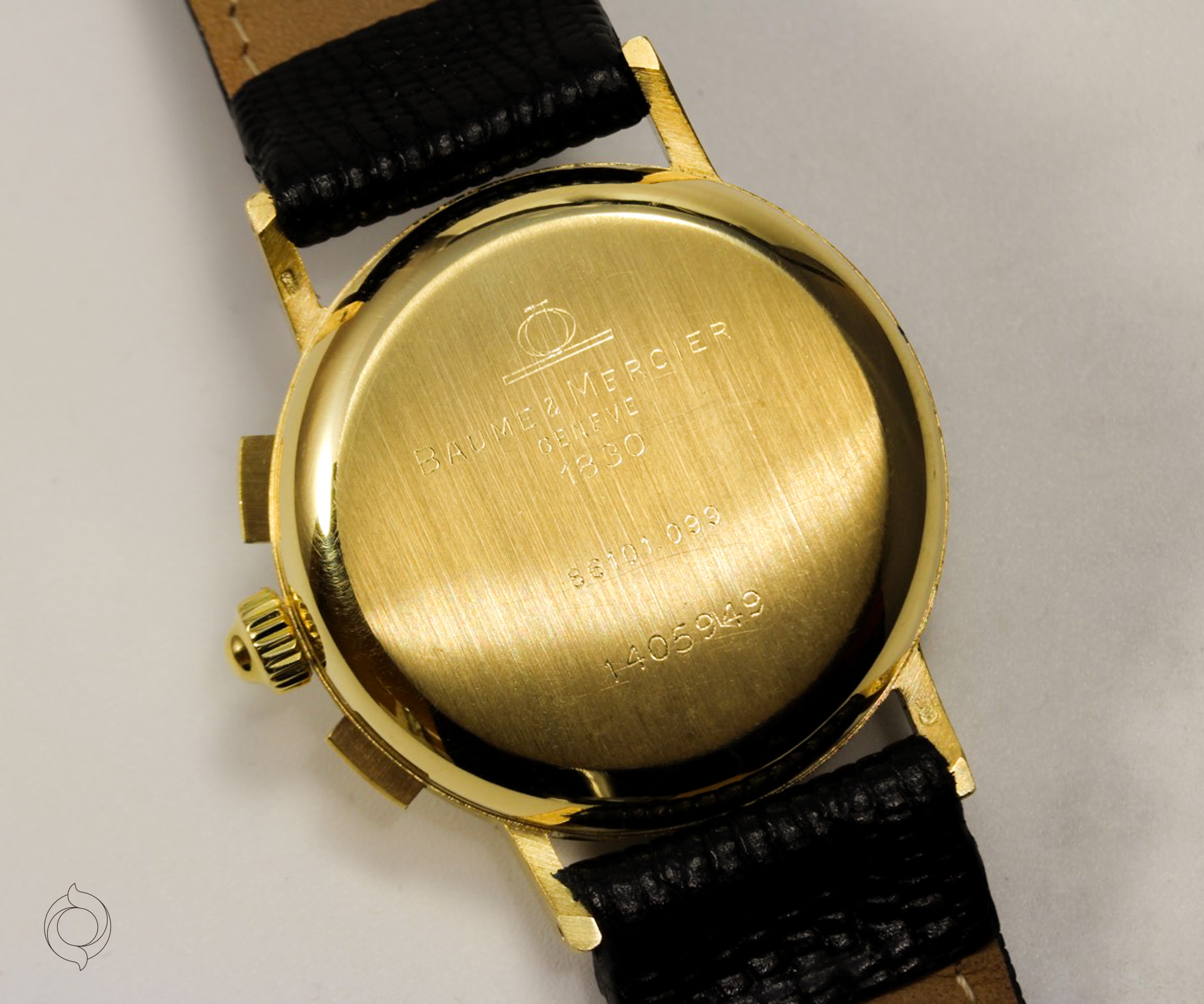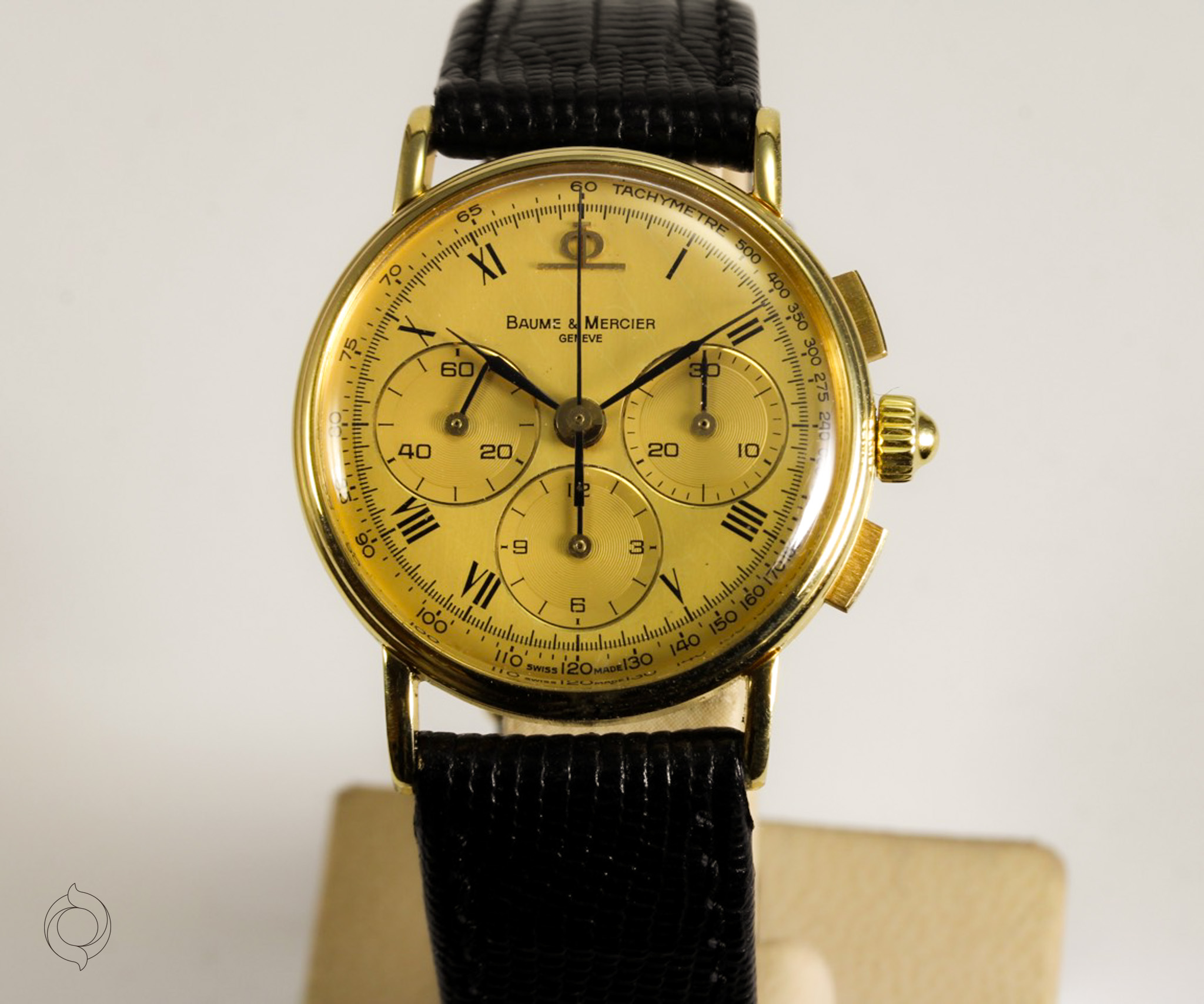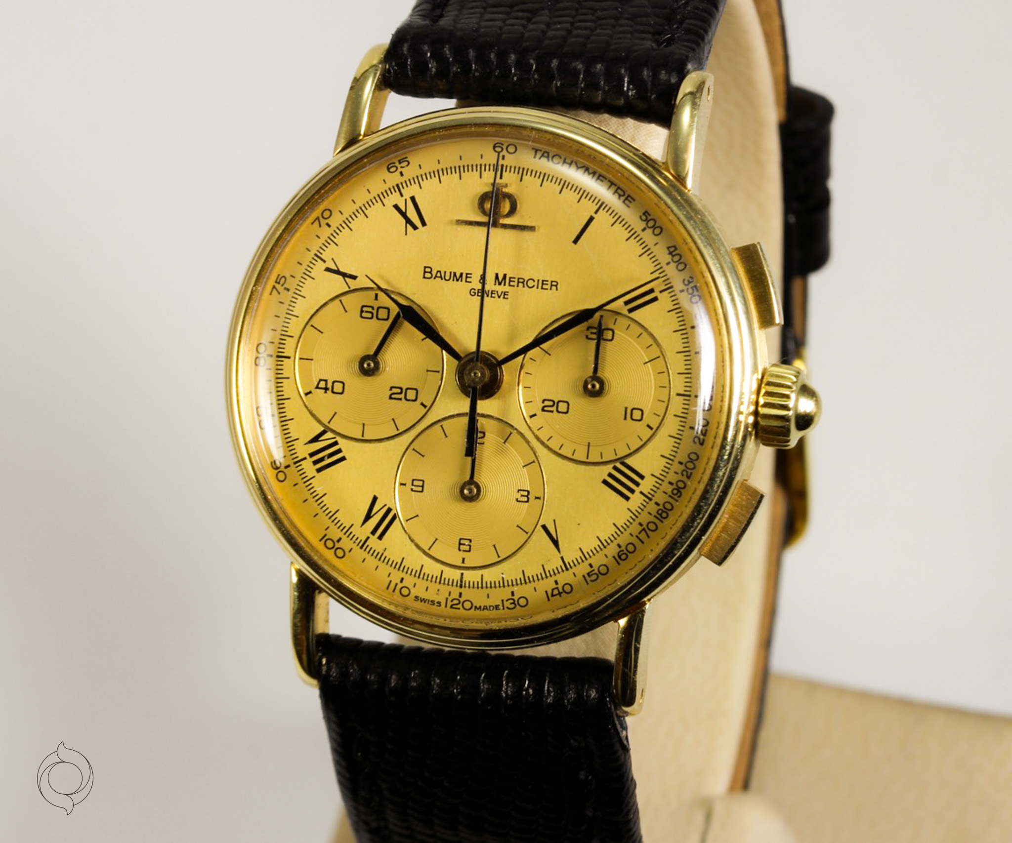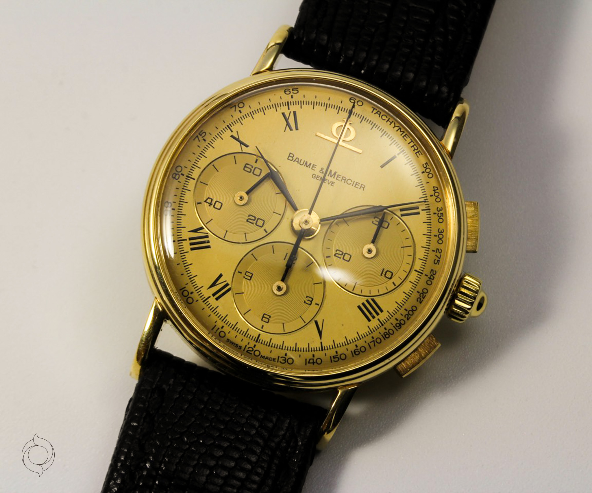 Untreated original gold, Roman hour numerals, applied BM logo, feather hands, tachymeter, minute track, 30-second counter, 12-hour counter, small seconds