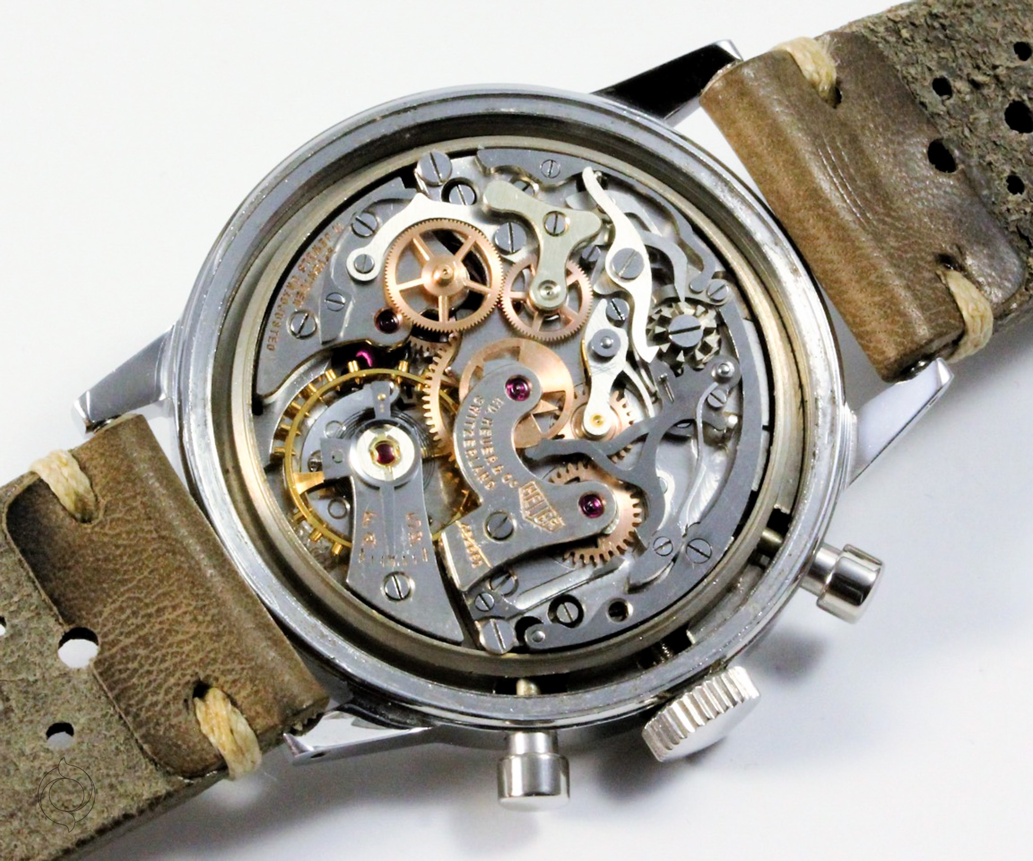 Legendary HEUER Vintage Chronograph stainless steel case 38 mm, screwed-in back, round pushers, reference 2447, manufactured ca. 1943, serial no. 72079 between the lugs, high-quality caliber Valjoux 72, untreated original in very good condition! Dial, case, movement and clasp are signed Heuer Accessories: WARRANTY CARD, SCHÖNE SAMMLERUHREN certificate of authenticity, documentation and SCHÖNE SAMMLERUHREN watch box