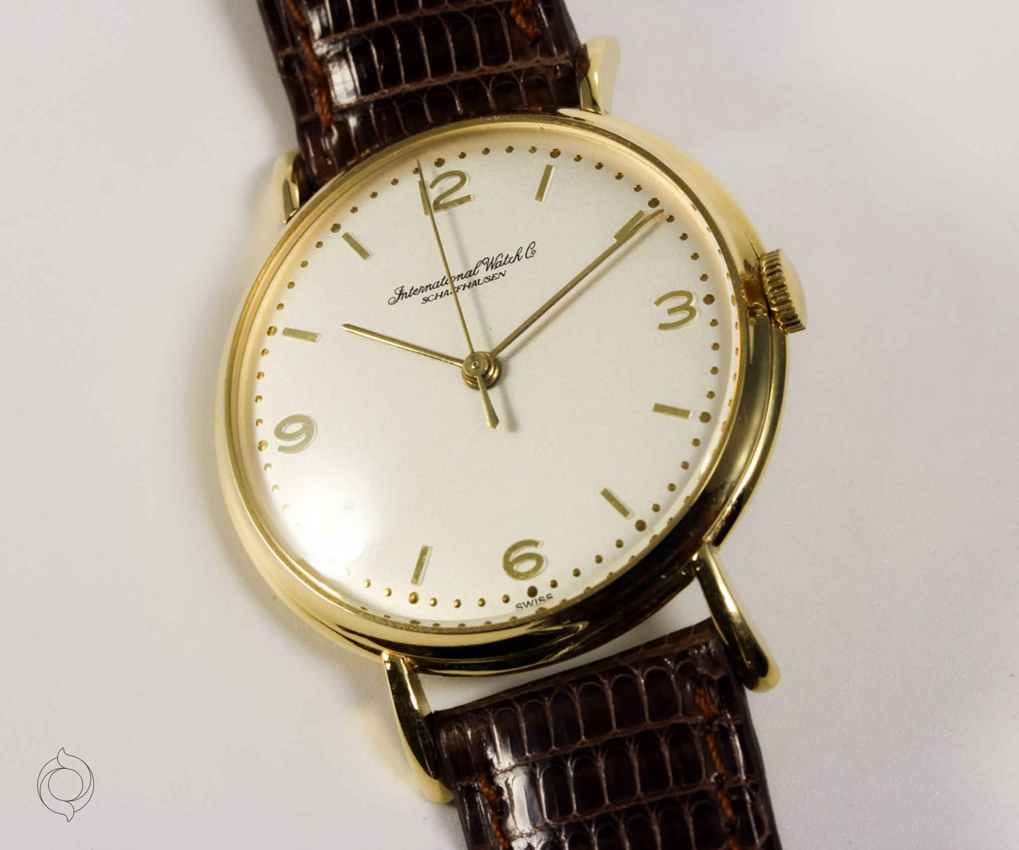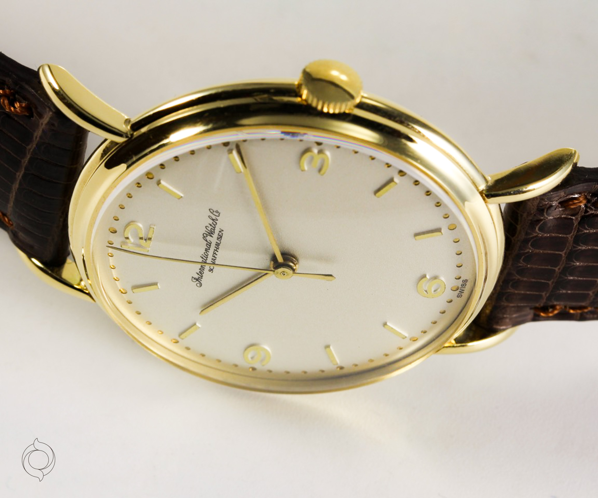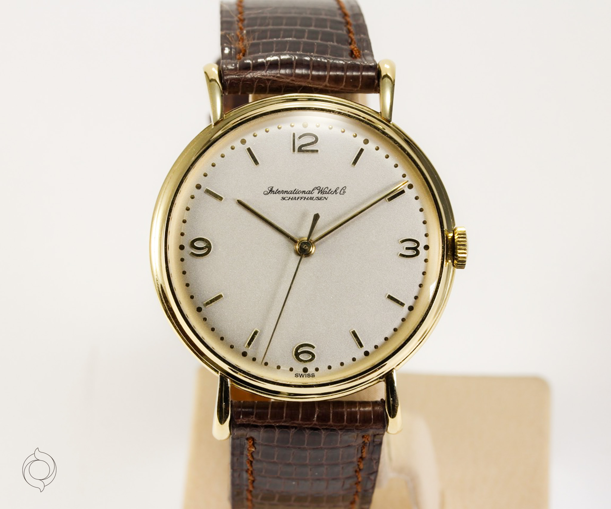 A wonderful IWC Dresswatch, large 18K gold case 36 mm, curved lugs, gold hallmark on the lug, weight 37.5 g, silver dial, manufactured in 1948, untreated original in excellent condition! dial, case and movement are signed IWC, accessories: WARRANTY CARD, SCHÖNE SAMMLERUHREN certificate of authenticity, documentation and SCHÖNE SAMMLERUHREN watch box