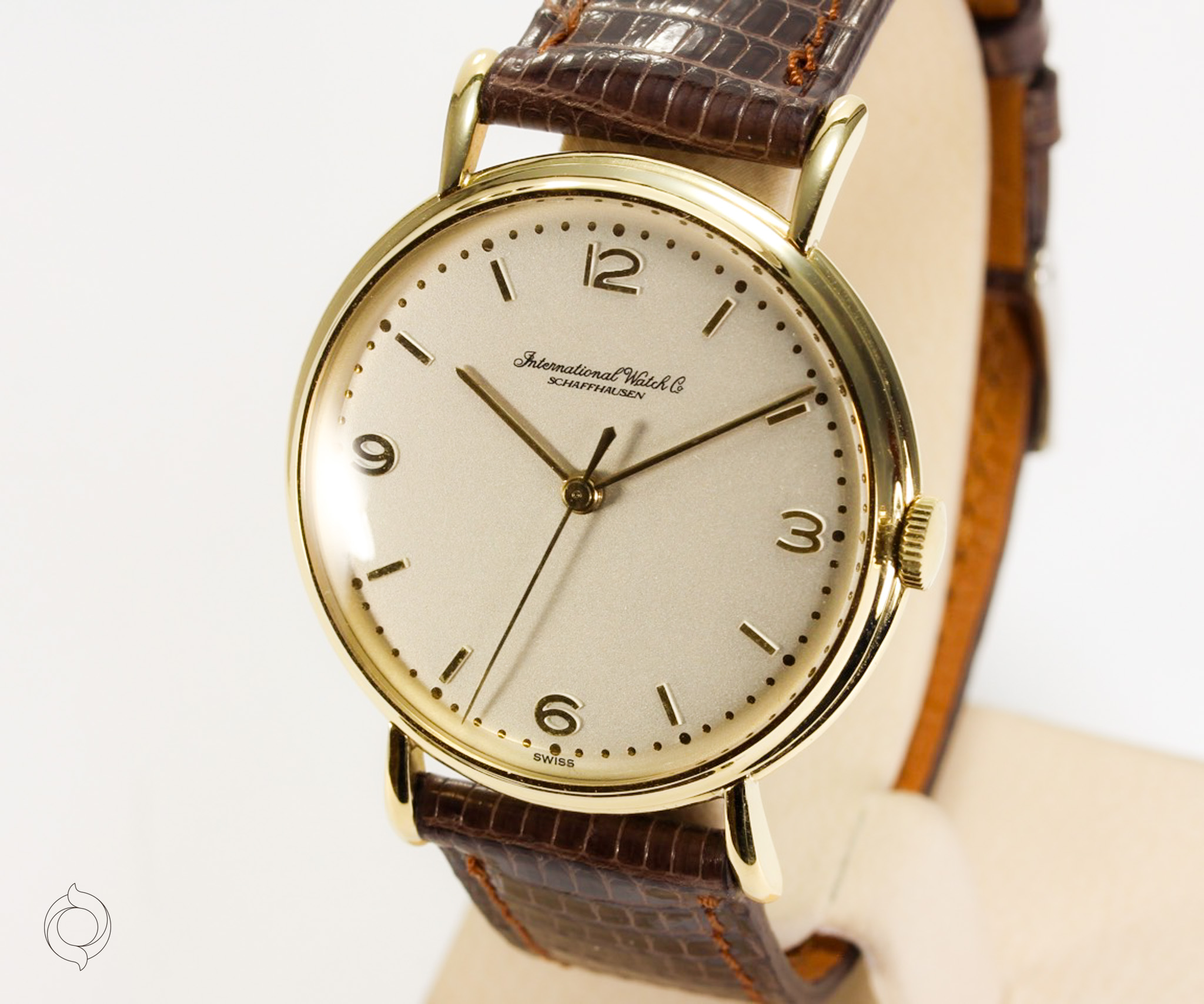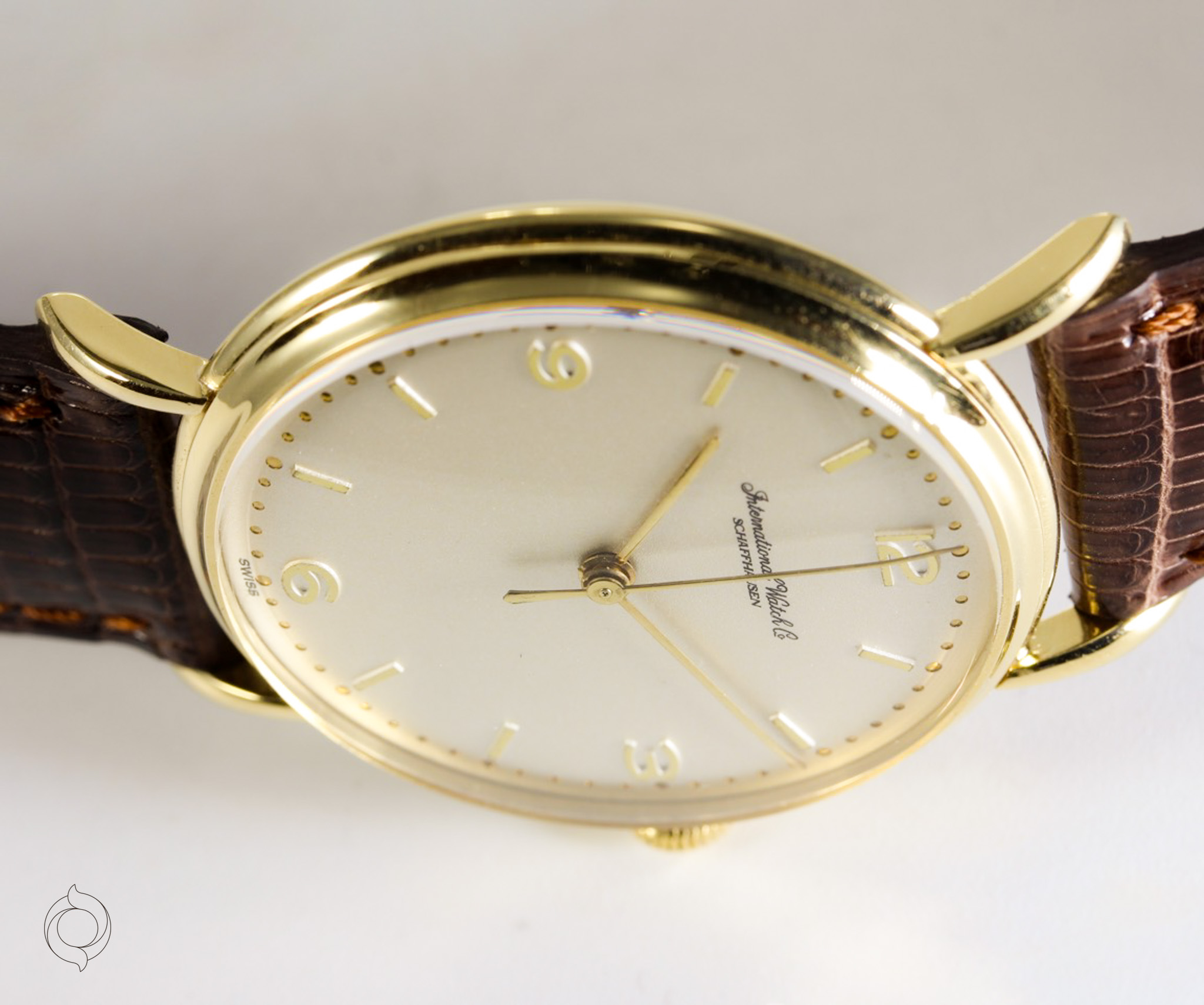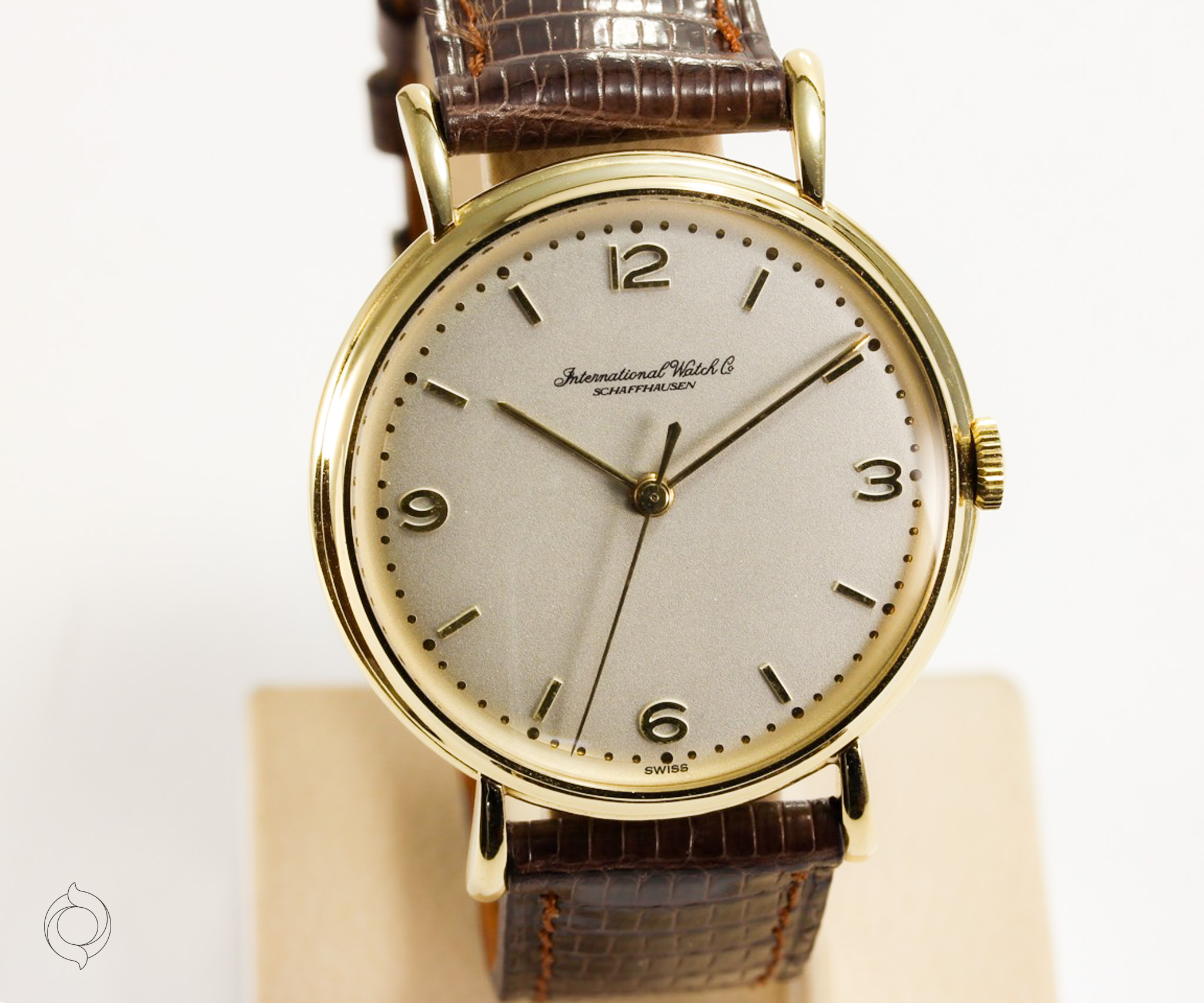 A wonderful IWC Dresswatch, large 18K gold case 36 mm, curved lugs, gold hallmark on the lug, weight 37.5 g, silver dial, manufactured in 1948, untreated original in excellent condition! dial, case and movement are signed IWC, accessories: WARRANTY CARD, SCHÖNE SAMMLERUHREN certificate of authenticity, documentation and SCHÖNE SAMMLERUHREN watch box