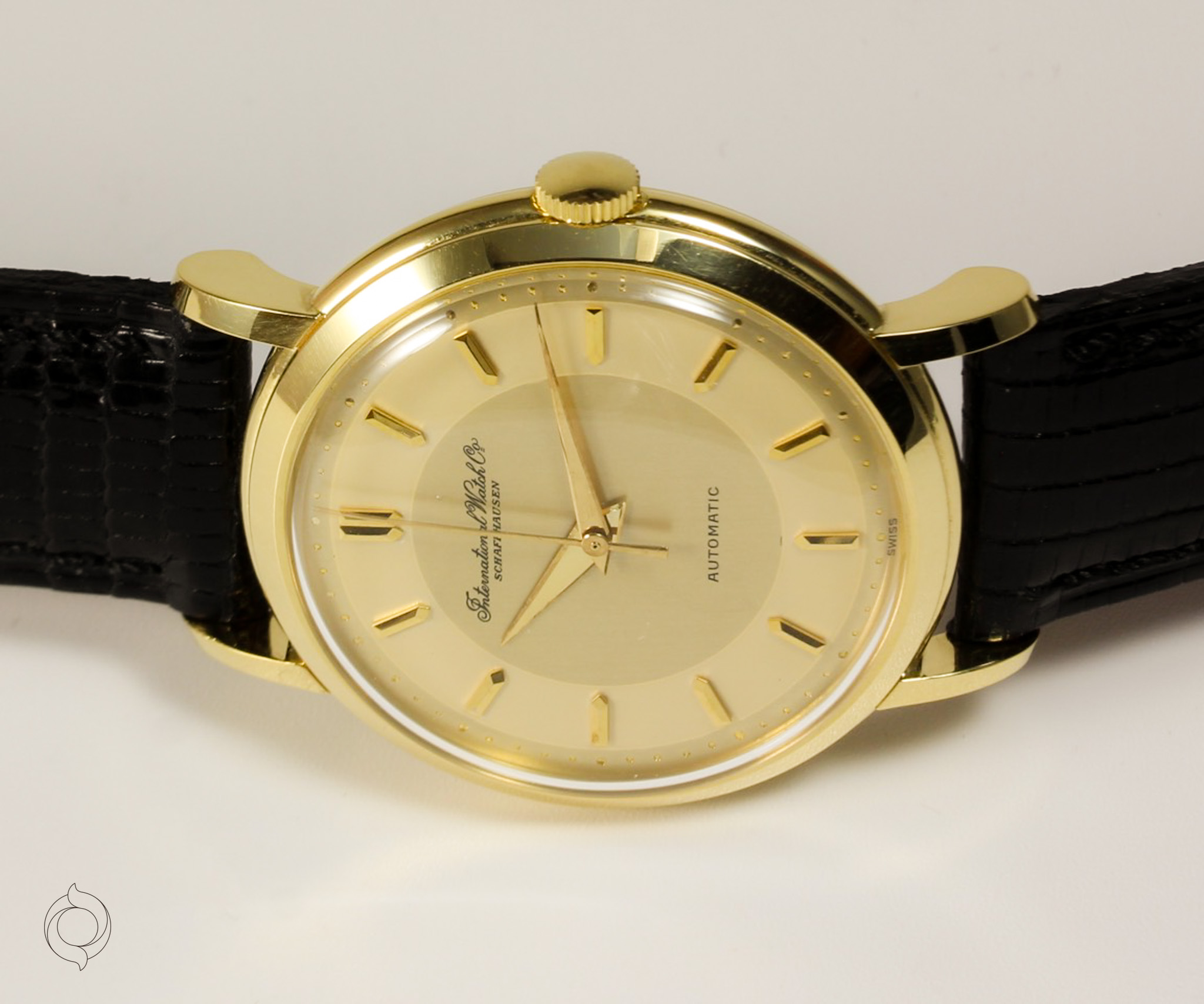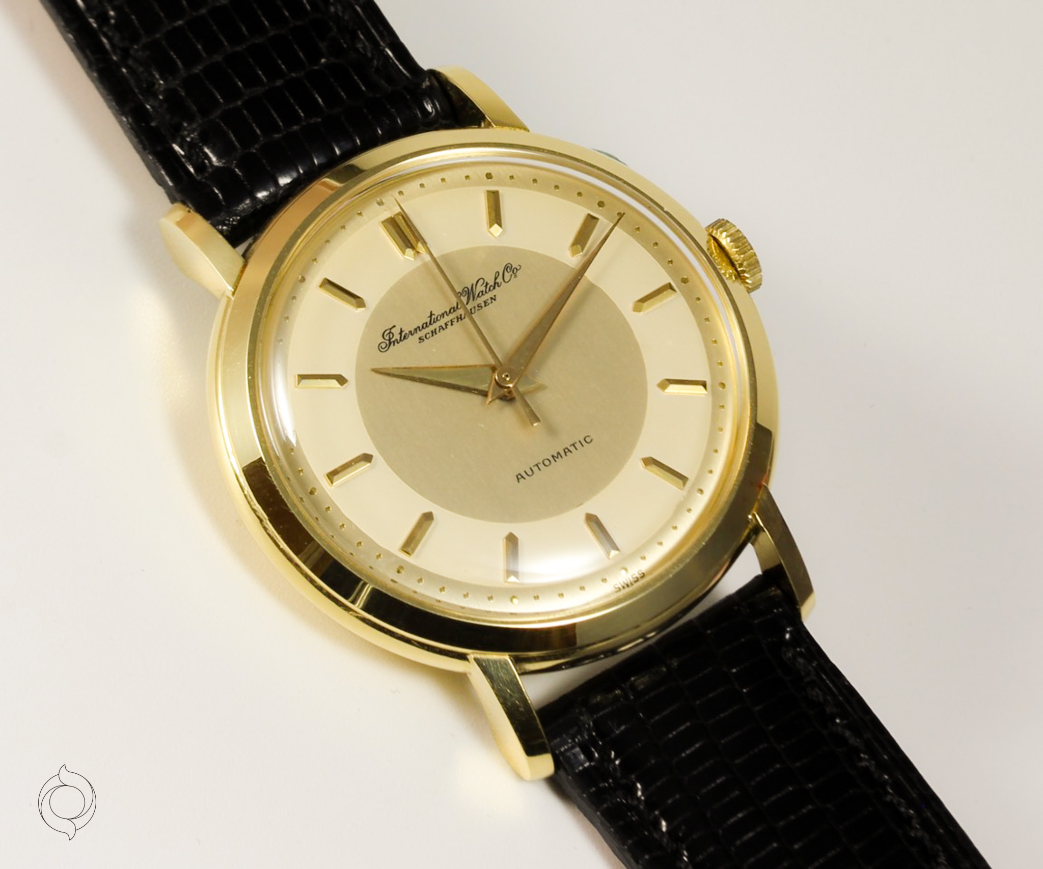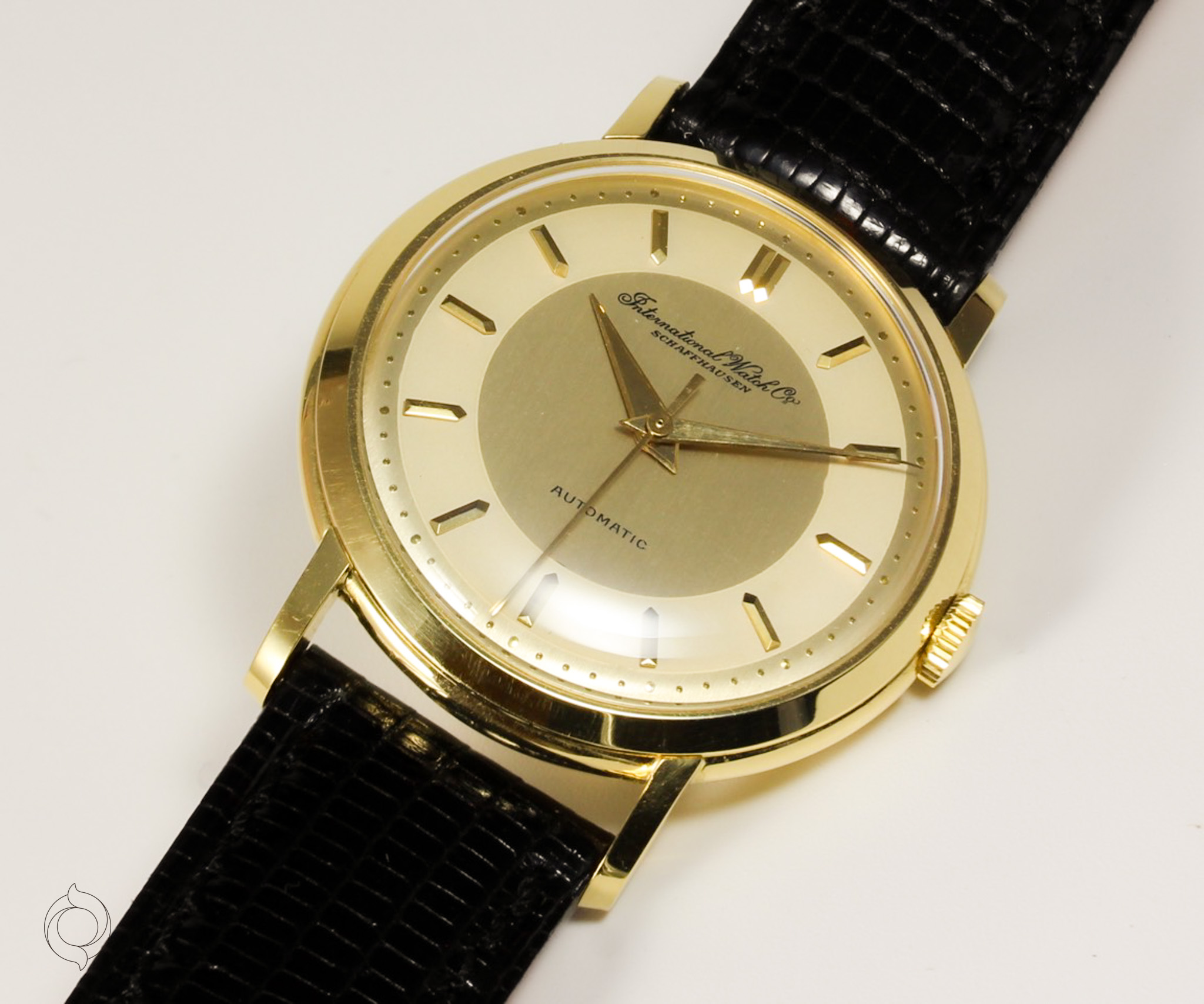 Beautiful IWC Dresswatch 18K gold case, gold hallmark on the lug, weight 43 g, automatic cal. 852, fine two-tone dial, manufactured in 1951, untreated original in excellent condition! Dial, case and movement are signed IWC Accessories: WARRANTY CARD, SCHÖNE SAMMLERUHREN certificate of authenticity, documentation and SCHÖNE SAMMLERUHREN watch box