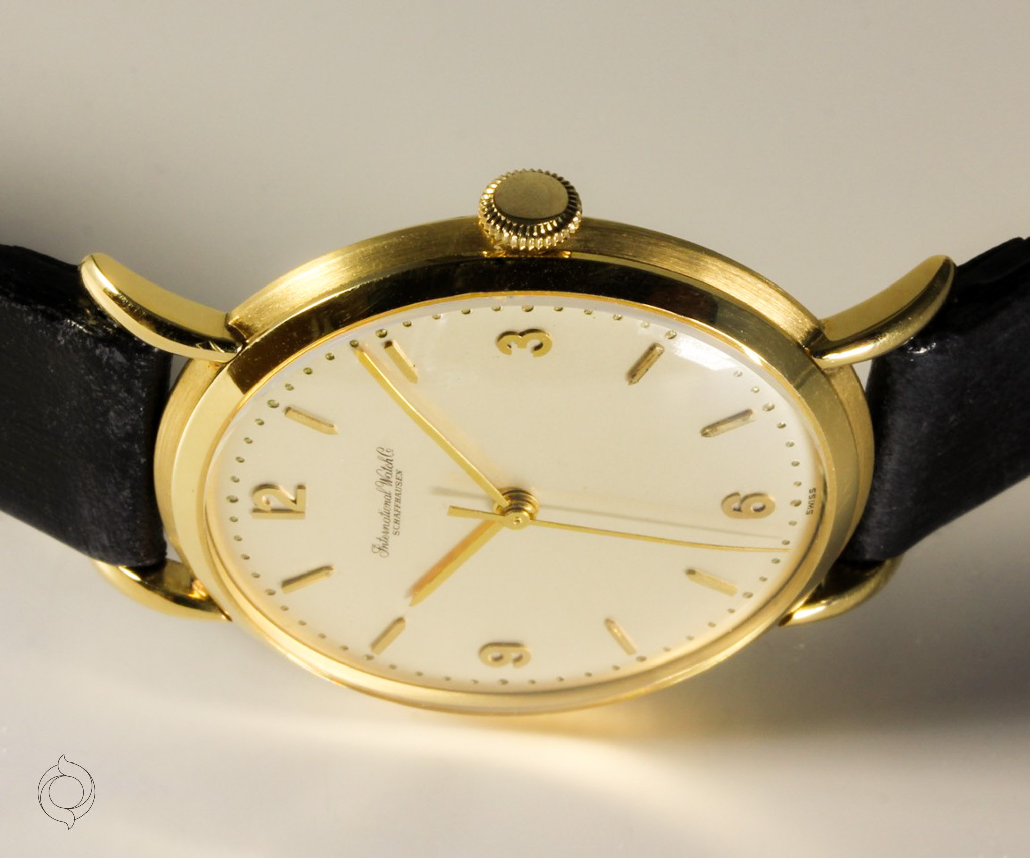 Exclusive IWC Dresswatch large stepped 18K gold case 37 mm, extra long lugs, gold hallmarks on case edge and lugs, hand-wound caliber 89, manufactured 1954, untreated original excellent condition! Dial, case and movement are signed IWC Accessories: WARRANTY CARD, SCHÖNE SAMMLERUHREN certificate of authenticity, documentation and SCHÖNE SAMMLERUHREN watch box