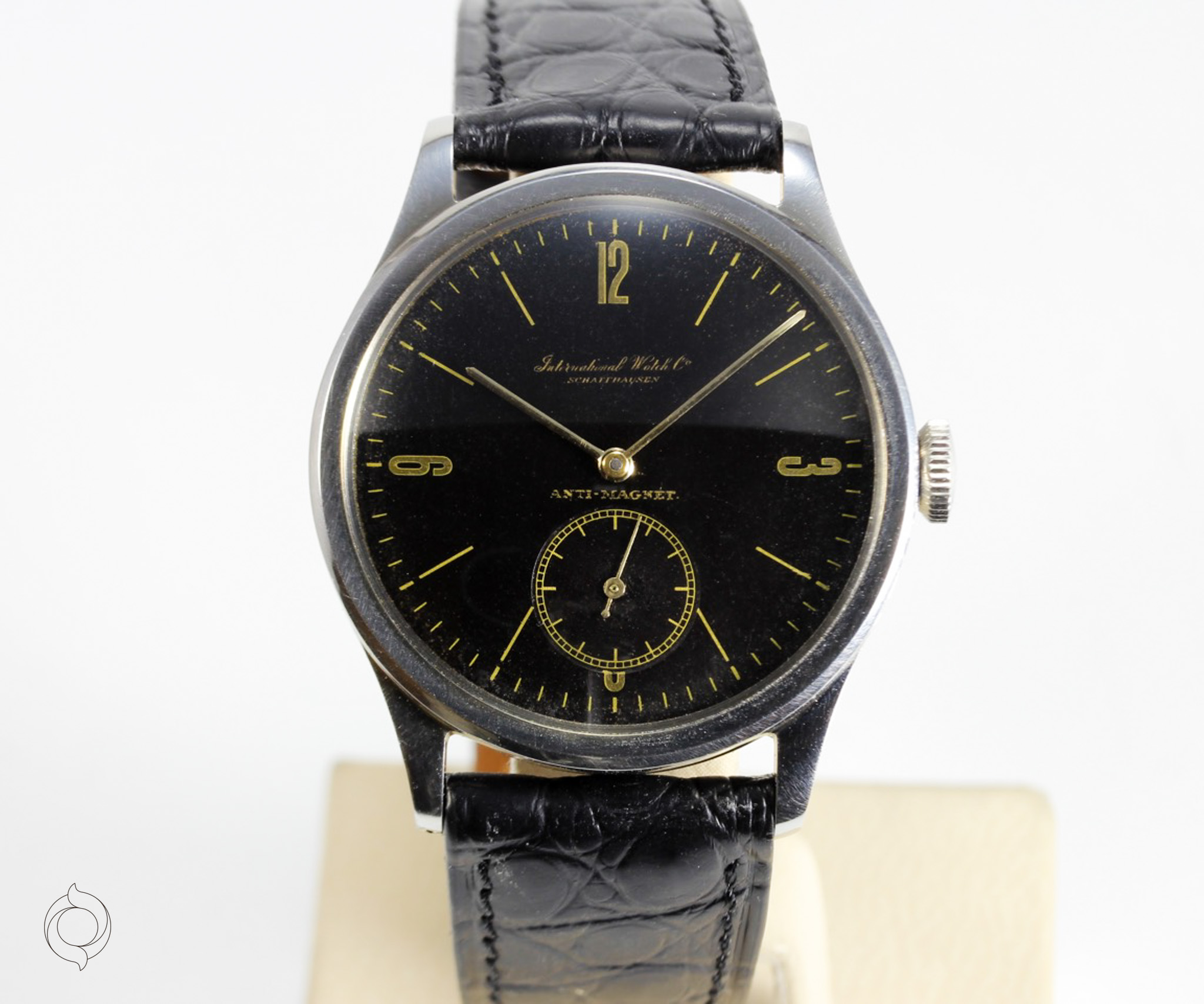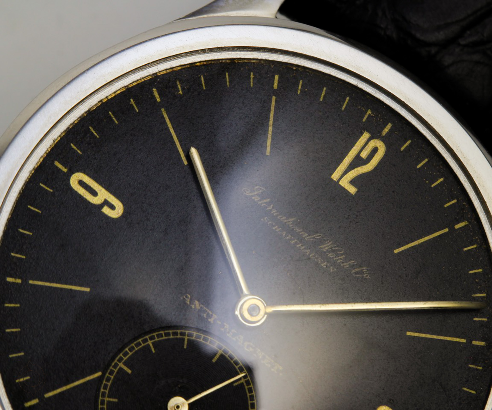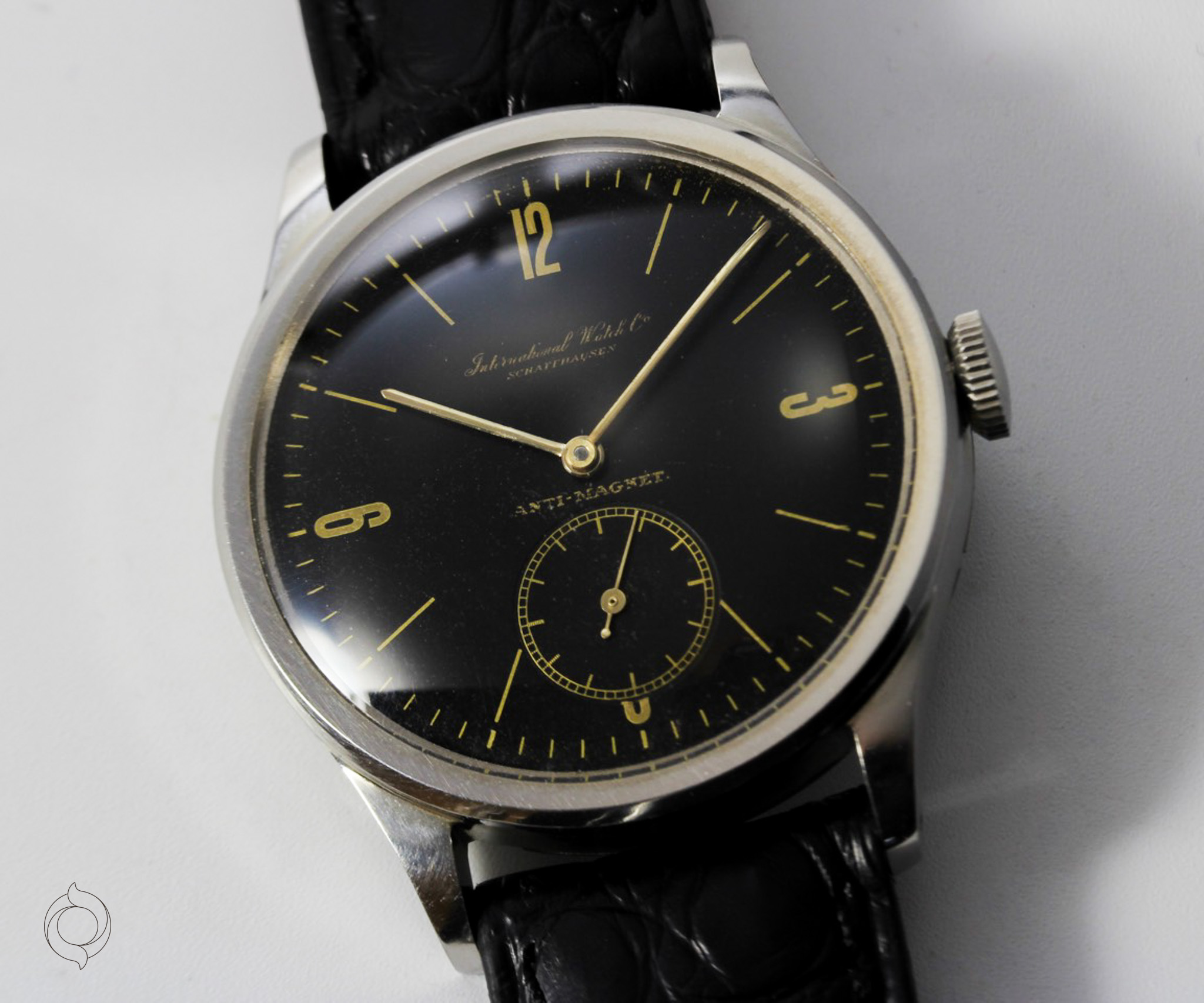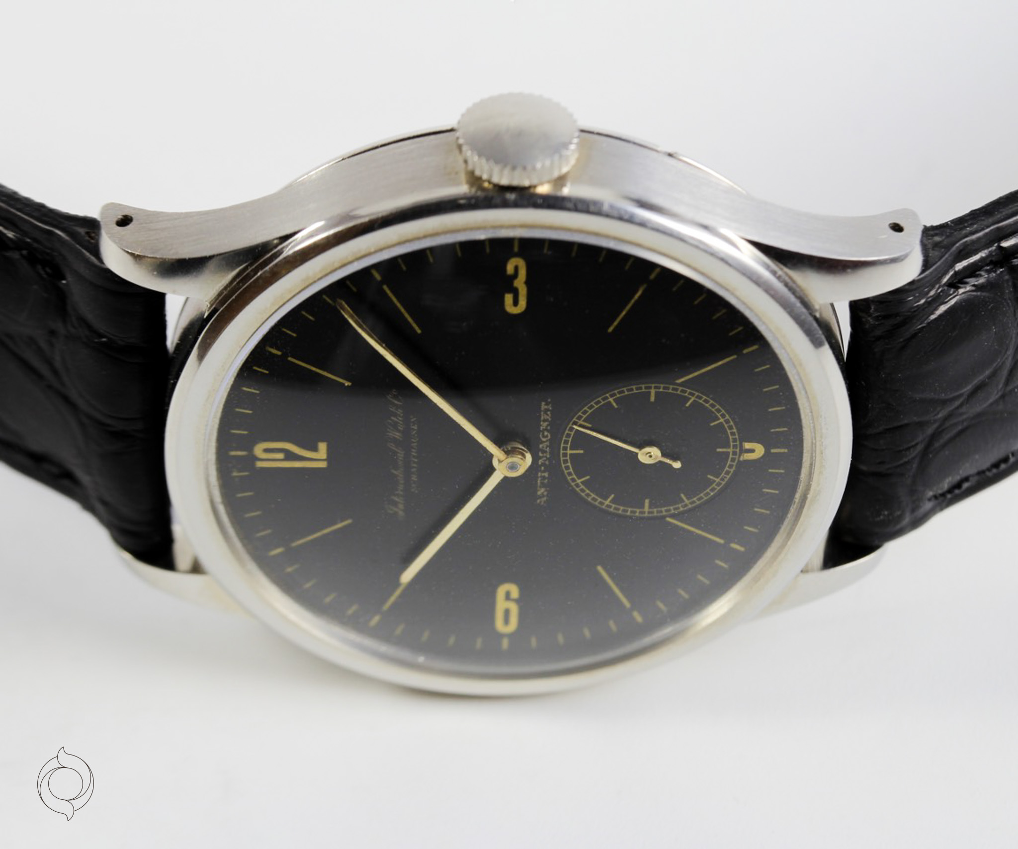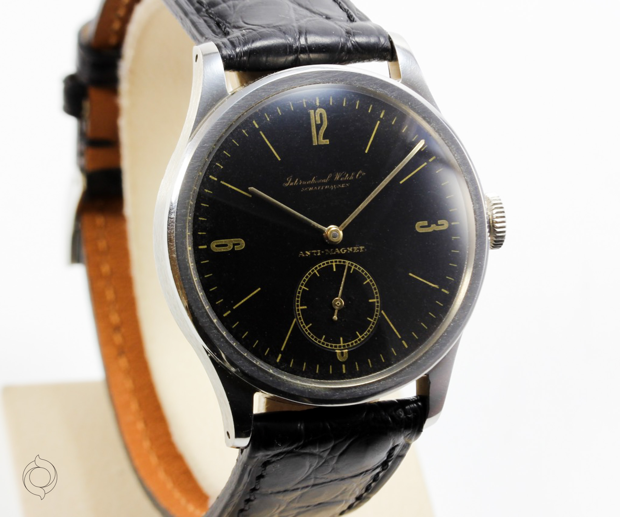 Extrem seltene IWC Vintage Uhr Edelstahl Gehäuse, Anti-Magnetic, Herstellung 1939, Handaufzug Kaliber 83, schwarzes Zifferblatt Gilt Dial, unbehandelt original sehr gut erhalten! Zifferblatt, Gehäuse, Werk und Schließe sind IWC signiert Zubehör: GARANTIEKARTE, SCHÖNE SAMMLERUHREN Echtheitszertifikat, Dokumentation und SCHÖNE SAMMLERUHREN Uhrenbox