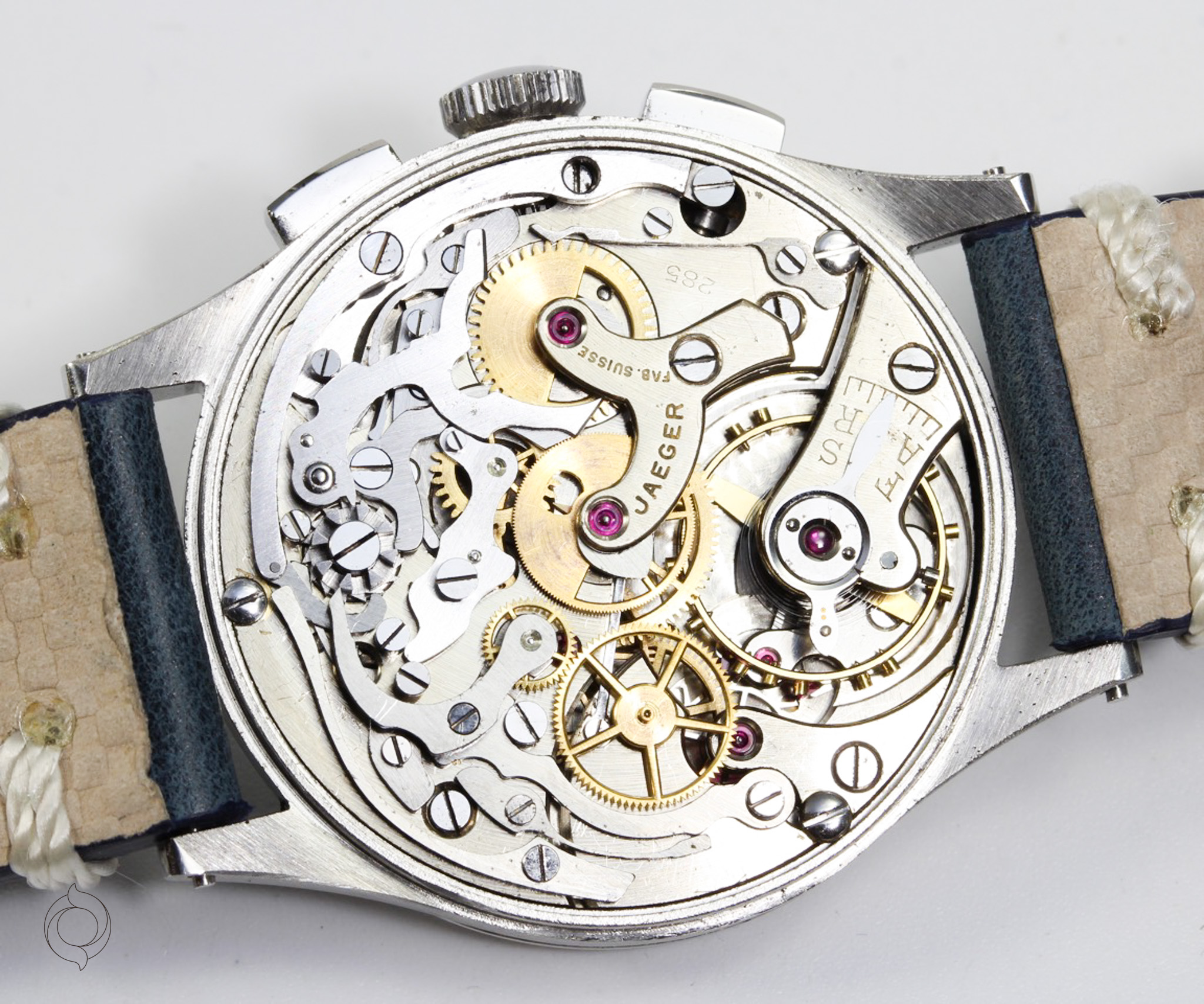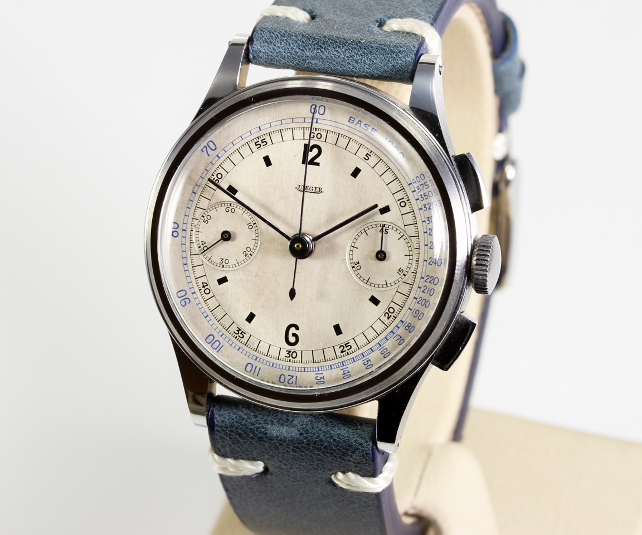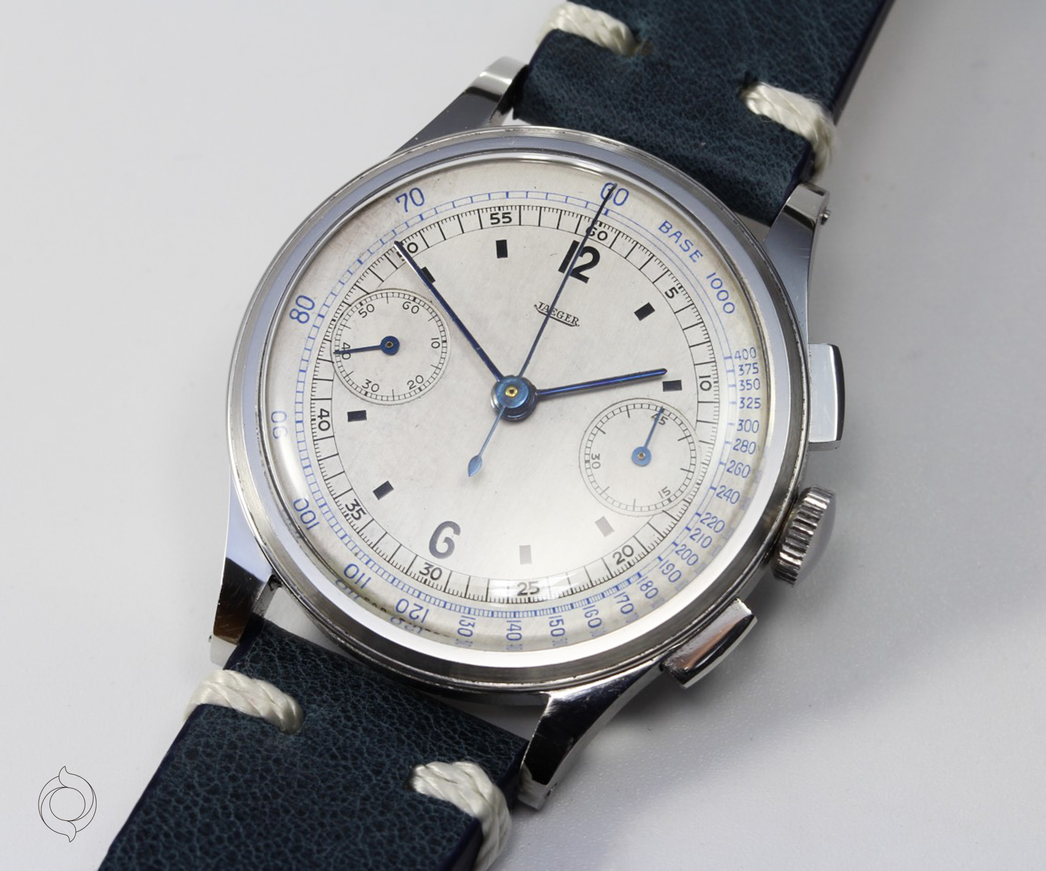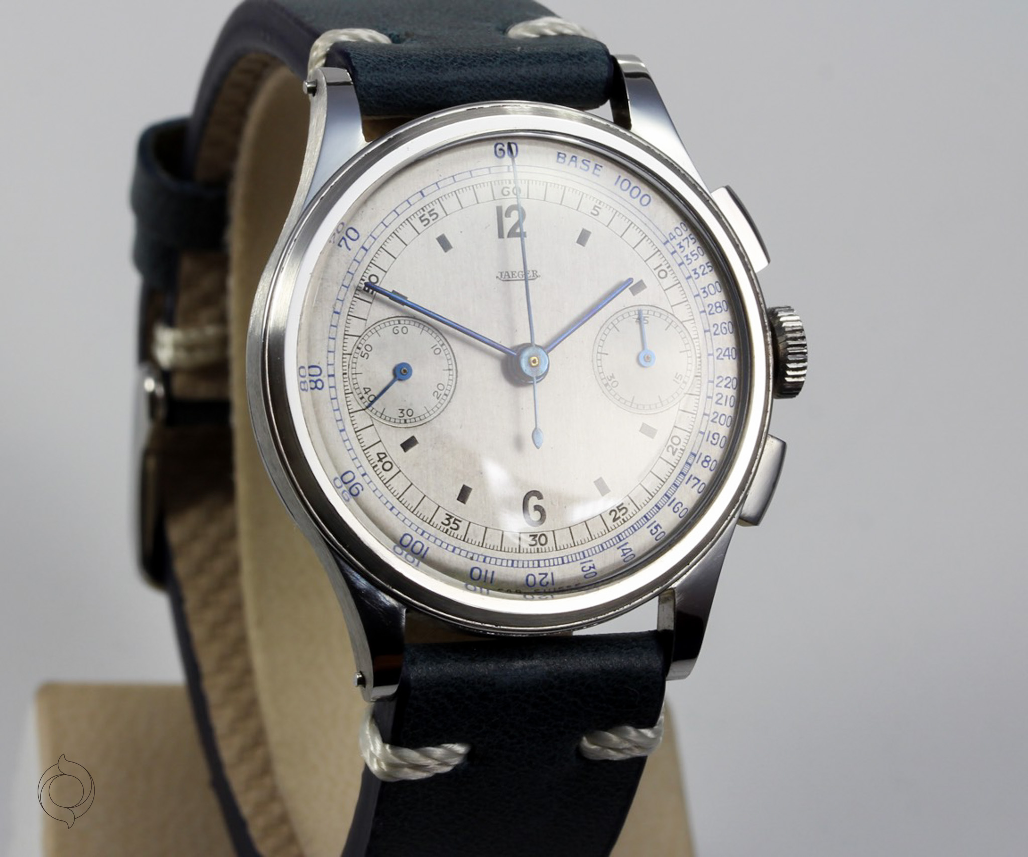 Very rare JAEGER chronograph, Swiss-made, stainless steel case, Ref. 5185, manual winding caliber 285, manufactured around 1958, untreated, original, in excellent condition! Dial, case, and movement are signed JAEGER Accessories: WARRANTY CARD, SCHÖNE SAMMLERUHREN certificate of authenticity, documentation, and SCHÖNE SAMMLERUHREN watch box