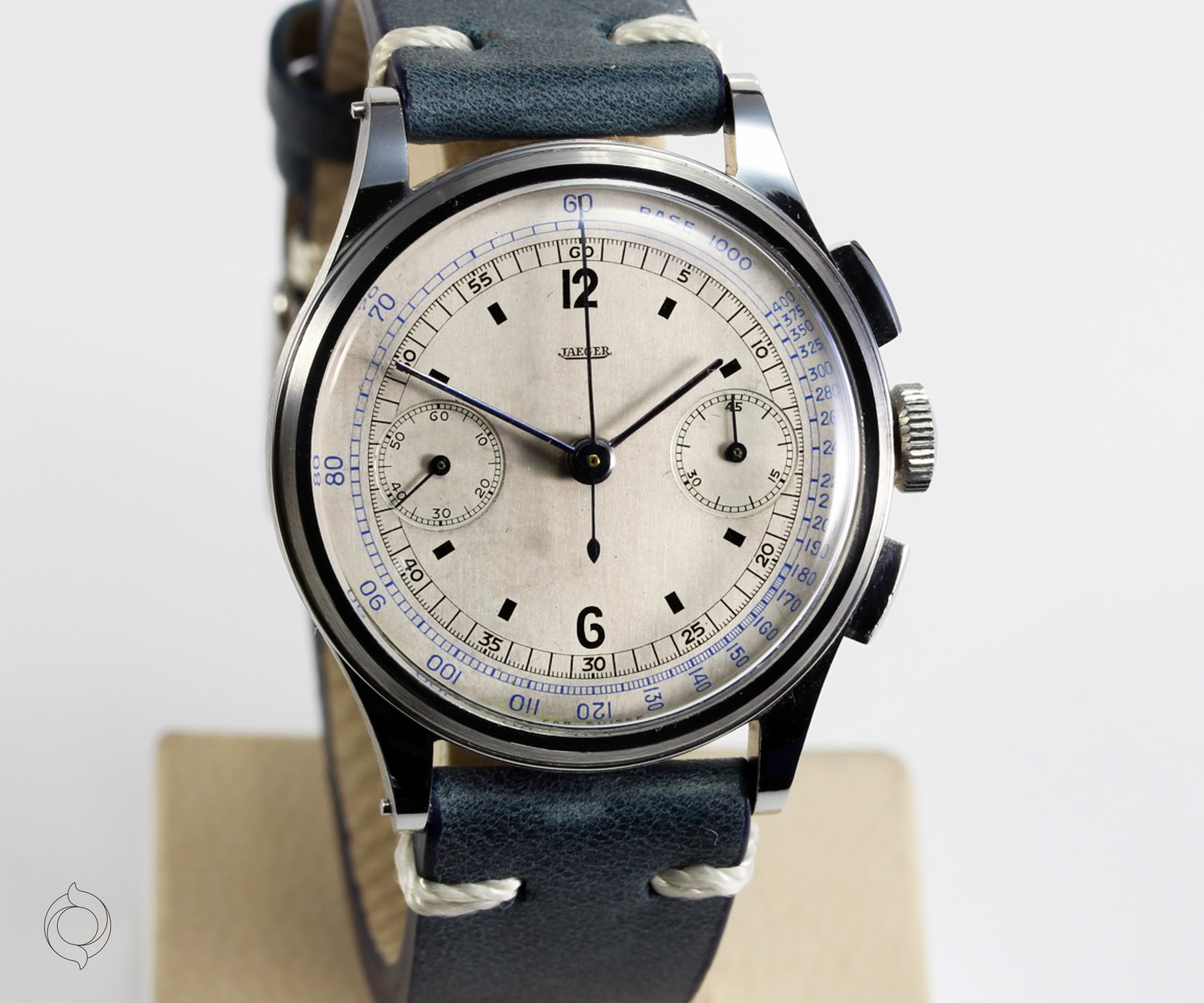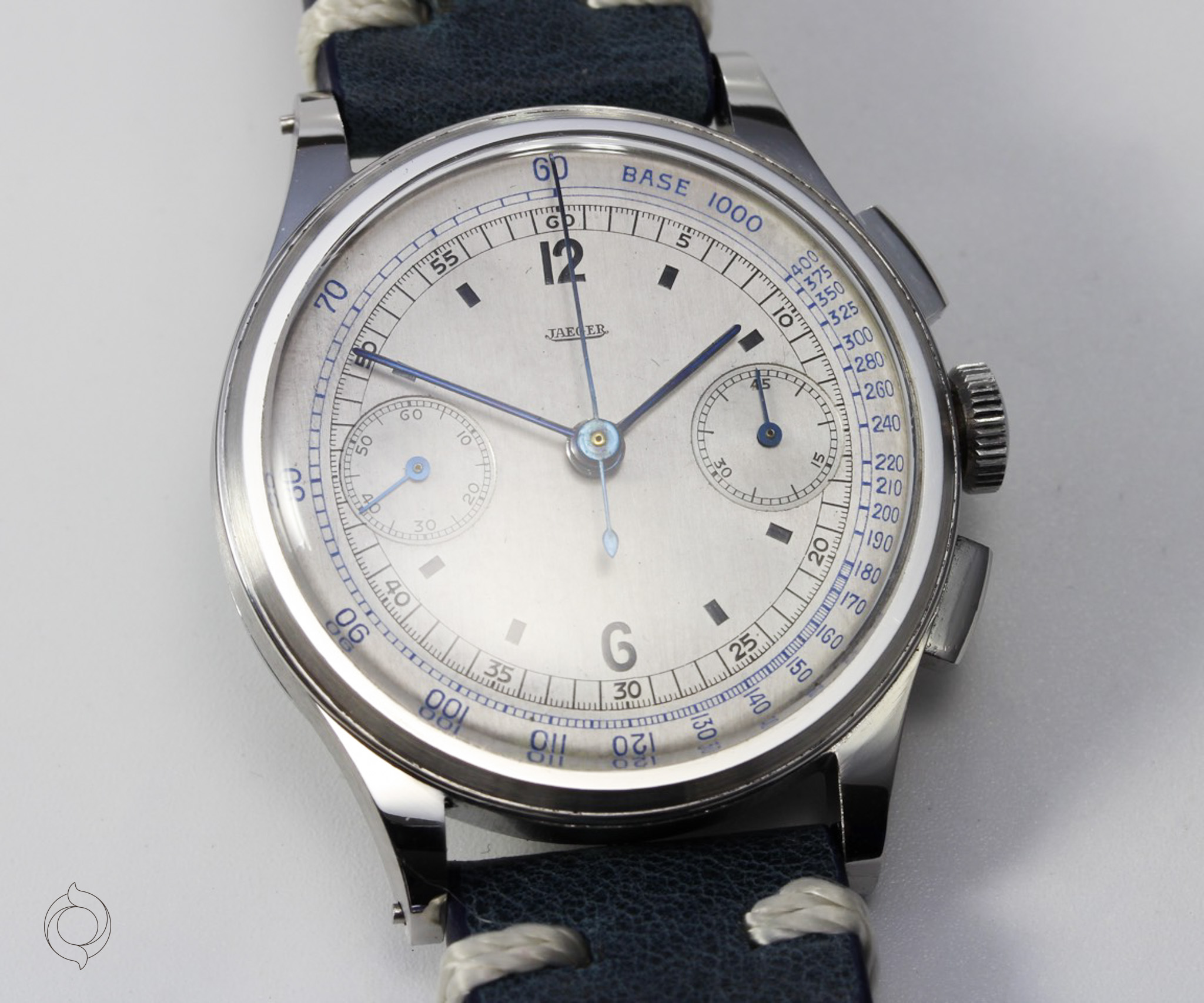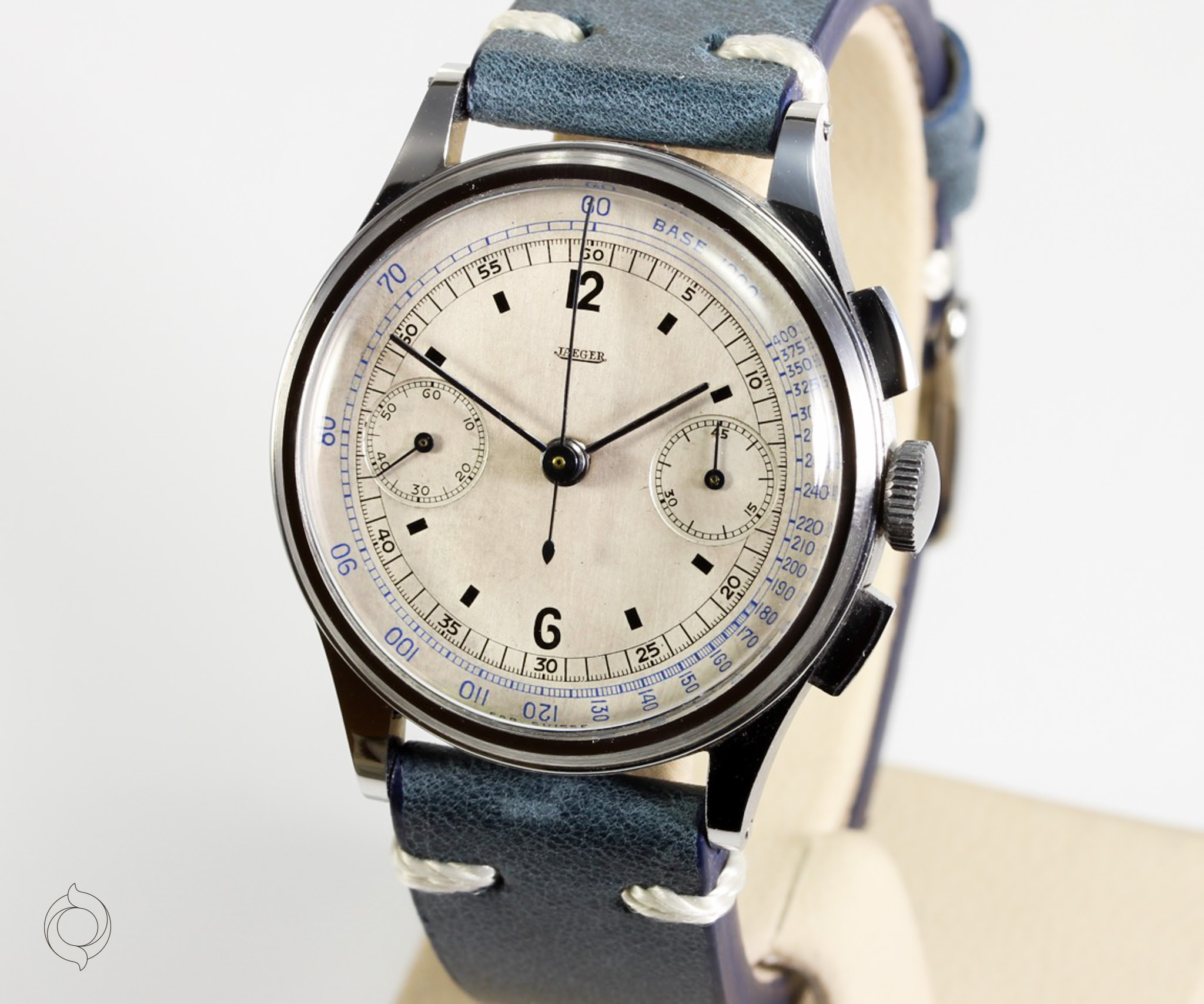 Untreated original, Arabic hour markers and indexes, blued hands, blue tachymeter scale, railway minute track, 45-minute counter, small seconds