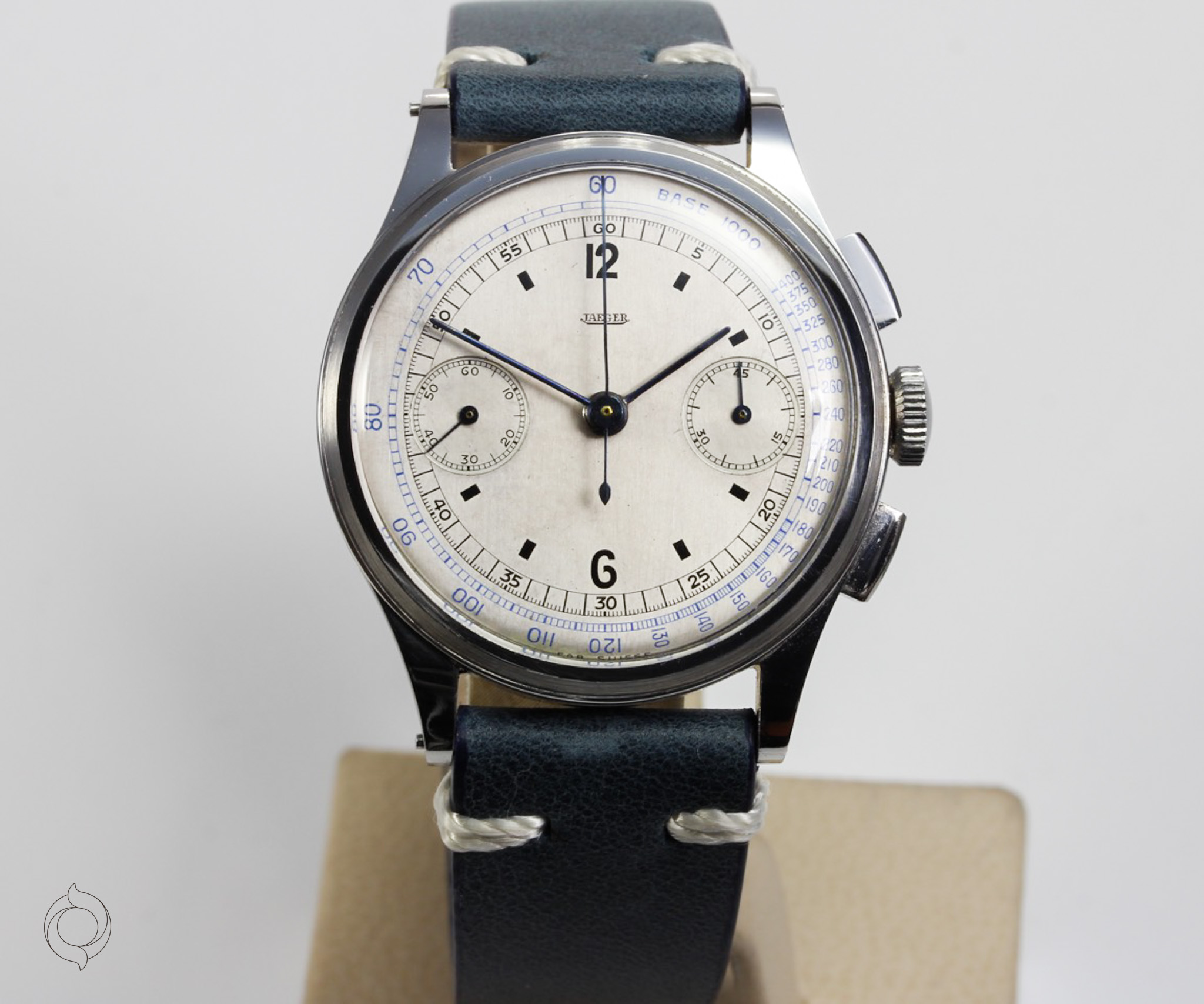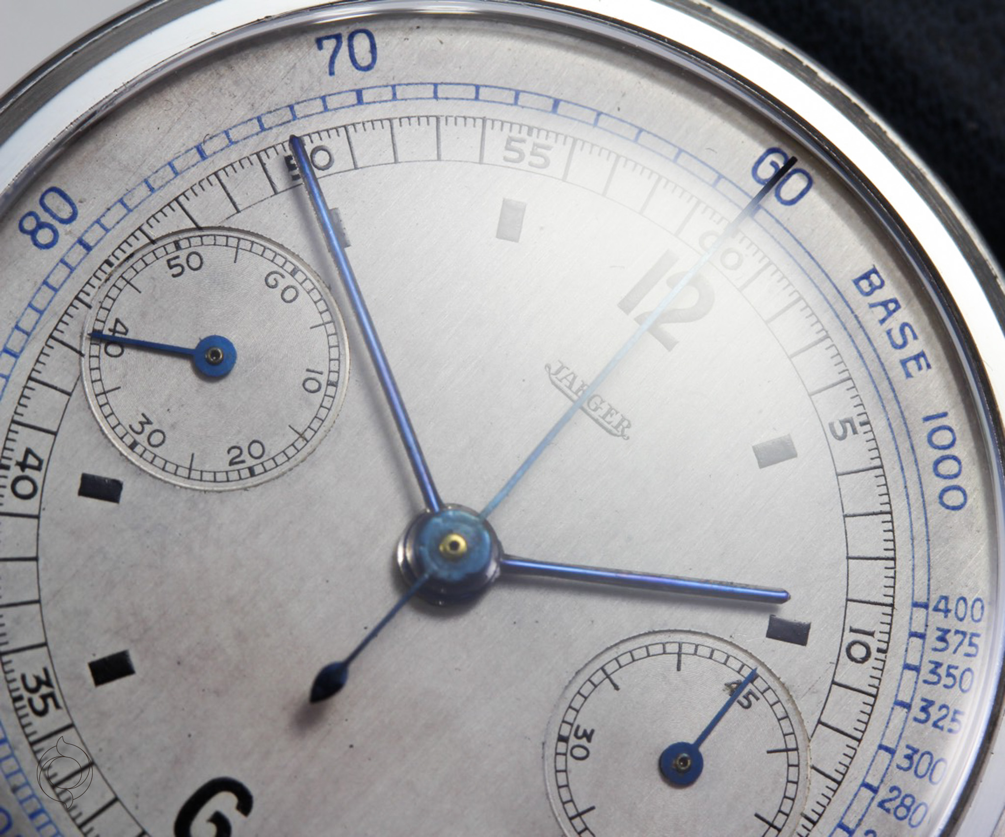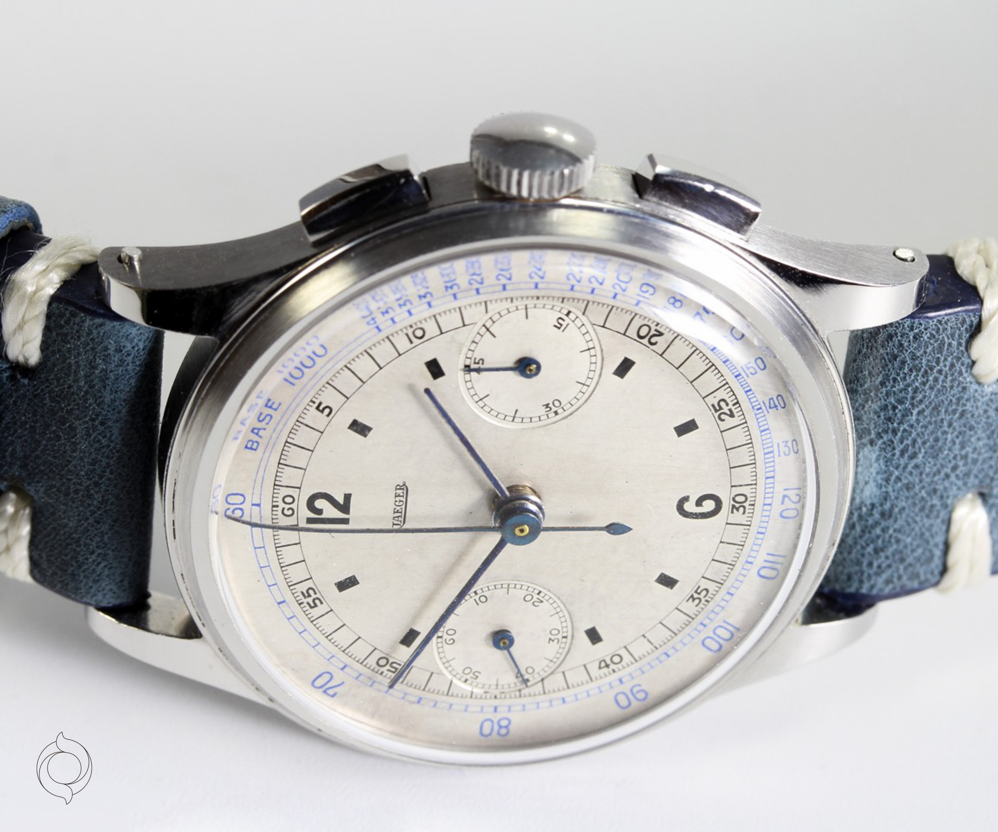 Untreated original, Arabic hour markers and indexes, blued hands, blue tachymeter scale, railway minute track, 45-minute counter, small seconds