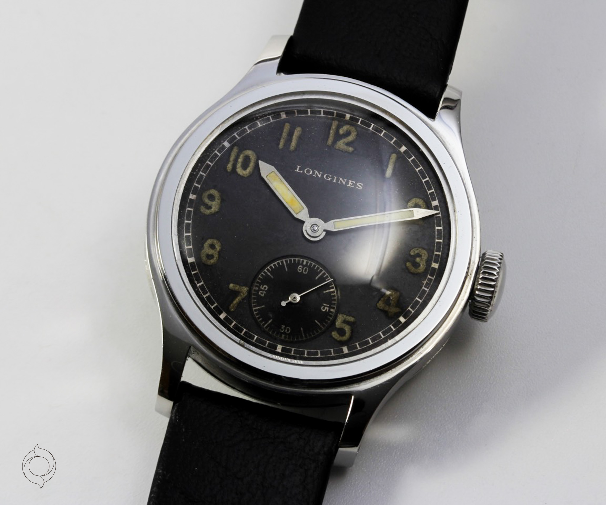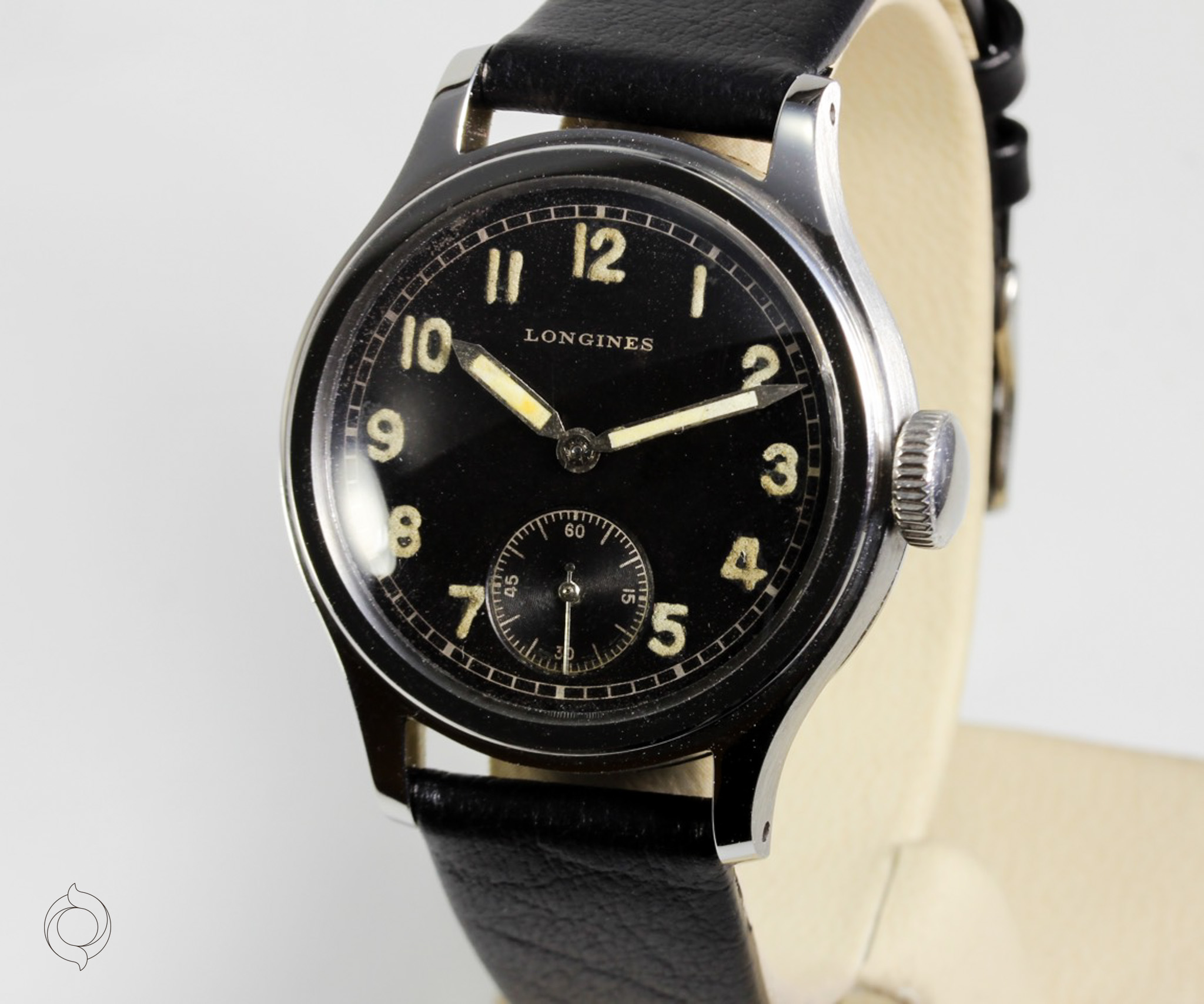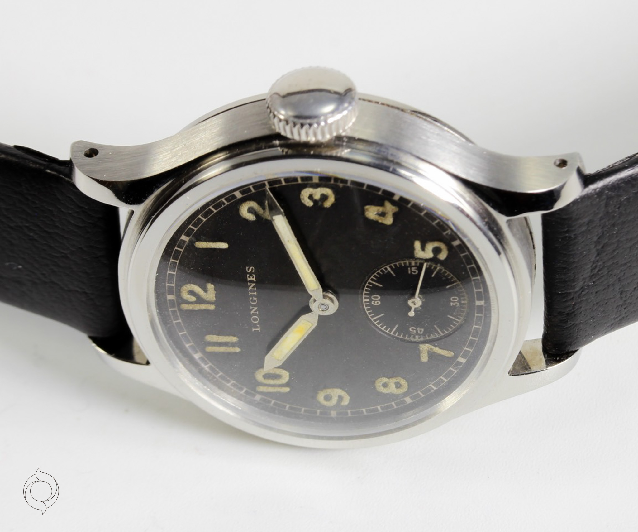 Extrem seltene, frühe LONGINES Vintage Uhr Edelstahl Gehäuse, geschraubter Boden "Tre Secce", unbehandeltes schwarzes Zifferblatt mit Leuchtzahlen und Leuchtzeigern (kein Radium), Referenz 4748, Herstellung 1943, unbehandelt original sehr gut erhalten, mit LONGINES Archivauszug! Zifferblatt, Gehäuse und Werk sind LONGINES signiert Zubehör: GARANTIEKARTE, LONGINES Archivauszug, Dokumentation und SCHÖNE SAMMLERUHREN Uhrenbox