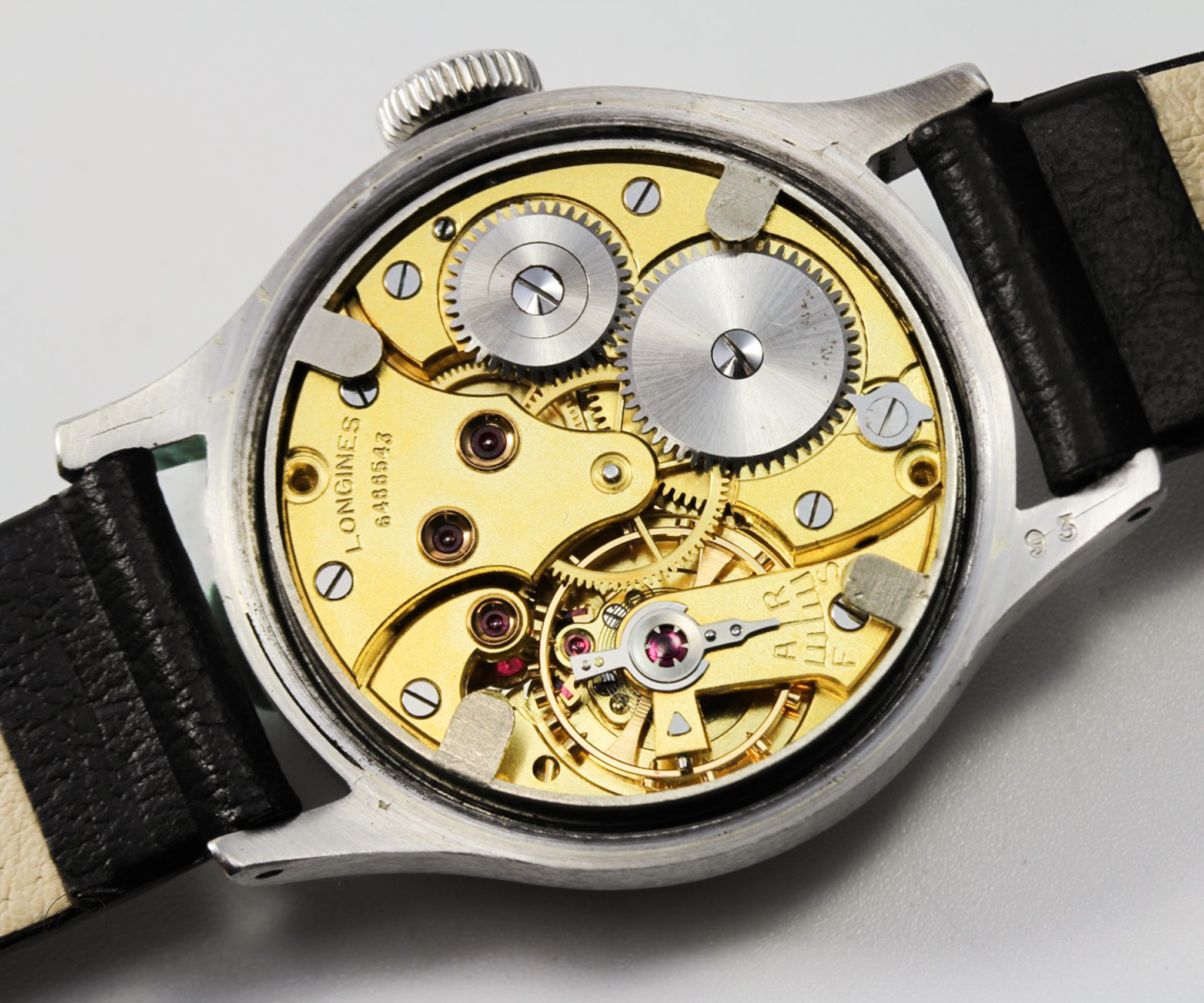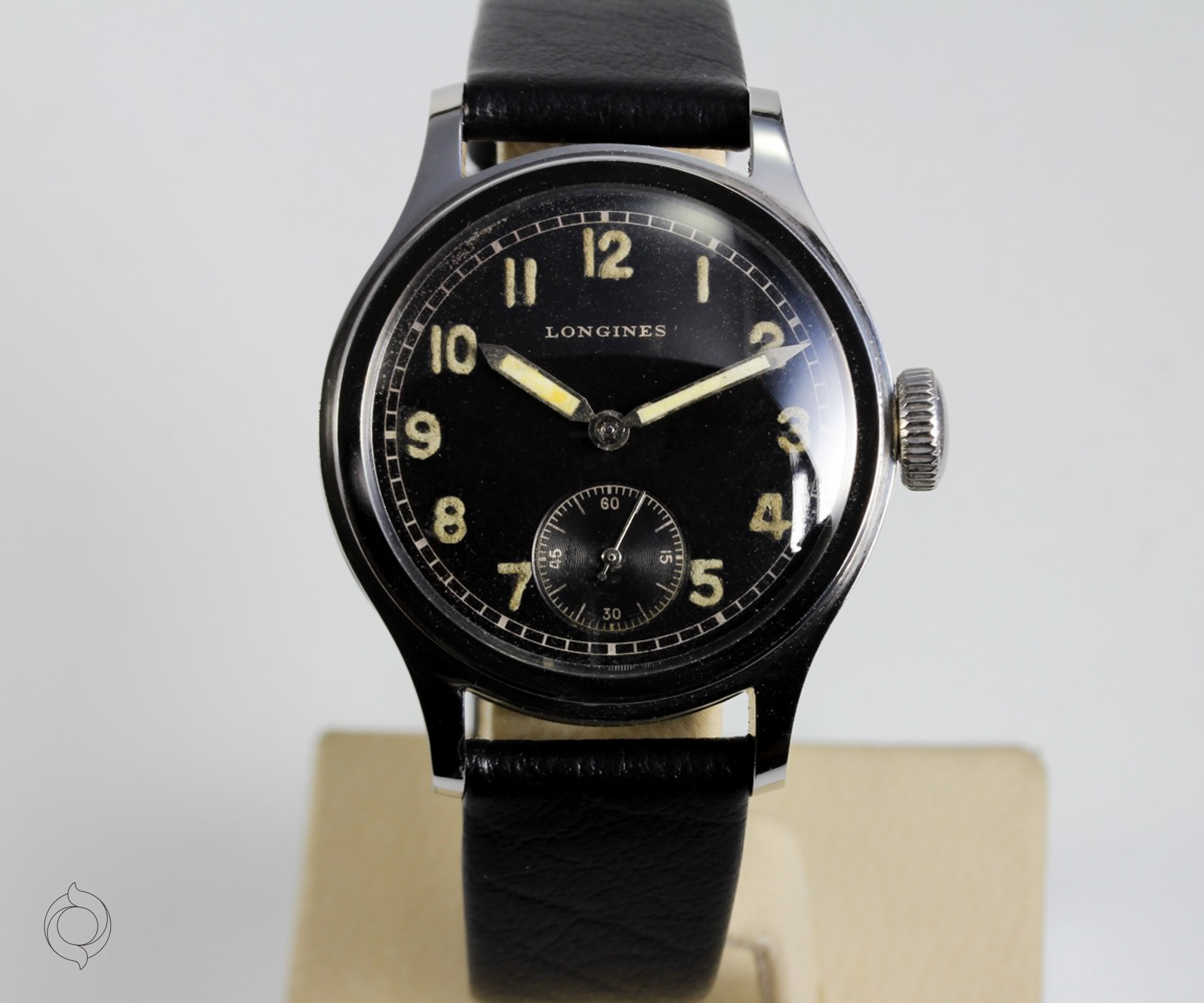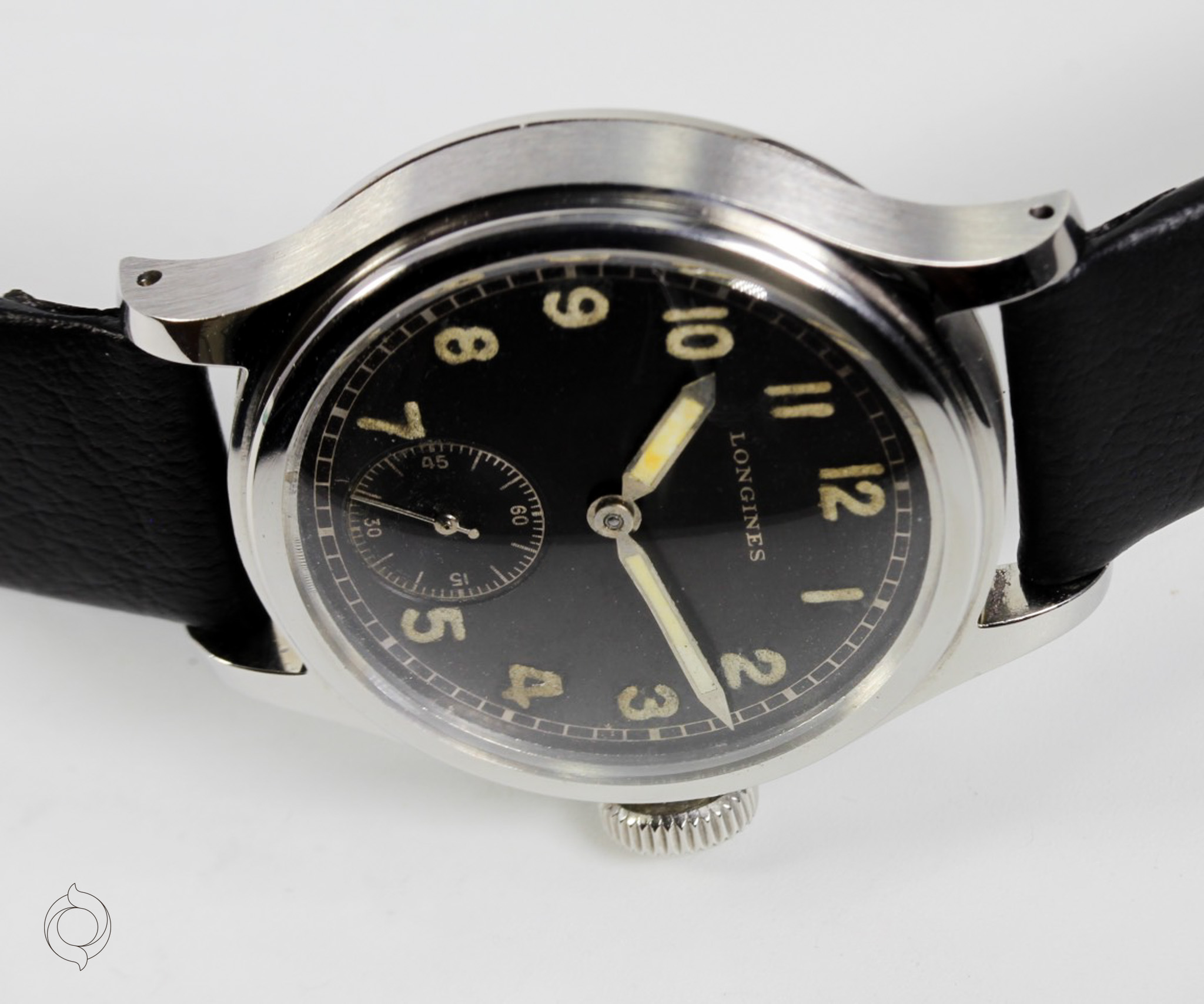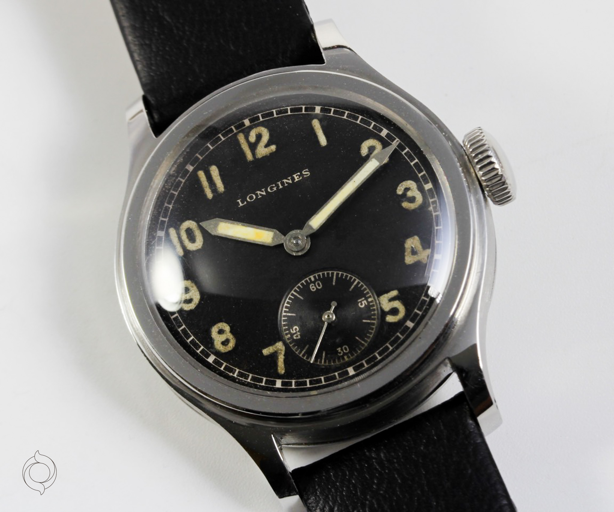 Extrem seltene, frühe LONGINES Vintage Uhr Edelstahl Gehäuse, geschraubter Boden "Tre Secce", unbehandeltes schwarzes Zifferblatt mit Leuchtzahlen und Leuchtzeigern (kein Radium), Referenz 4748, Herstellung 1943, unbehandelt original sehr gut erhalten, mit LONGINES Archivauszug! Zifferblatt, Gehäuse und Werk sind LONGINES signiert Zubehör: GARANTIEKARTE, LONGINES Archivauszug, Dokumentation und SCHÖNE SAMMLERUHREN Uhrenbox