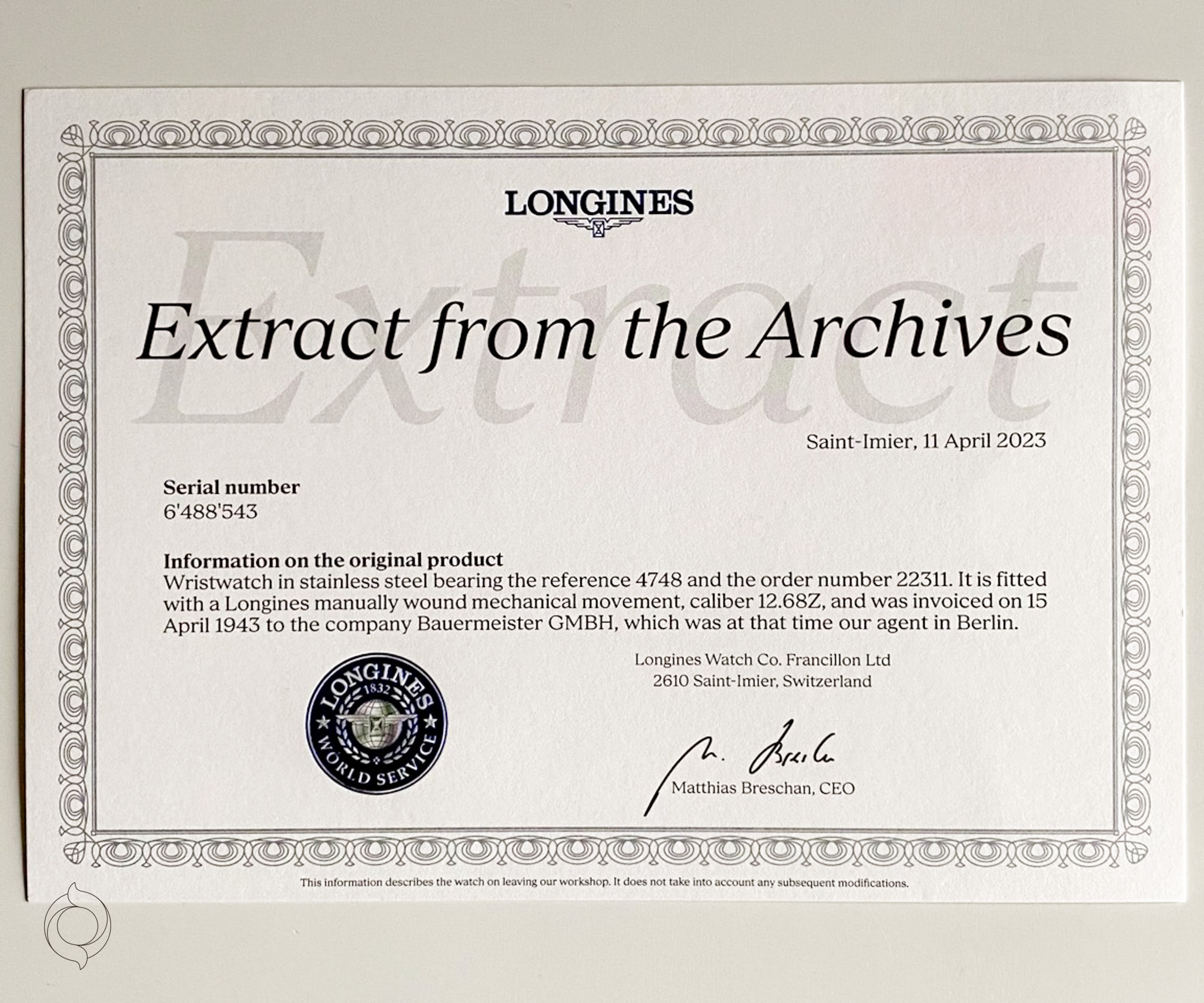 Very good, with LONGINES archive extract