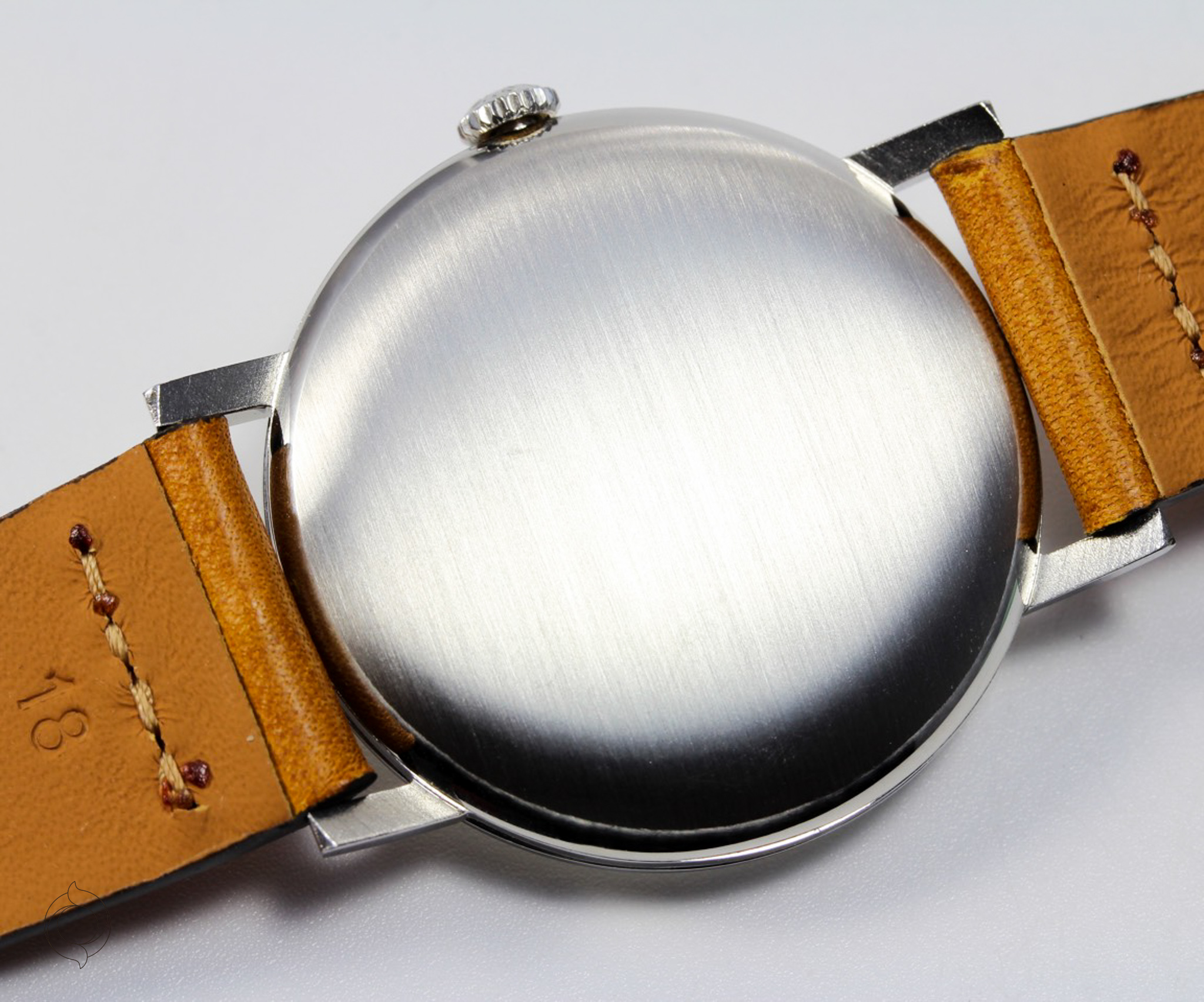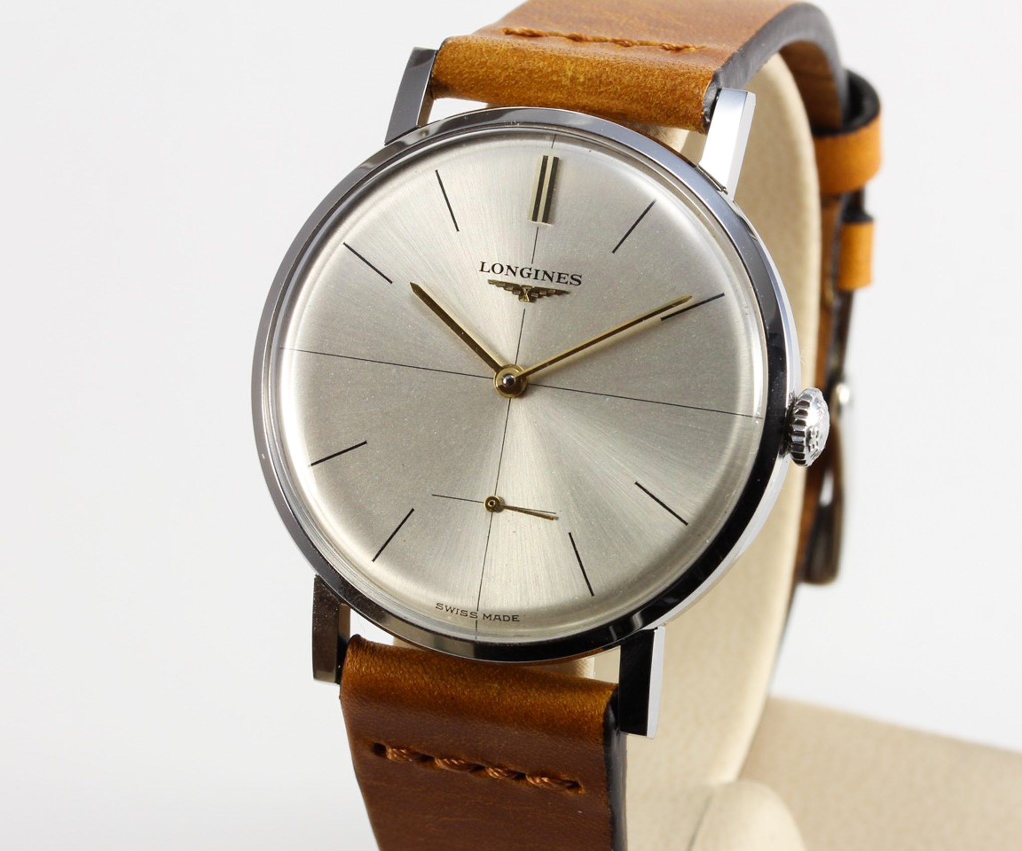 Untreated original silver, sunburst, crosshairs, applied hour-markers and Longines logo, lance hands, small second hand