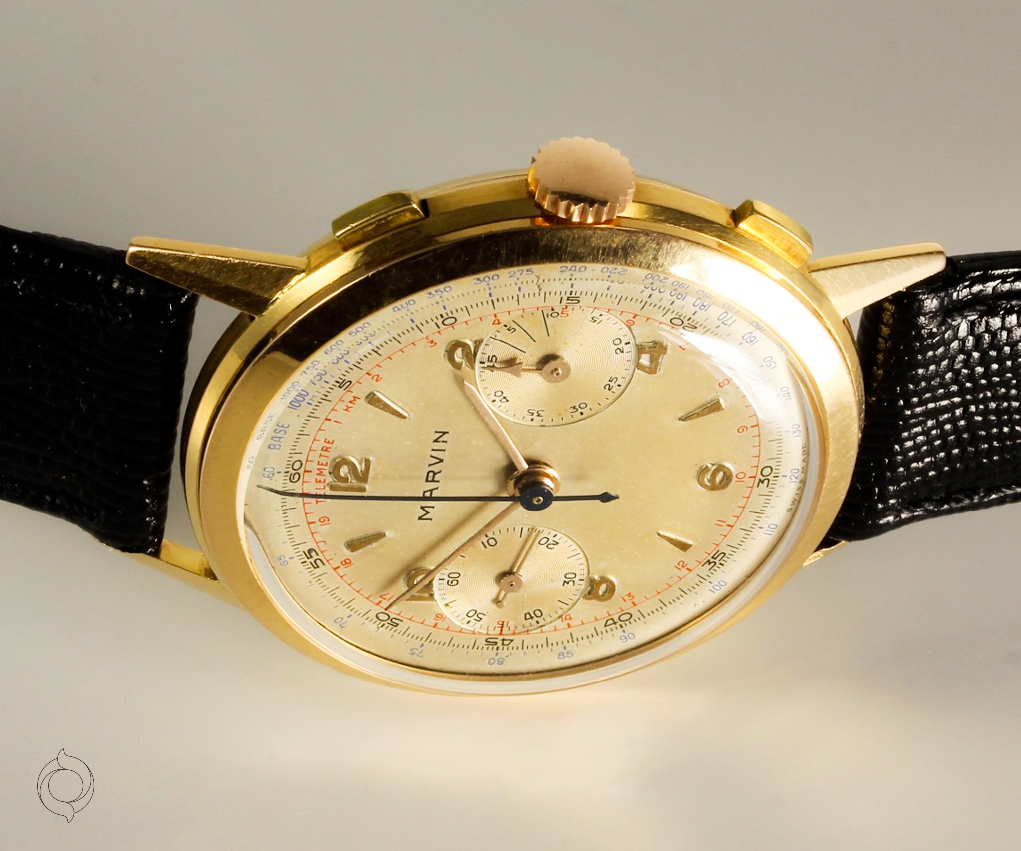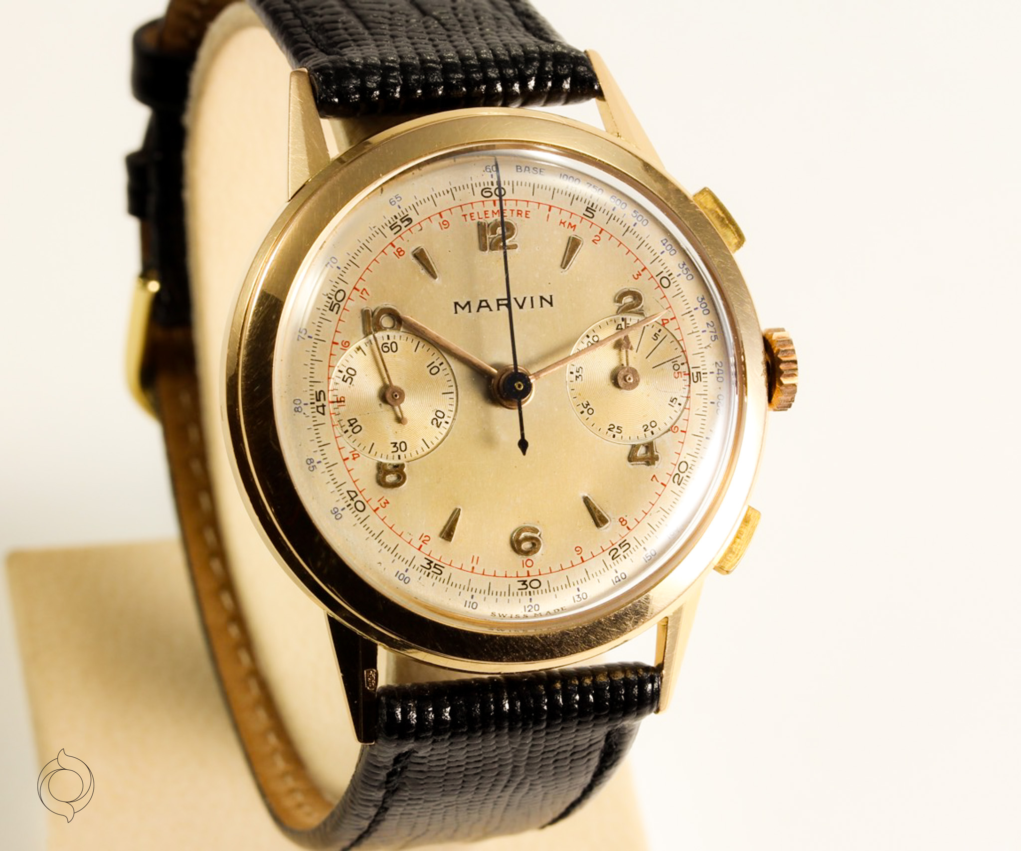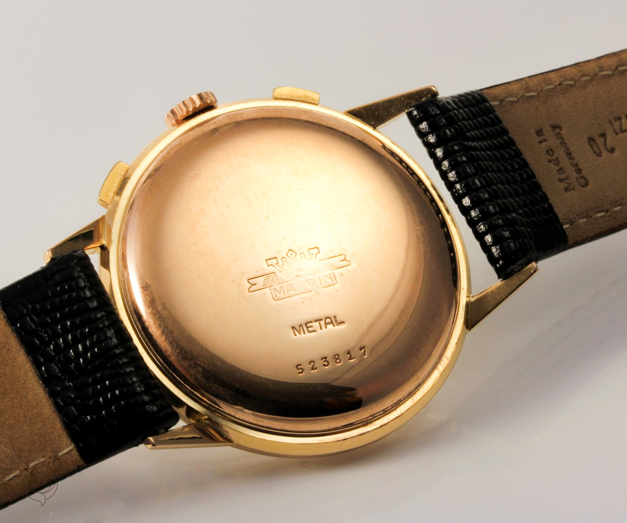Impressive MARVIN Vintage Chronograph extra large 18K gold case 40 mm, gold hallmark on lug, weight 47.4 g, additional dust cover, manual winding caliber Valjoux 22, untreated original in very good condition! Dial, case and movement are signed MARVIN Accessories: WARRANTY CARD, SCHÖNE SAMMLERUHREN certificate of authenticity, documentation and SCHÖNE SAMMLERUHREN watch box