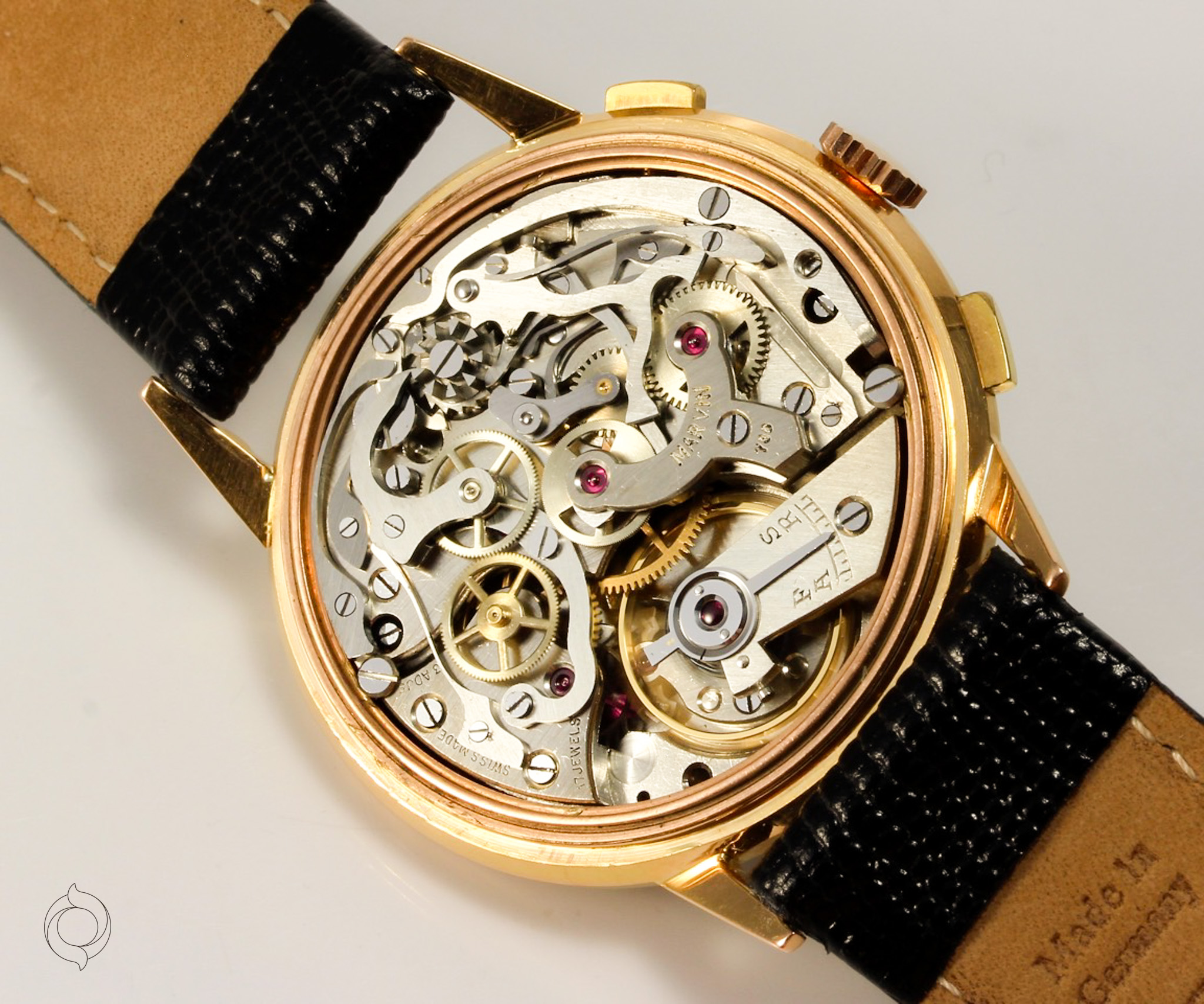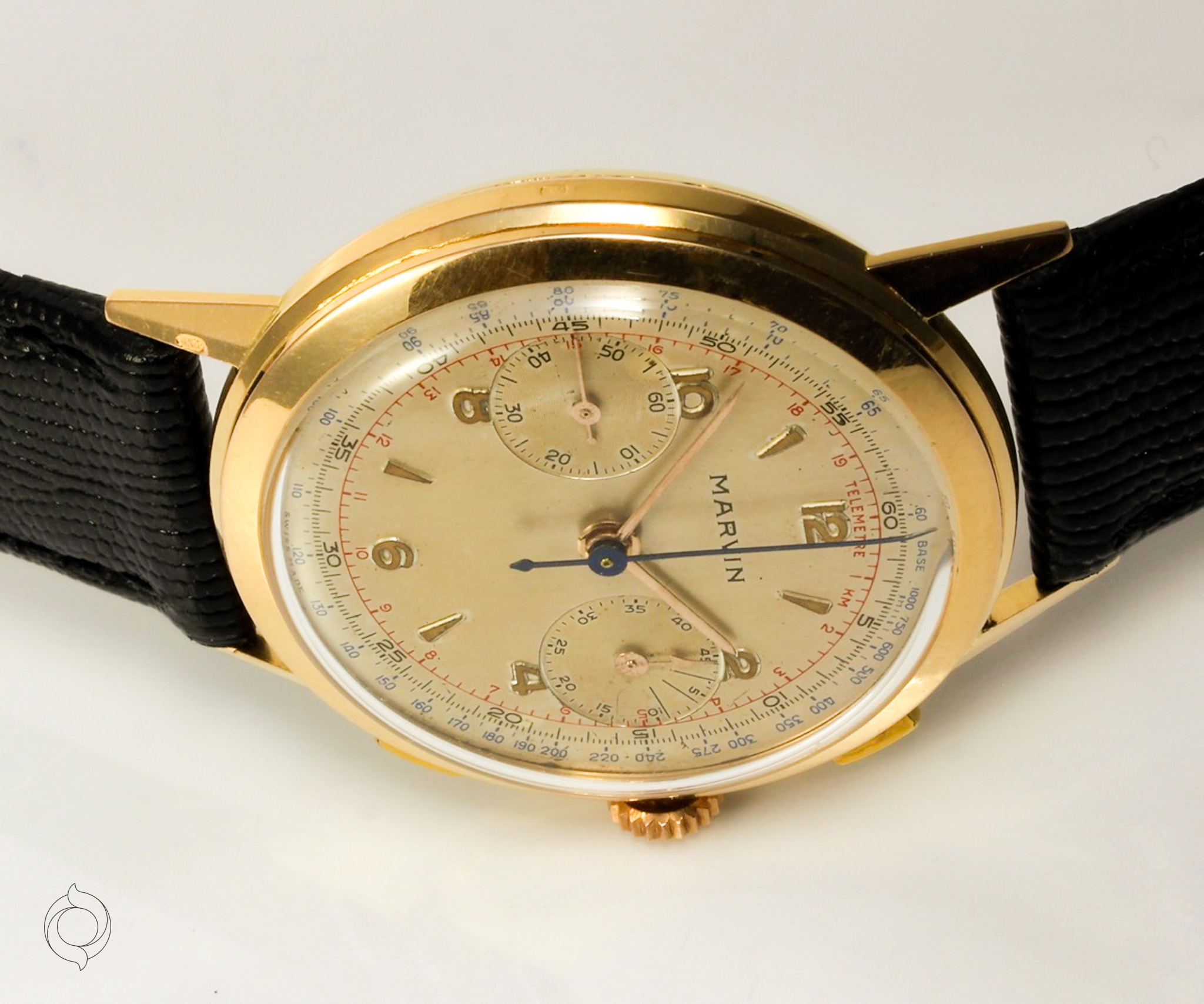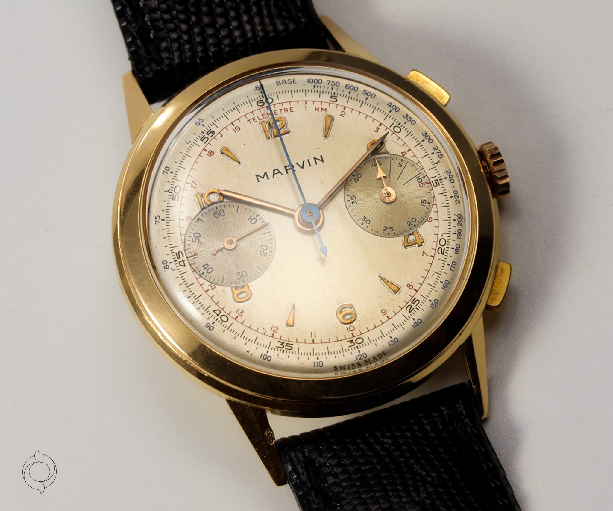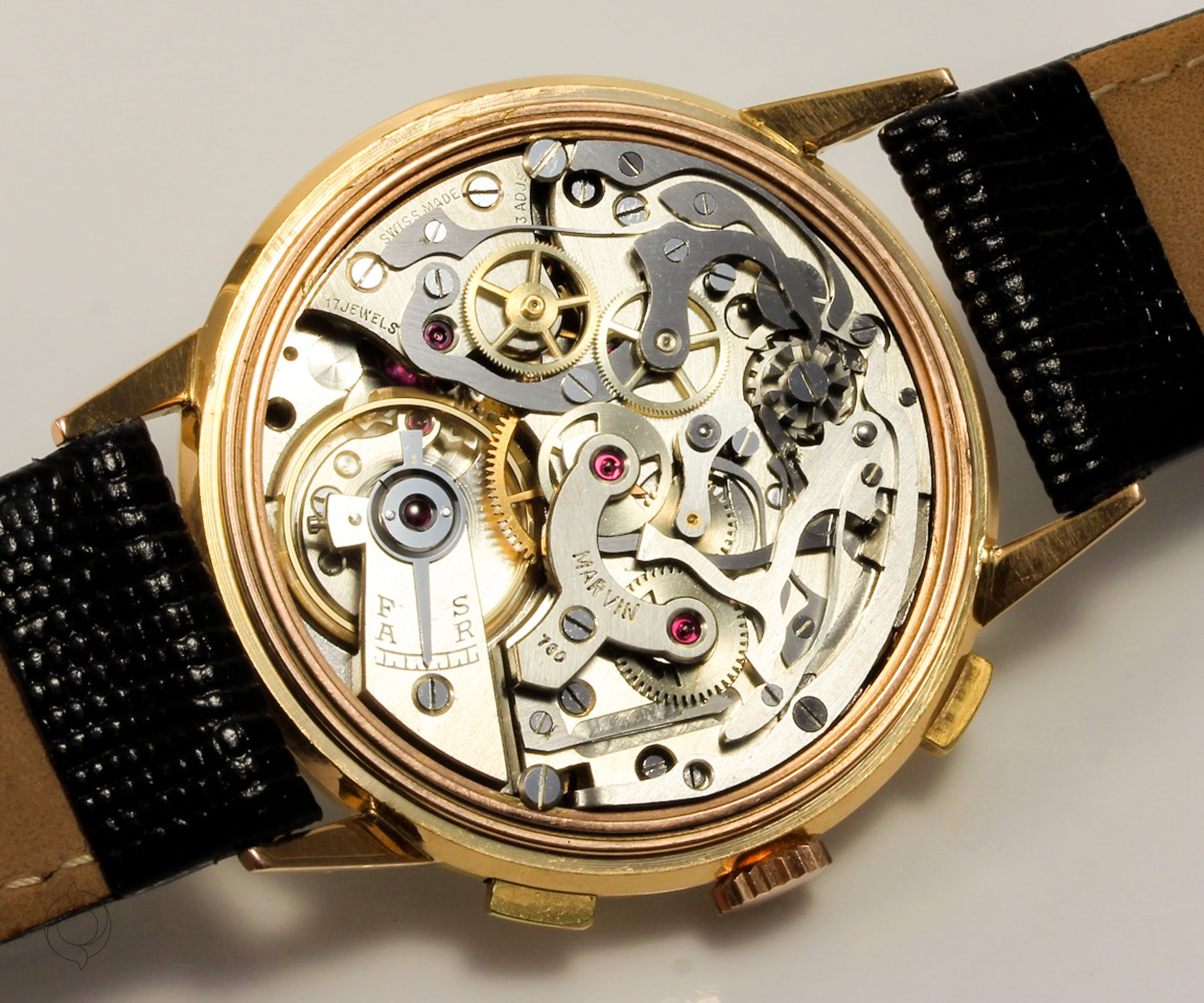 Impressive MARVIN Vintage Chronograph extra large 18K gold case 40 mm, gold hallmark on lug, weight 47.4 g, additional dust cover, manual winding caliber Valjoux 22, untreated original in very good condition! Dial, case and movement are signed MARVIN Accessories: WARRANTY CARD, SCHÖNE SAMMLERUHREN certificate of authenticity, documentation and SCHÖNE SAMMLERUHREN watch box
