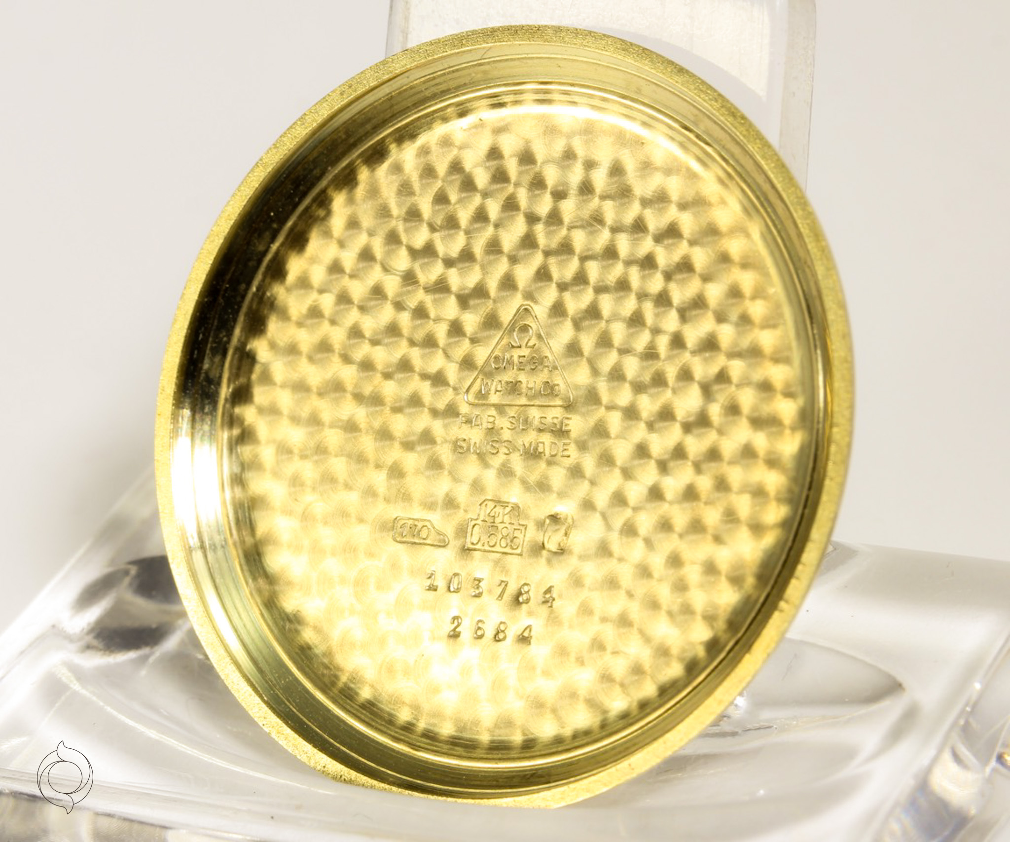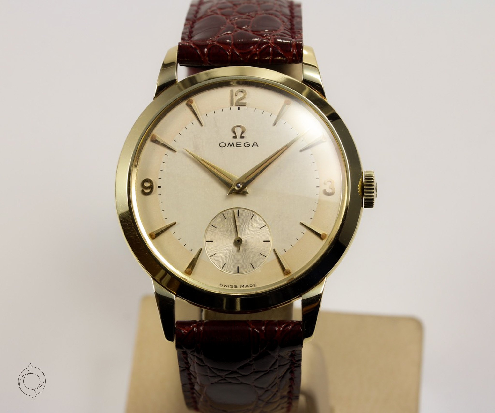 Untreated original two-tone silver, applied Arabic numerals, indexes and Omega logo, luminous hour dots, Dauphine hands with luminous element, minute track, small second