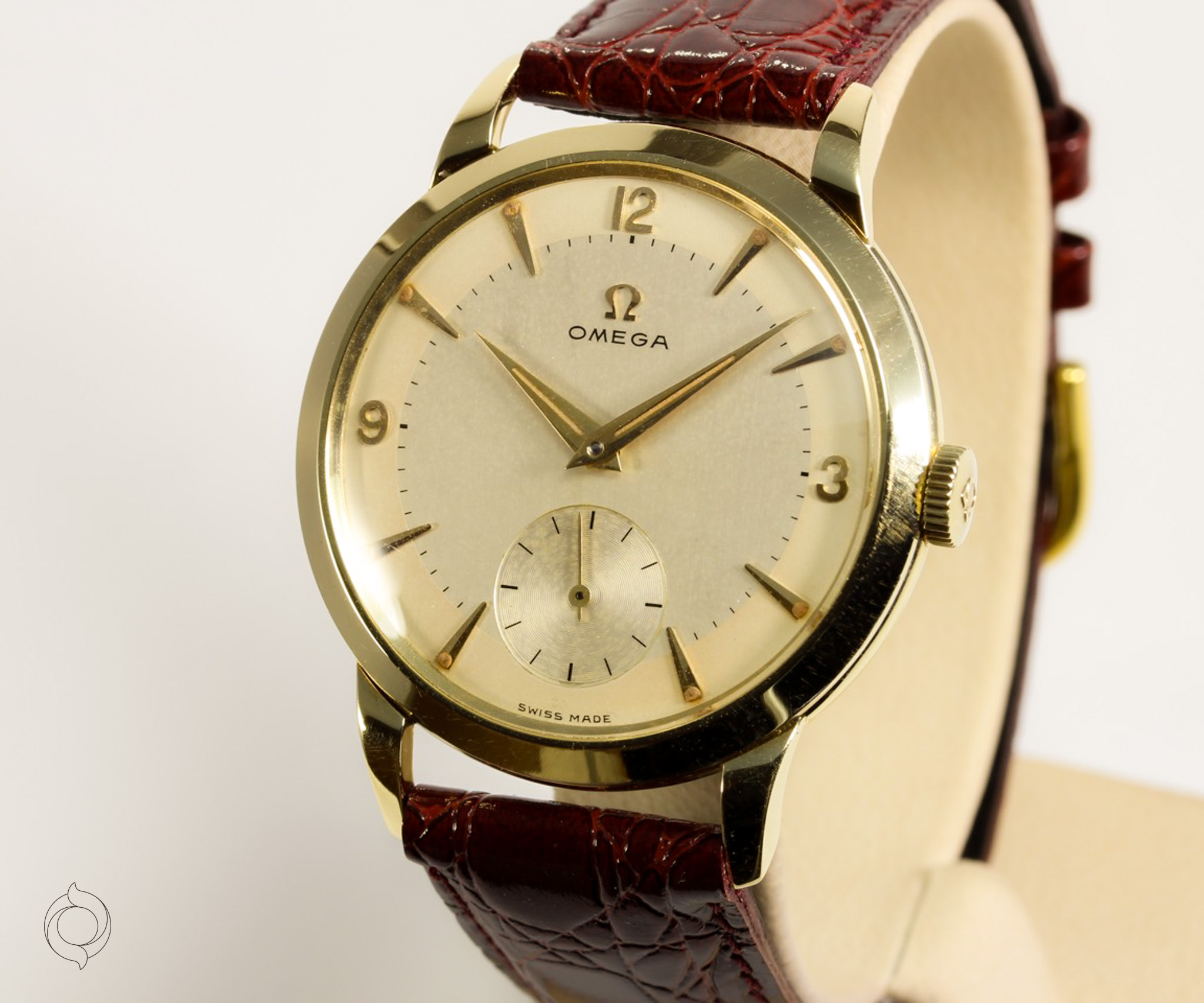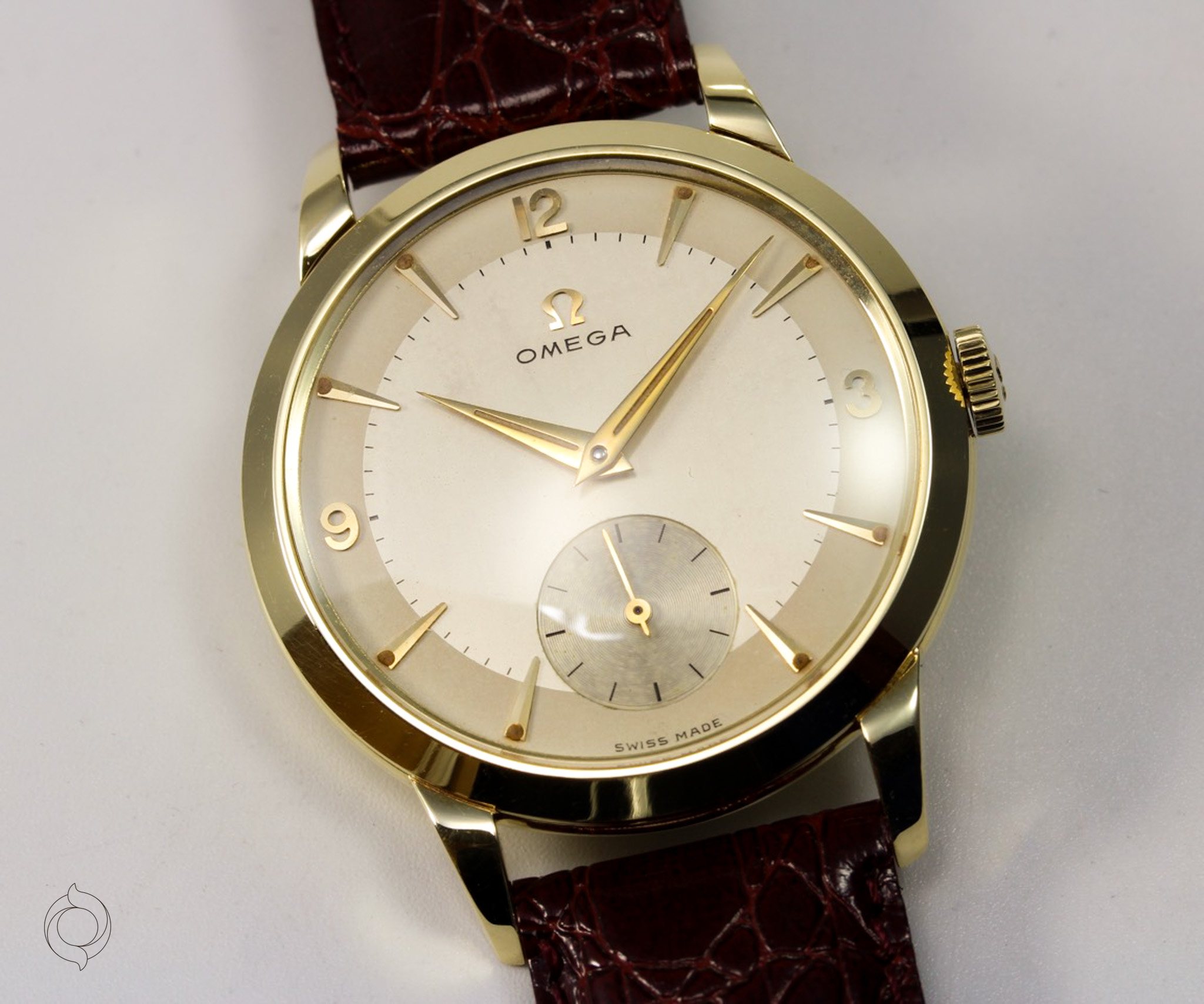 Attractive OMEGA vintage watch large 14K yellow gold case 36 mm, gold hallmarks on case edge and lugs, weight 35.2 g, caliber 266, Ref. 2684, two-tone silver dial, manufactured 1955, untreated original excellent condition! Dial, case, movement and crown are signed Omega Accessories: WARRANTY CARD, SCHÖNE SAMMLERUHREN certificate of authenticity, documentation and SCHÖNE SAMMLERUHREN watch box