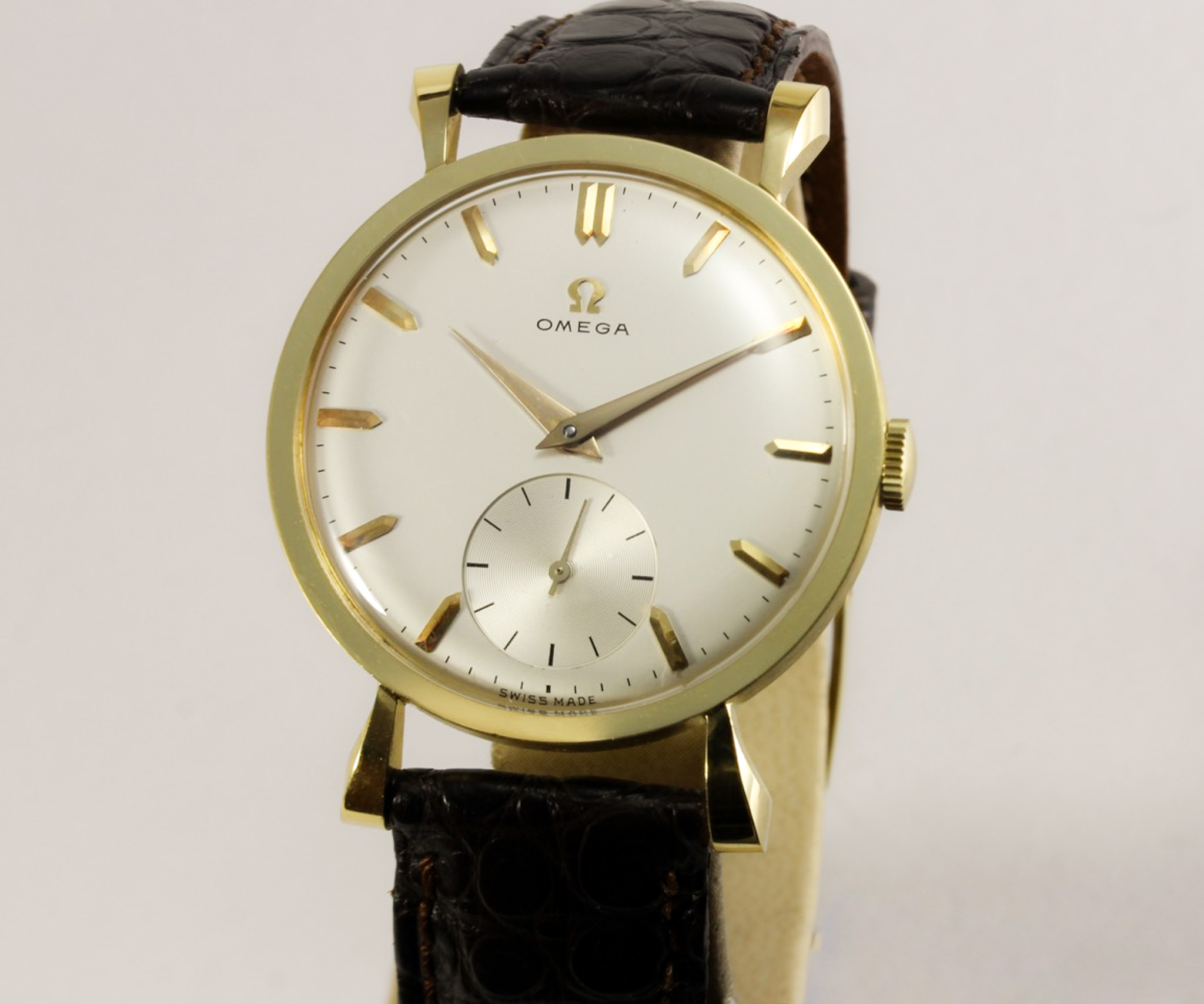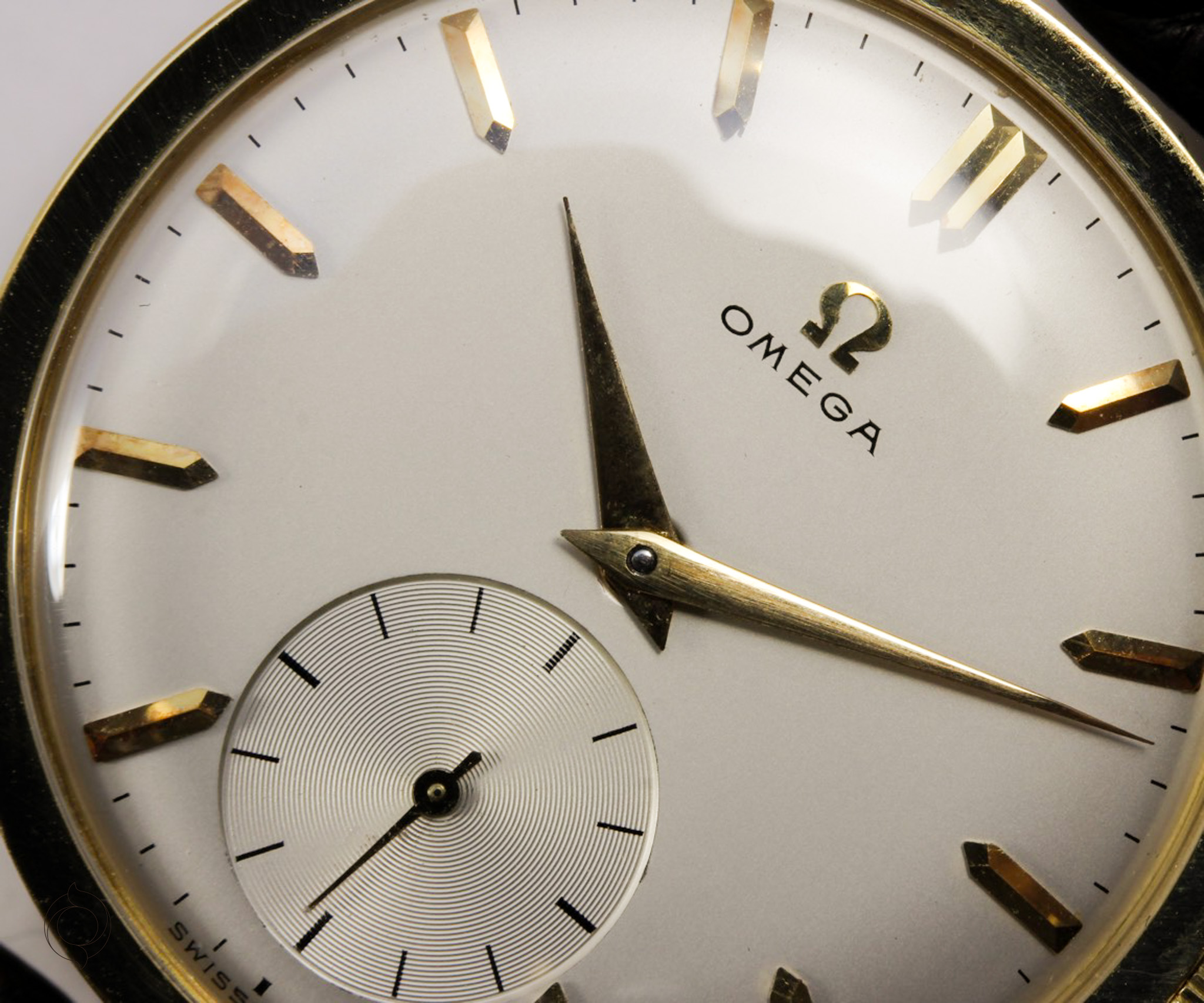 Untreated original, applied indexes and Omega logo, Dauphine hands, minute track, recessed small seconds