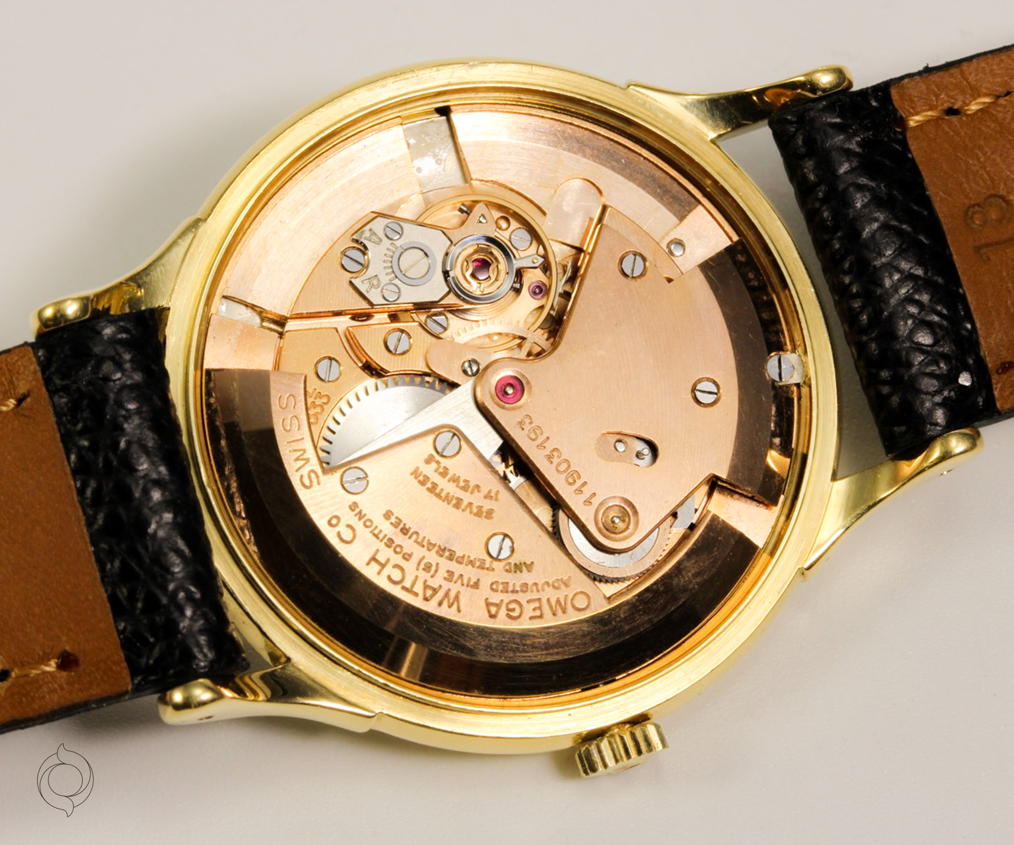 Ivory-colored, professionally refreshed, applied indices and Omega logo, Dauphine hands, minute track, small seconds