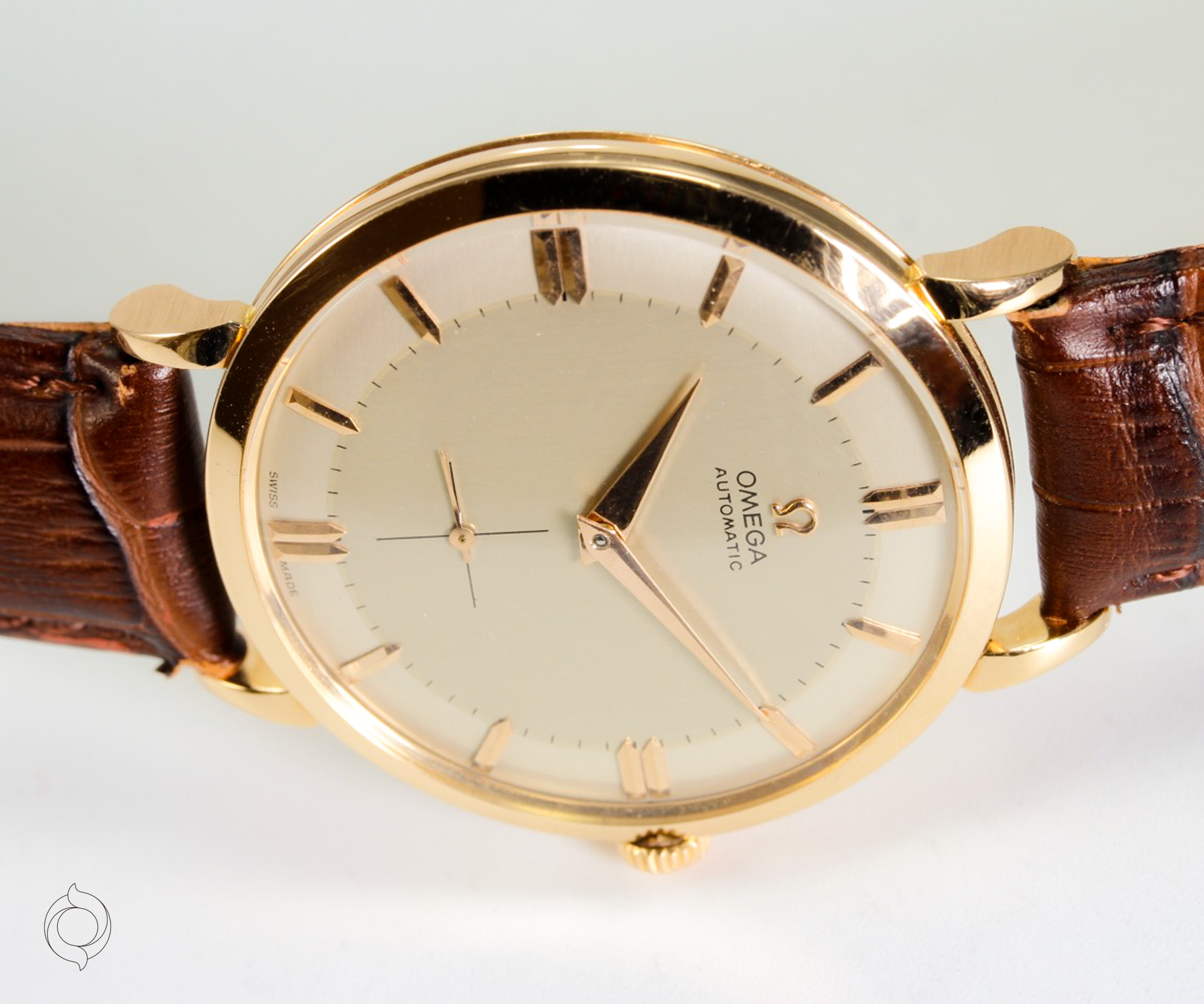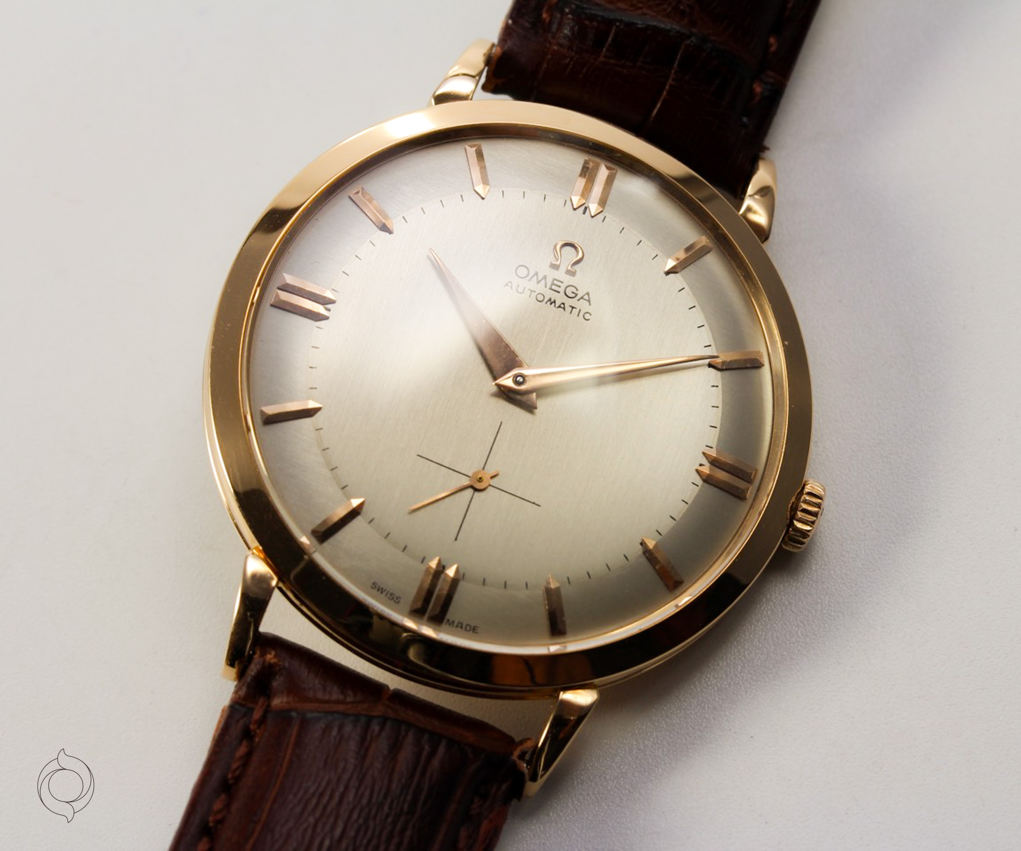 Exclusive OMEGA Dresswatch large 18K rose gold case 38 mm, weight 38.6 g, automatic cal. 332, reference 2618, manufactured 1952, excellent condition, with OMEGA archive extract, OMEGA leather strap and OMEGA clasp! Dial, case, movement, crown, leather strap and clasp are signed Omega Accessories: WARRANTY CARD, OMEGA archive extract, documentation and BEAUTIFUL COLLECTOR'S WATCH BOX