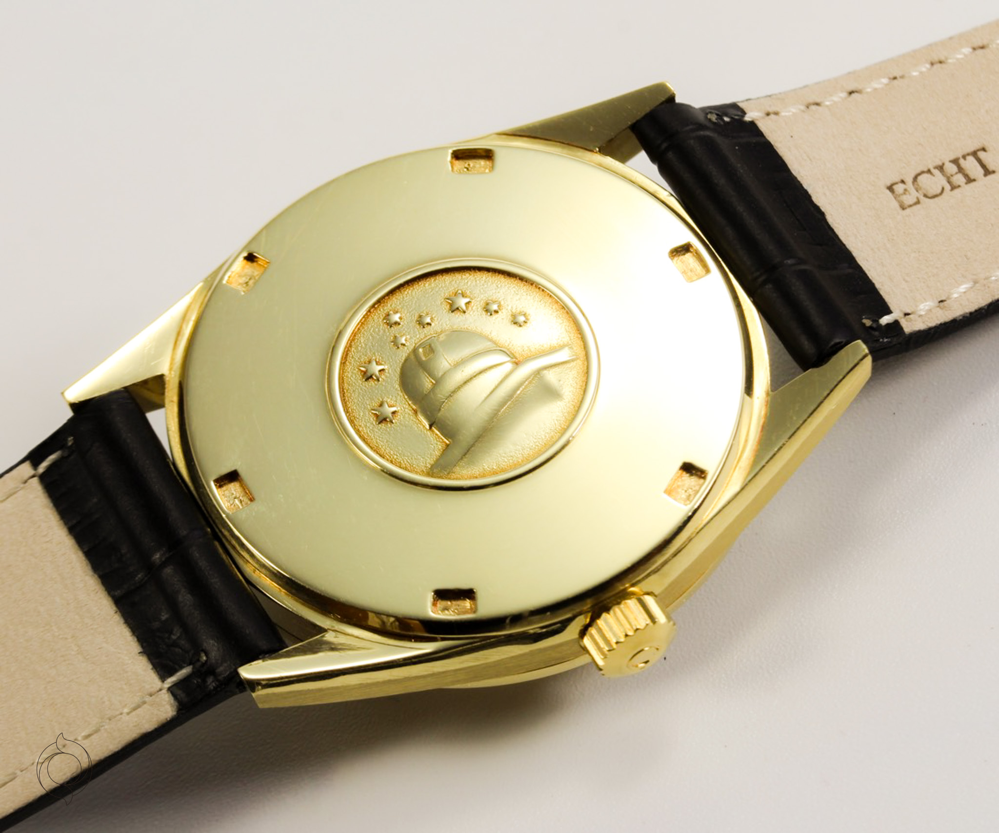 Black leather strap with gold-plated OMEGA buckle (the watch can be supplied with a different or additional strap)