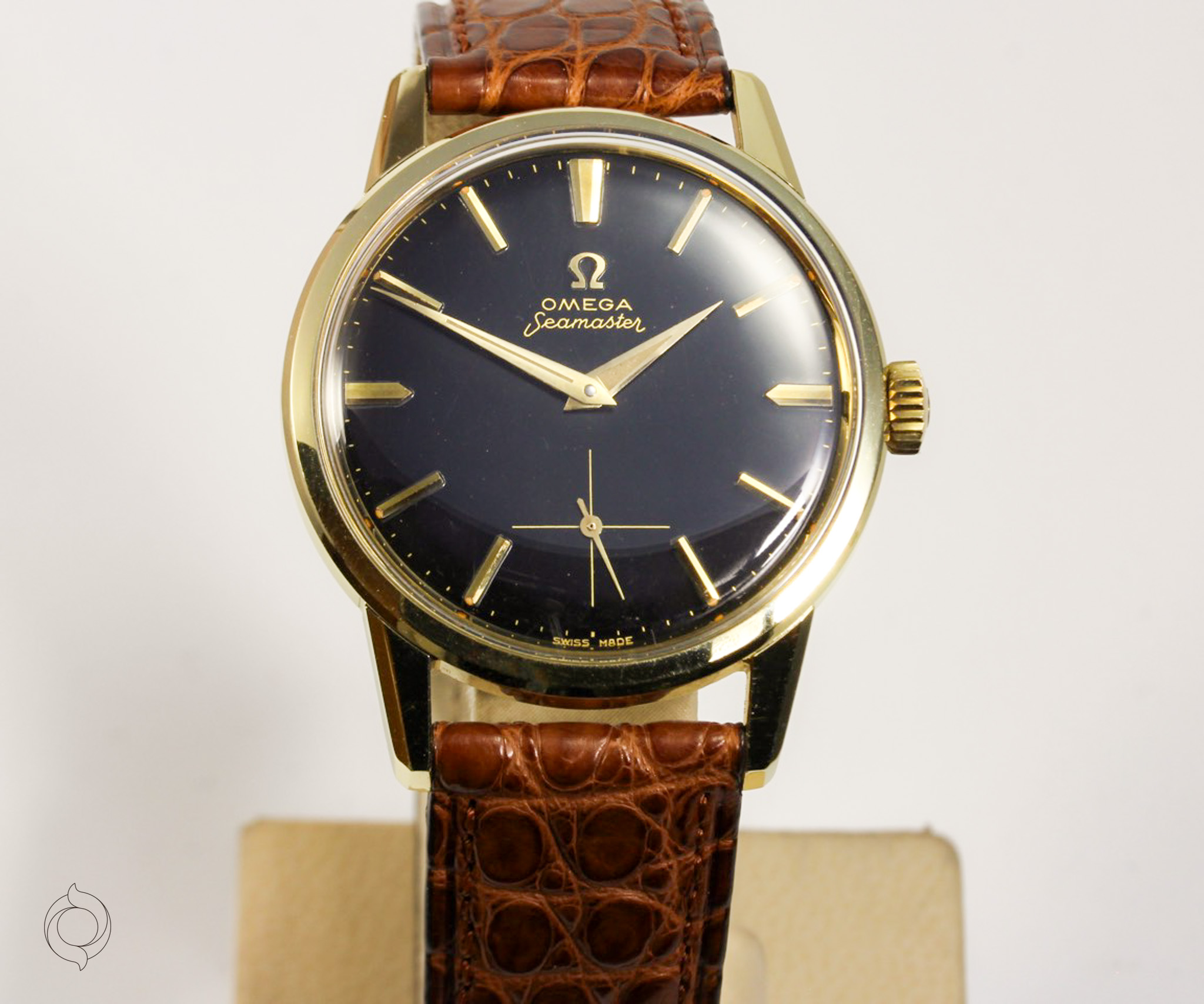 Untreated original black, gilt dial, applied indices and Omega logo, luminous hour markers, Dauphine hands with luminous material, minute track, small seconds in crosshairs