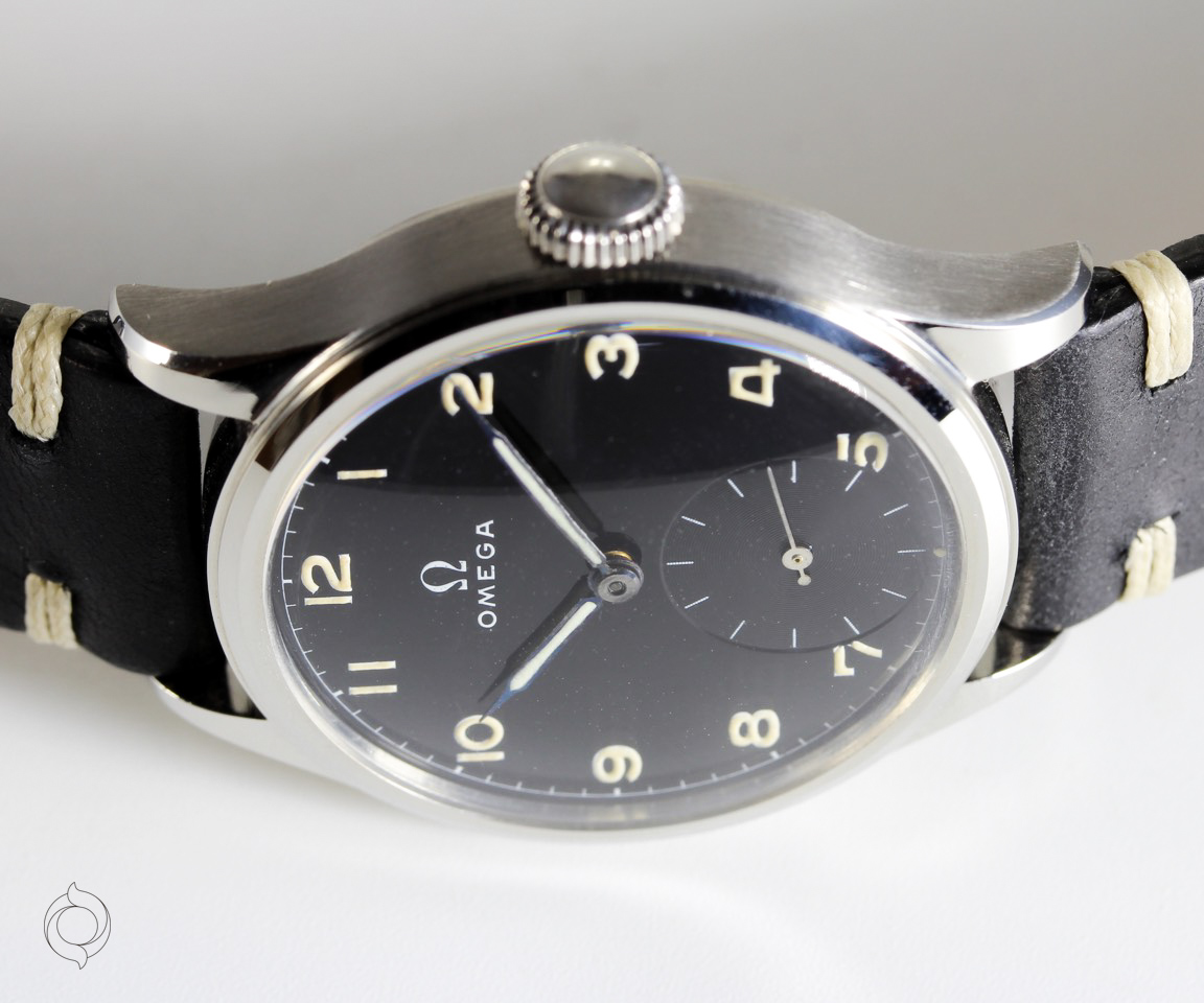 Rare, expressive OMEGA vintage watch, shiny black dial with luminous numerals, no radium!, screw-down case back Tre Secce, manufactured in 1939, caliber 30T2, untreated, original, very good condition! Dial, case, and movement are signed Omega Accessories: WARRANTY CARD, SCHÖNE SAMMLERUHREN certificate of authenticity, documentation, and SCHÖNE SAMMLERUHREN watch box