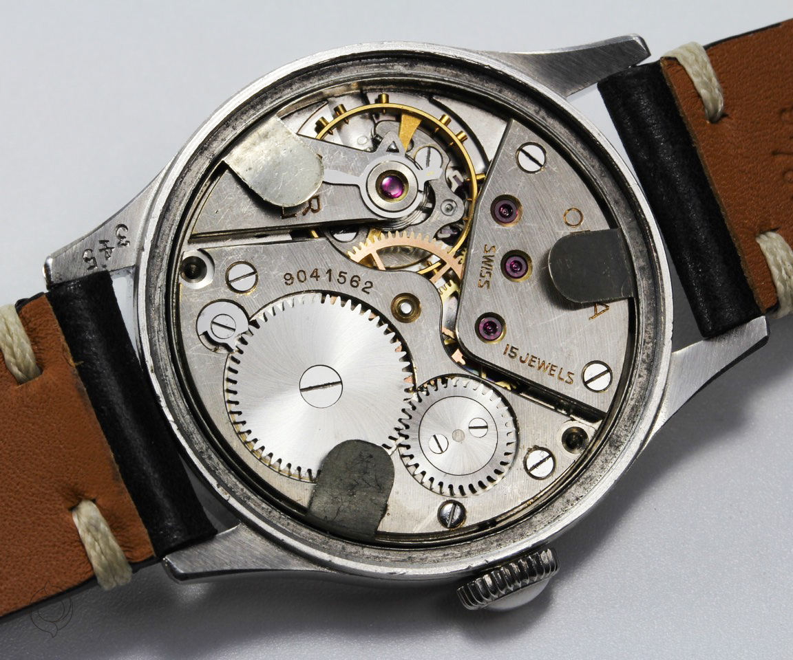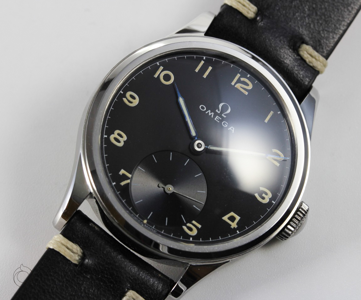 Untreated original glossy black, Arabic luminous numerals, blued hands with luminous material, no radium!, minute track, small seconds