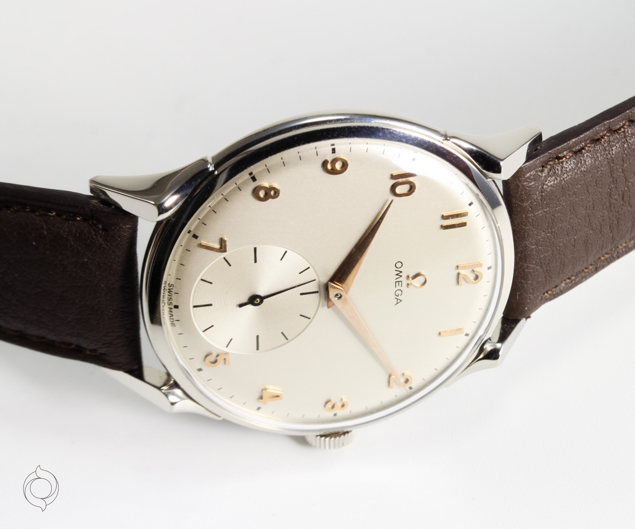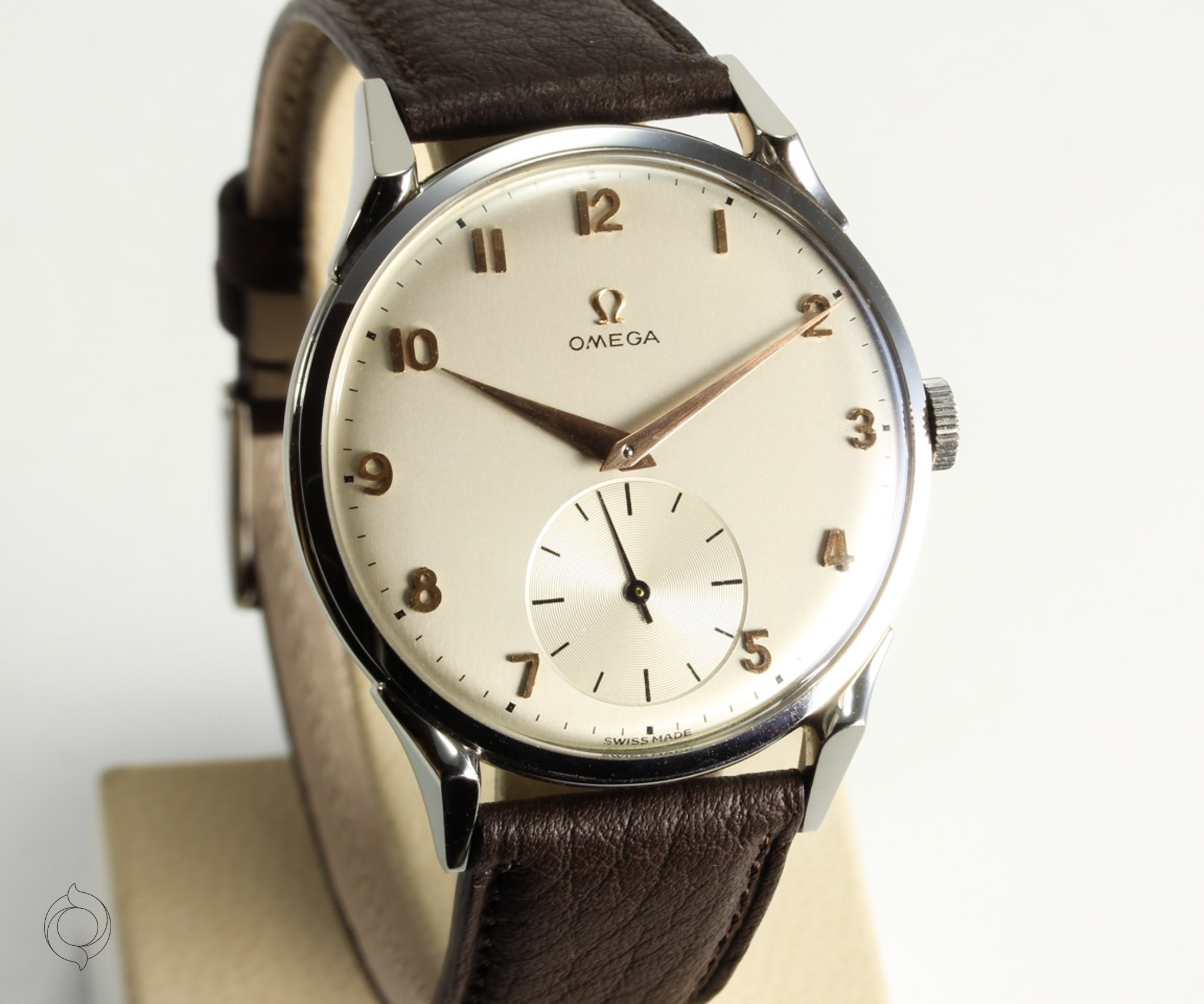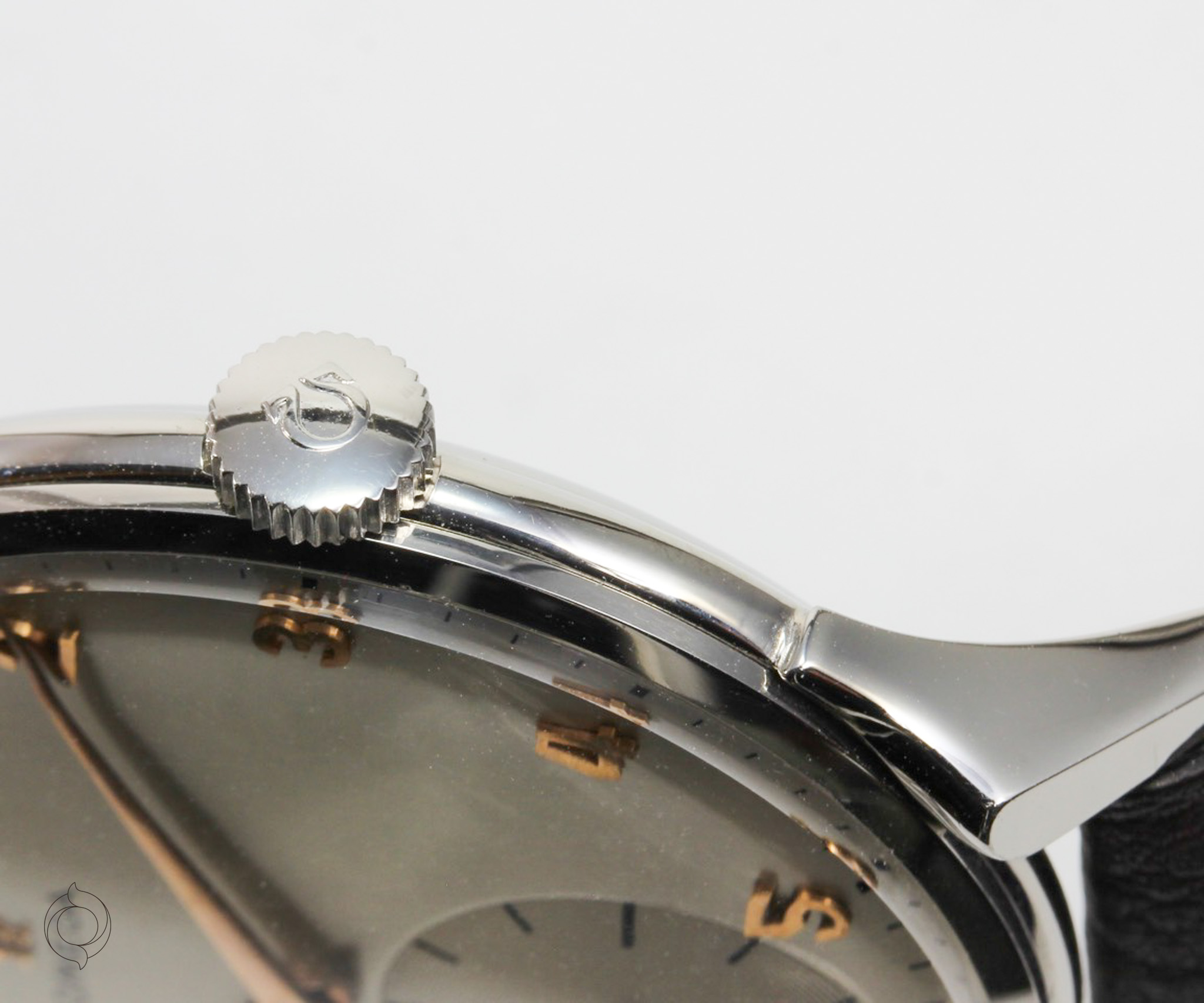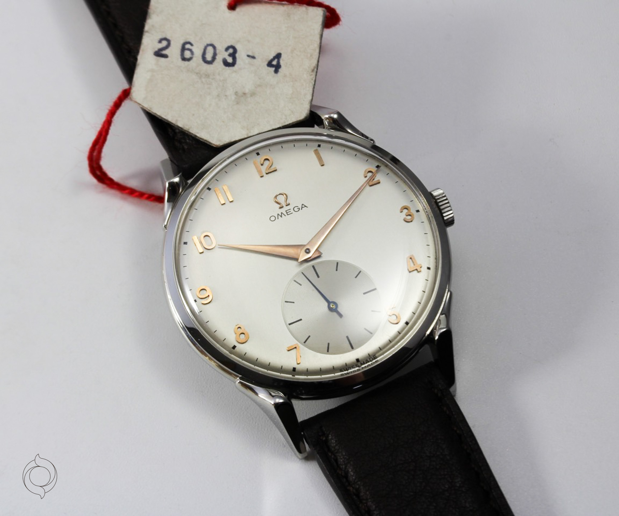 Exklusive seltene OMEGA Anzuguhr extra großes Edelstahl Gehäuse 38 mm, spezielle Bandanstöße (Grashopper Lugs), Referenz 2603-4, Kaliber 266, Herstellung 1953, unbehandelt original exzellent erhalten, mit Original OMEGA Verkaufsschild und OMEGA Box! Zifferblatt, Gehäuse, Werk, Krone, Schließe, Original-Label und Box sind OMEGA signiert Zubehör: GARANTIEKARTE, SCHÖNE SAMMLERUHREN Echtheitszertifikat, Dokumentation und OMEGA Uhrenbox