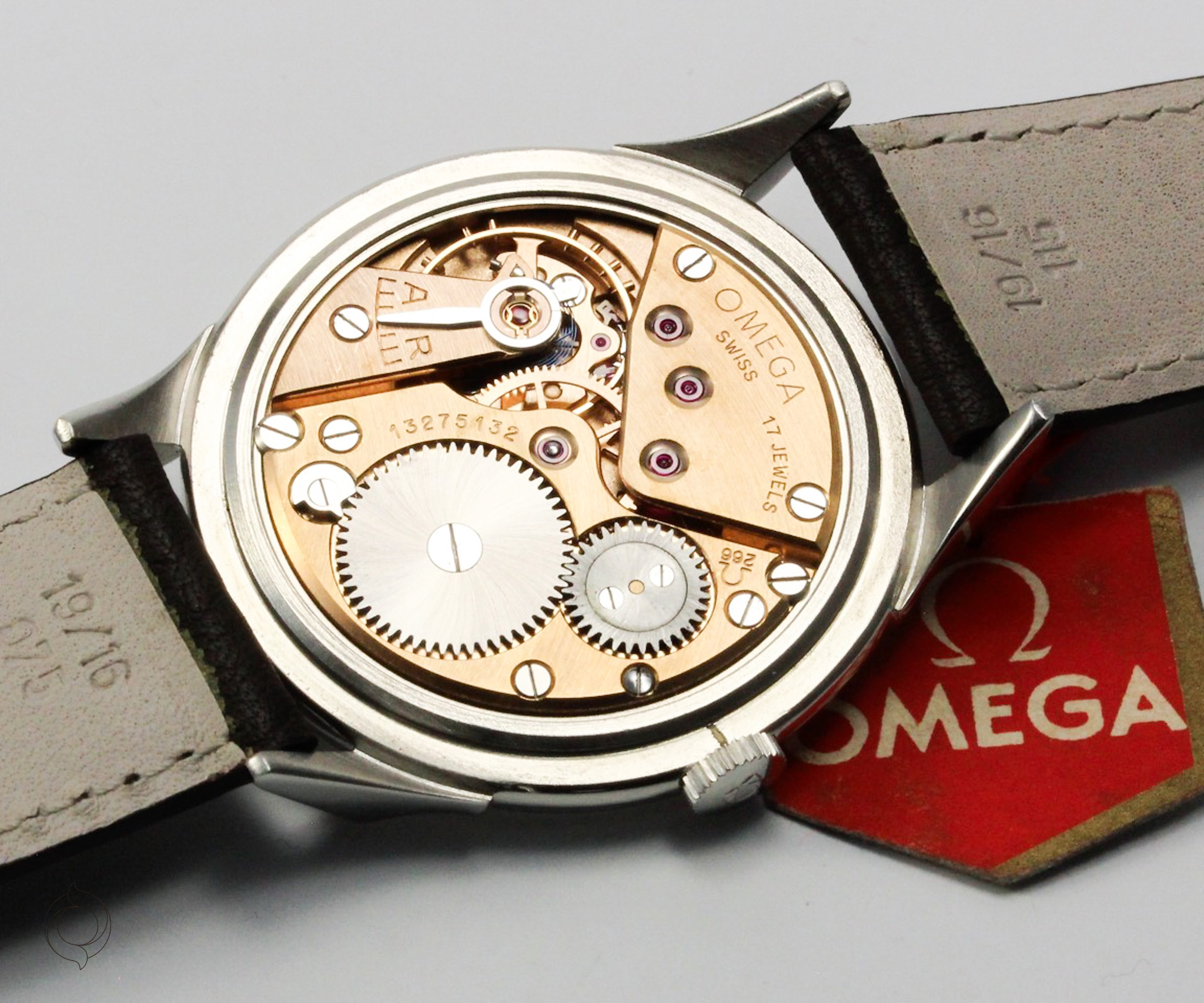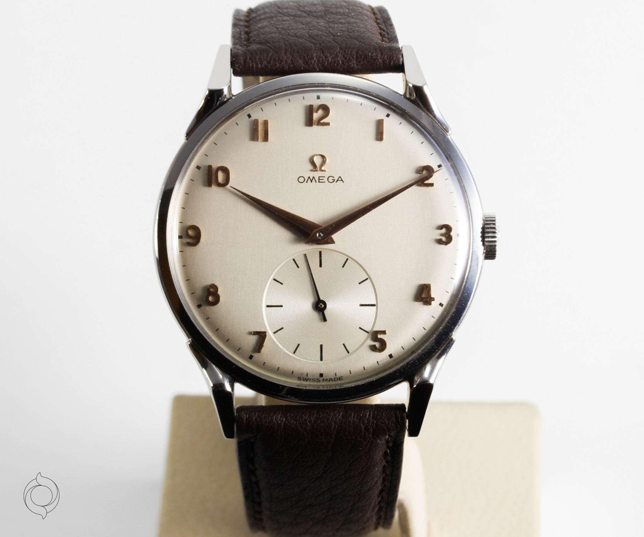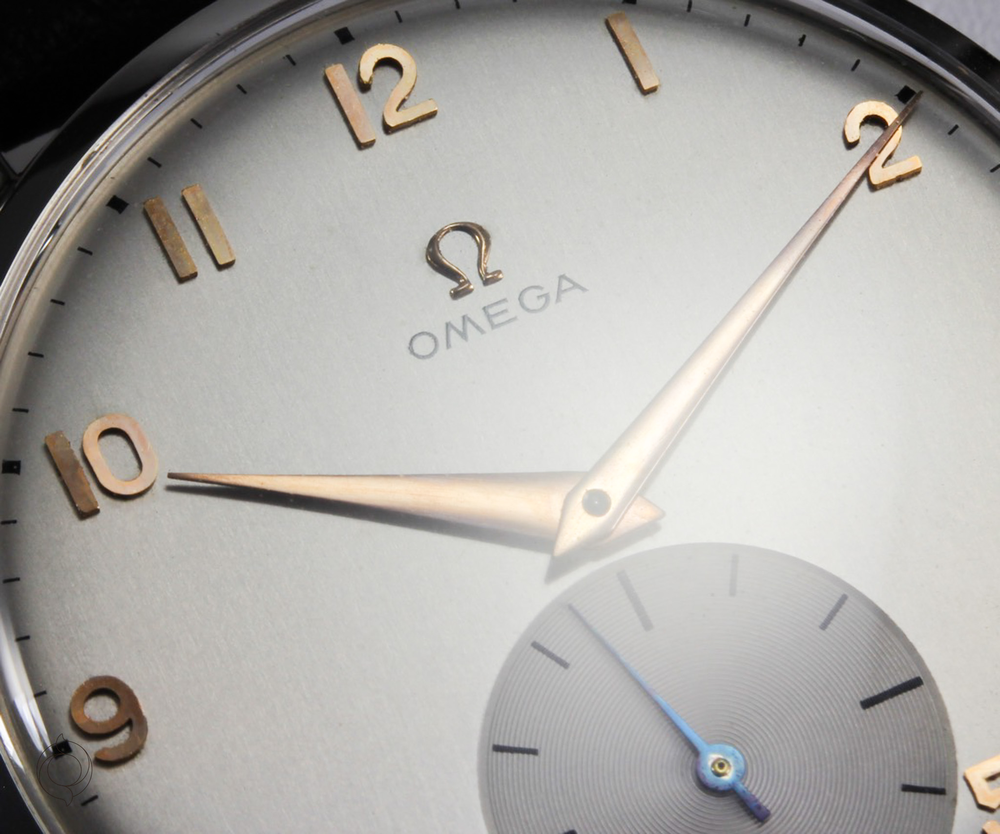 Unbehandelt original, aufgelegte arabische Zahlen und Omega Logo, Dauphine Zeiger, Minuterie, kleine Sekunde, gebläuter Zeiger