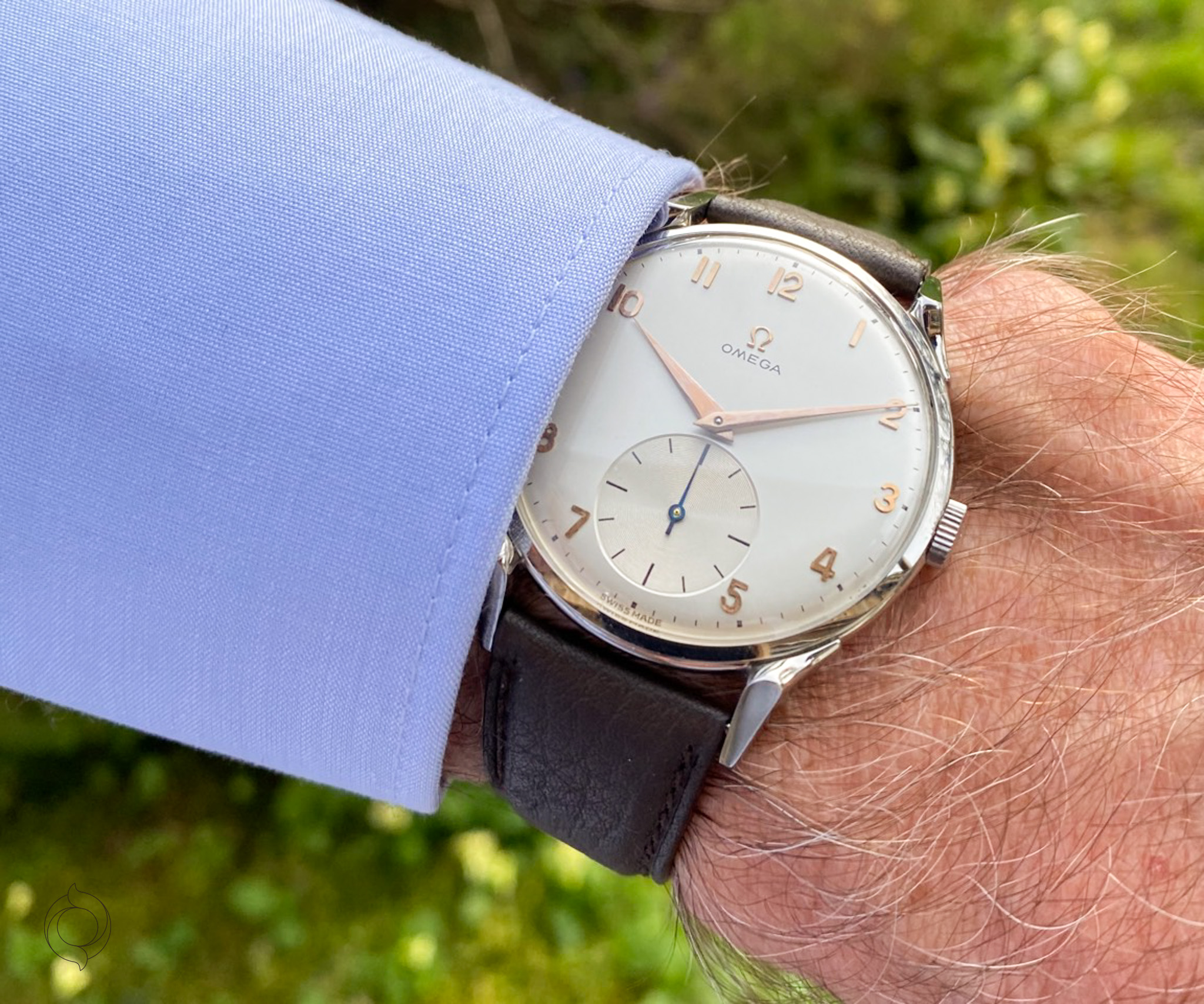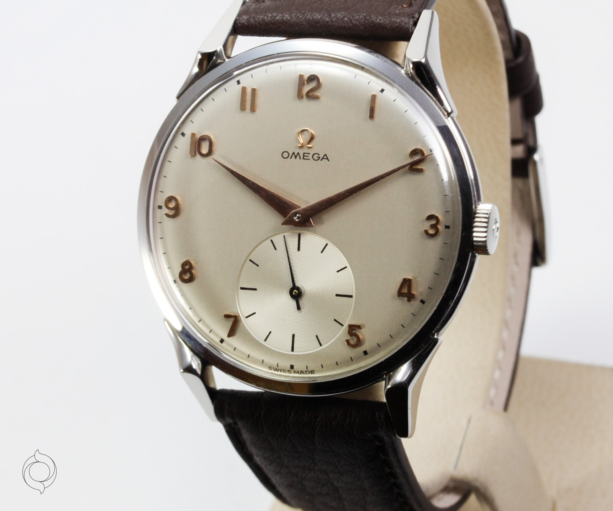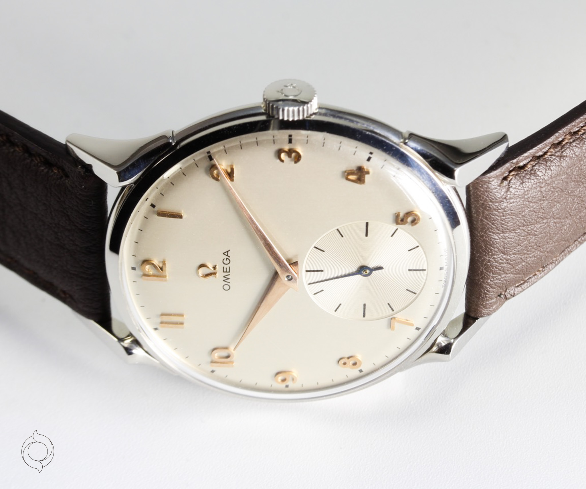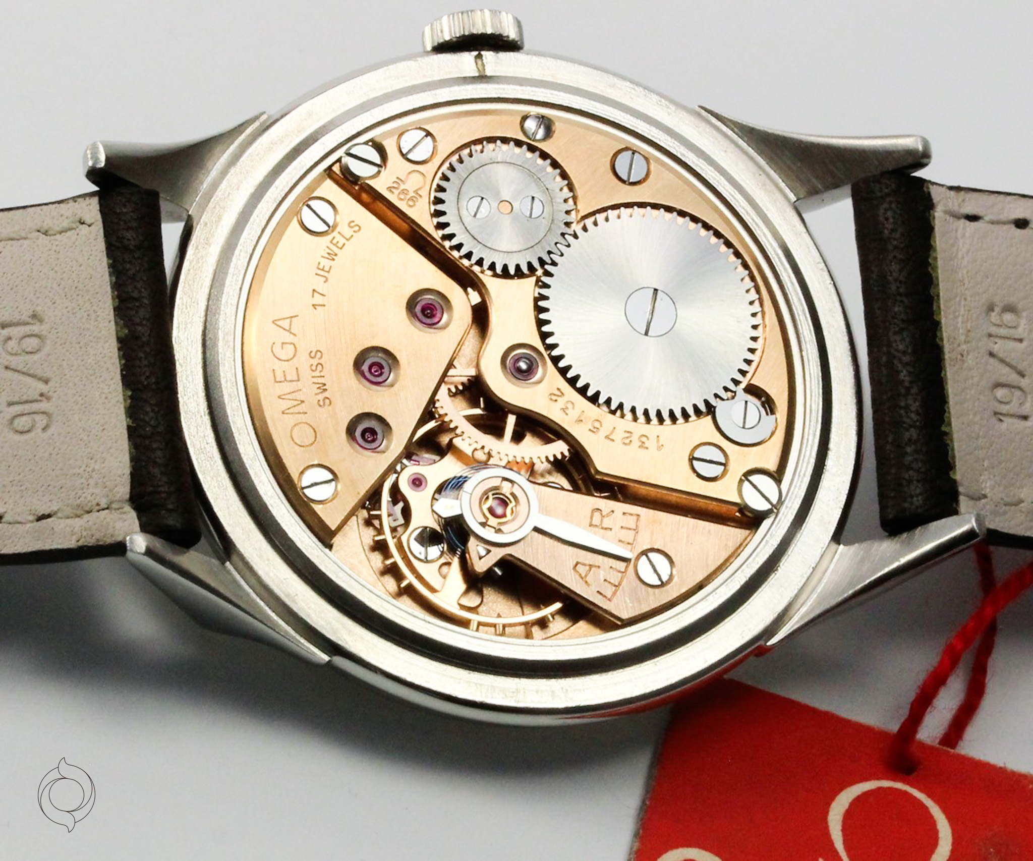 Unbehandelt original, aufgelegte arabische Zahlen und Omega Logo, Dauphine Zeiger, Minuterie, kleine Sekunde, gebläuter Zeiger