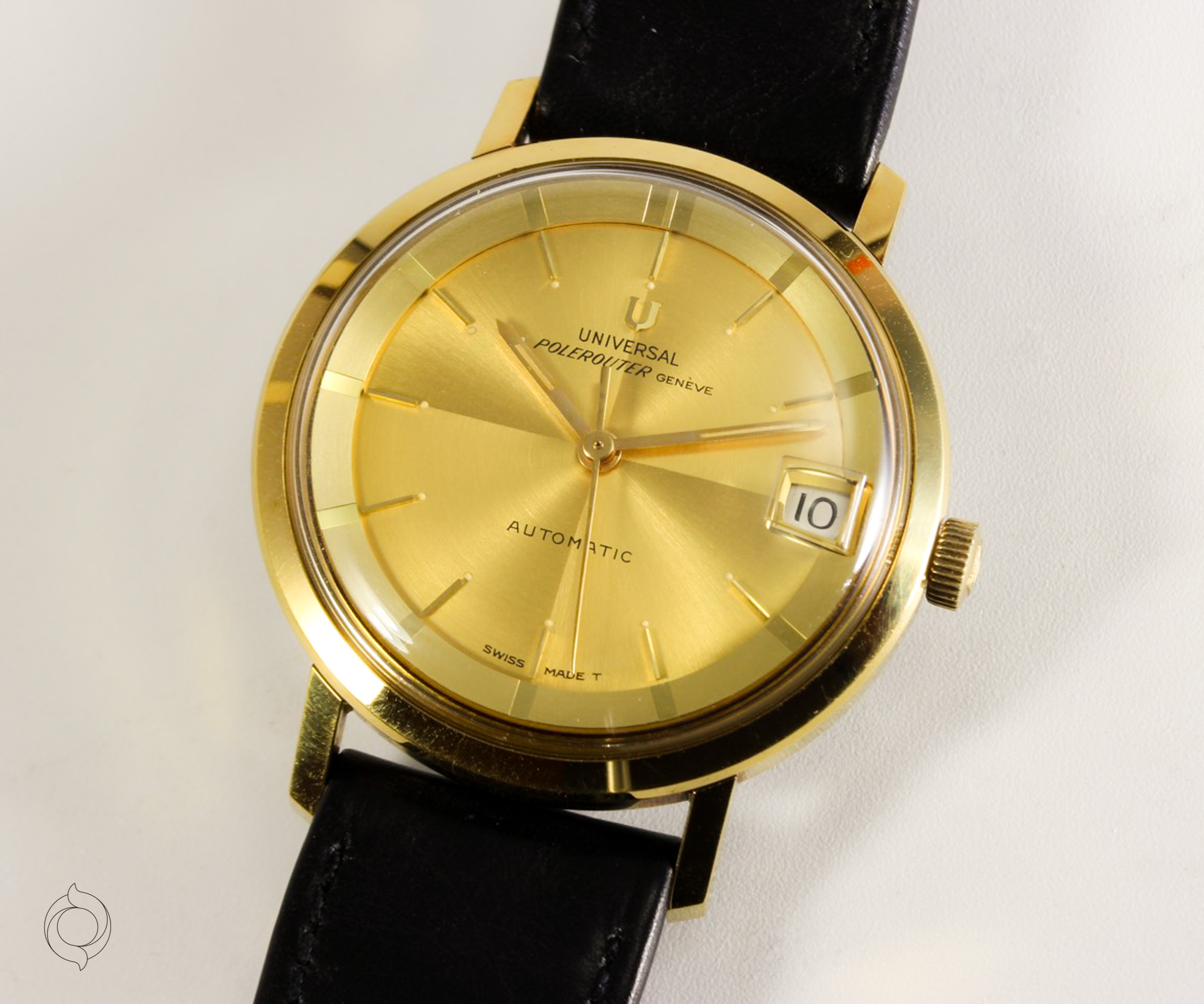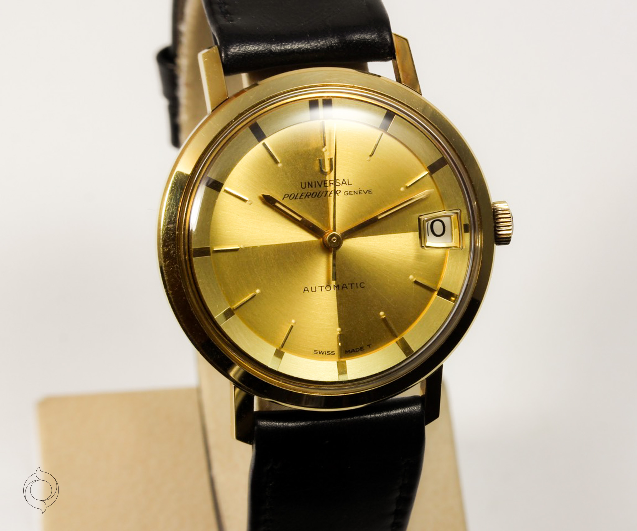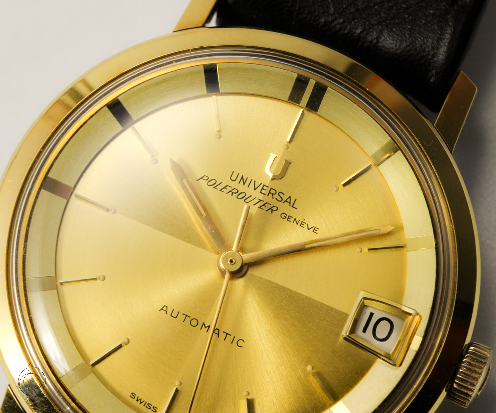Untreated original golden sunburst, applied indices and universal logo, lance hands, date with magnifying glass, center second hand