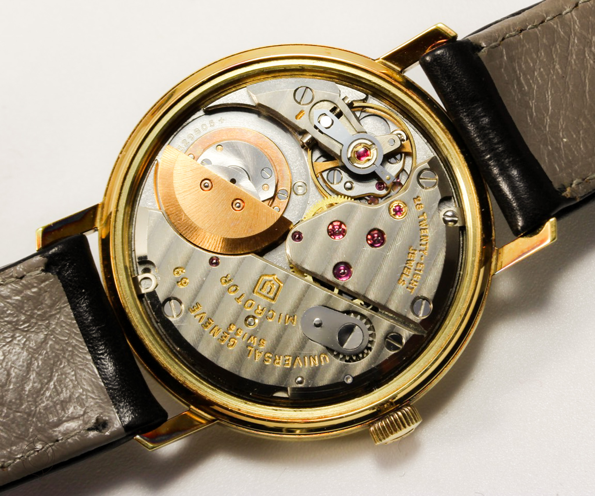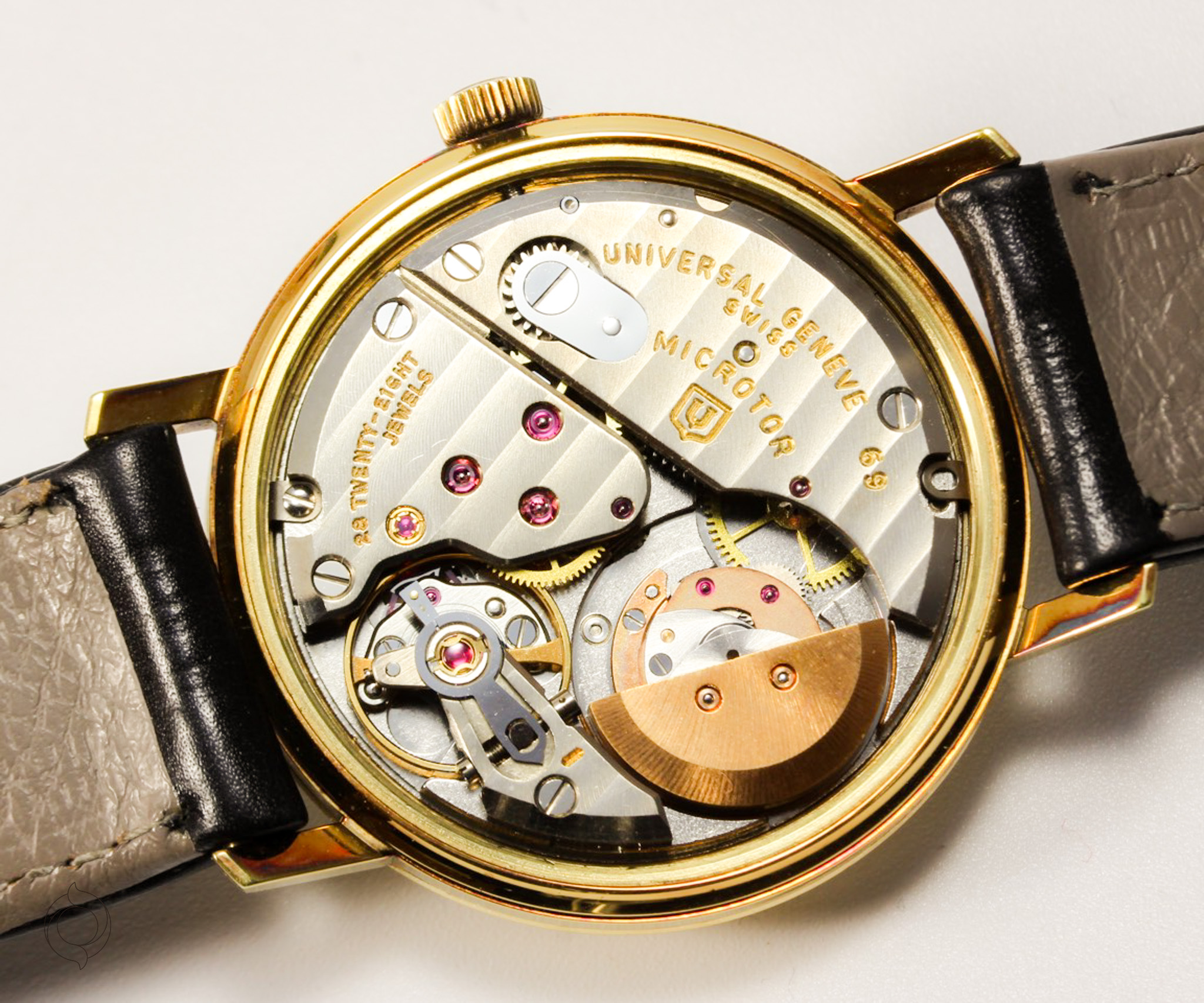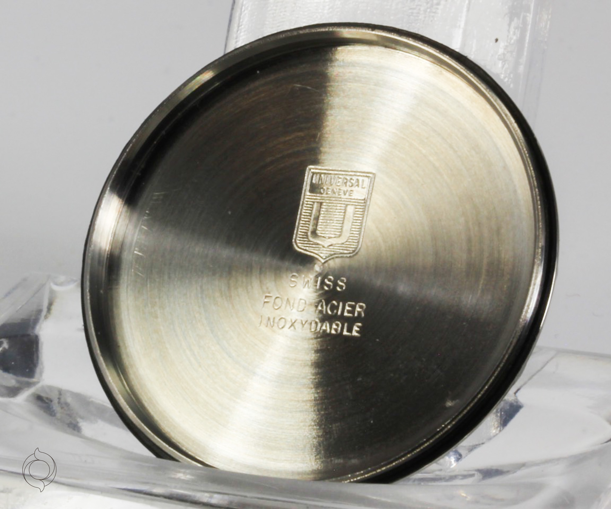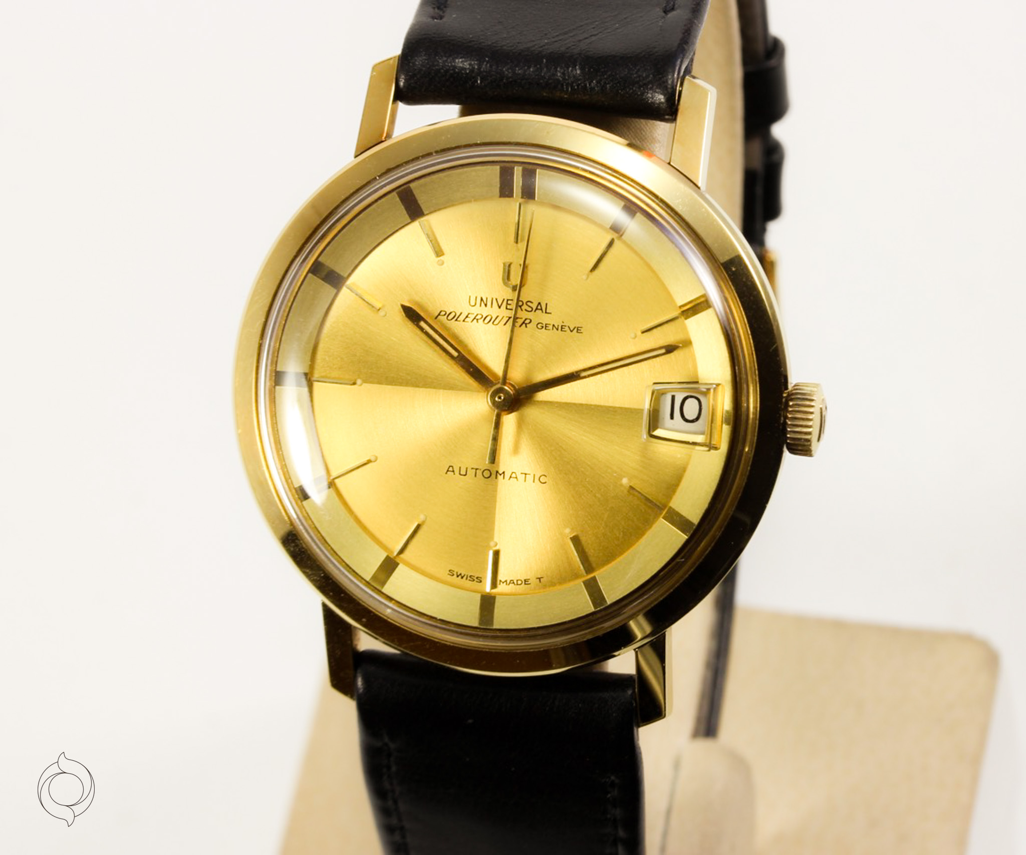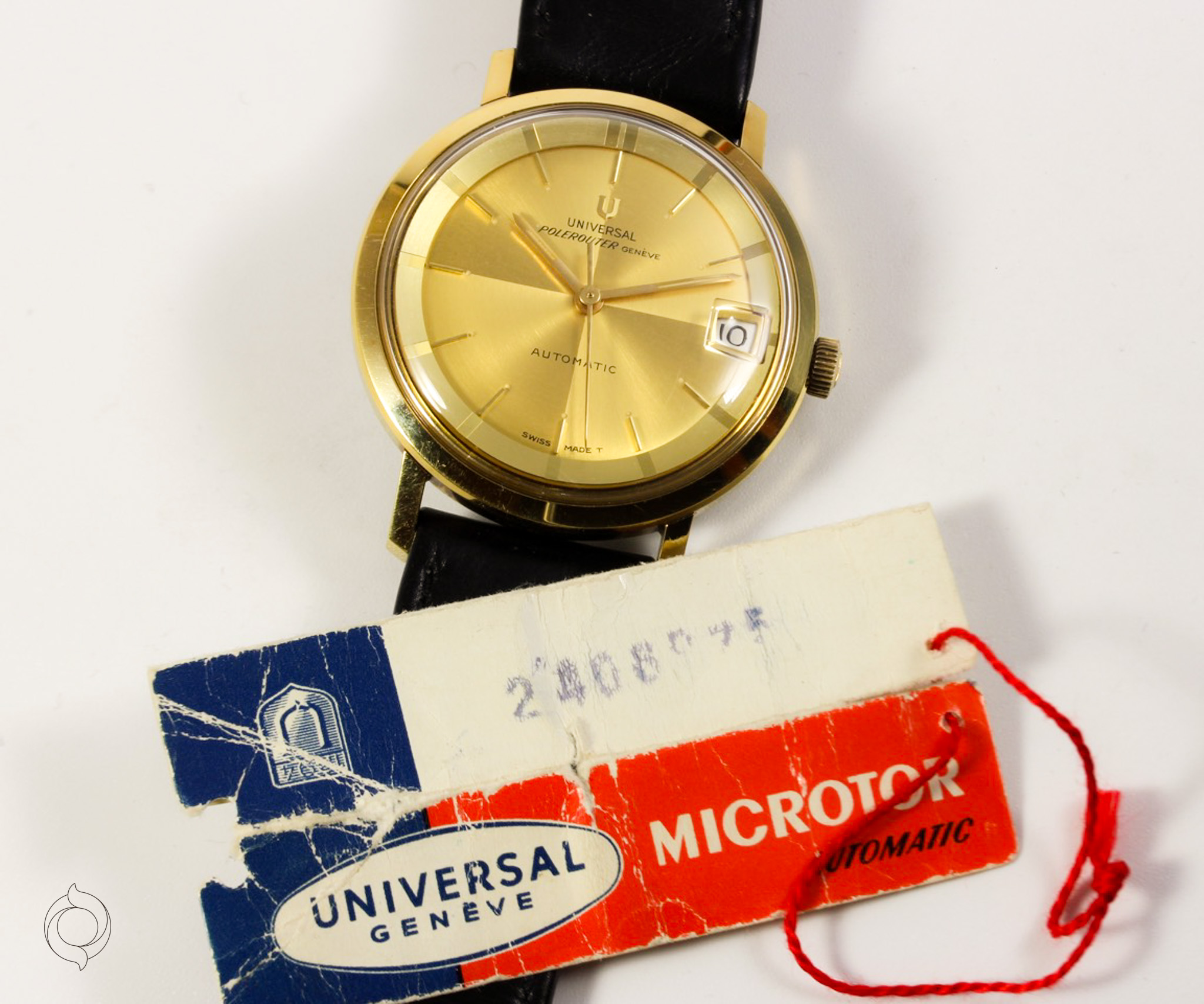 Beautiful UNIVERSAL GENÈVE Polerouter Automatic Microtor, gold steel case, screwed back, made ca. 1963, untreated original excellent condition, with original UG leather strap and UG buckle, sales tag and original UNIVERSAL GENÈVE watch box! Dial, case, movement, crown, strap, buckle and watch box are signed UNIVERSAL GENÈVE Accessories: WARRANTY CARD, SCHÖNE SAMMLERUHREN certificate of authenticity, documentation and UNIVERSAL GENÈVE watch box